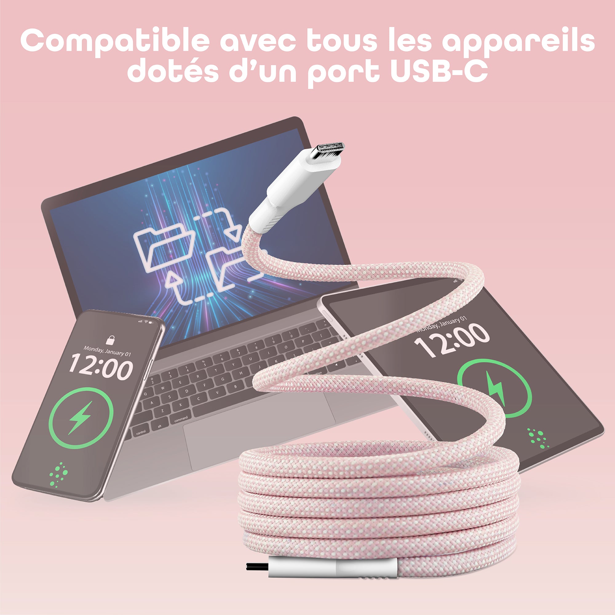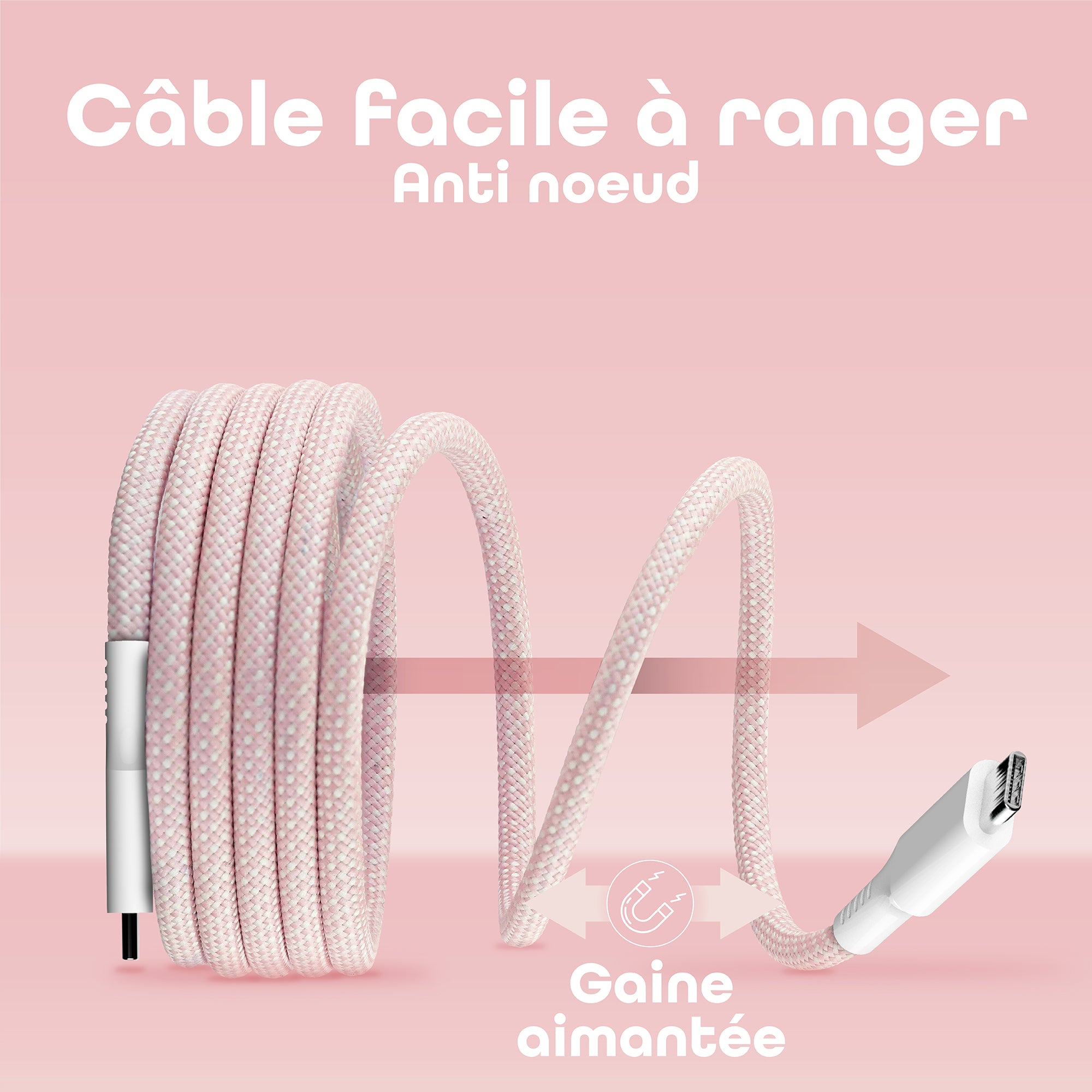 Discover our innovative cable with magnetic sheath, designed to meet all your charging and connection needs. A unique innovation that combines durability, performance and practicality. In addition to being made of braided nylon, the sheath is magnetic, which allows the cable to wrap around itself very easily. It is therefore very easy and practical to store and transport. No more cables that get tangled with each other and knotted, your cable is well stored, easy to unroll and use. As this cable will never leave you, we have chosen to use a braided sheath combining strength and elegance with reinforced connectors made of flexible and resistant plastic (TPE). You can therefore use this cable without worrying about damaging it, it is designed to last. Like all our other Type-C to Type-C cables, it is compatible with a charging power of 60W but also with data synchronization. It is therefore compatible with all your smartphones or other devices equipped with a USB-C port. Its ideal length of 1.5 meters makes it usable everywhere, at home, in the car or even at work. The cable with magnetic sheath is the essential accessory for all your electronic devices. Combining robustness, efficiency and convenience, it is designed to simplify your daily life
