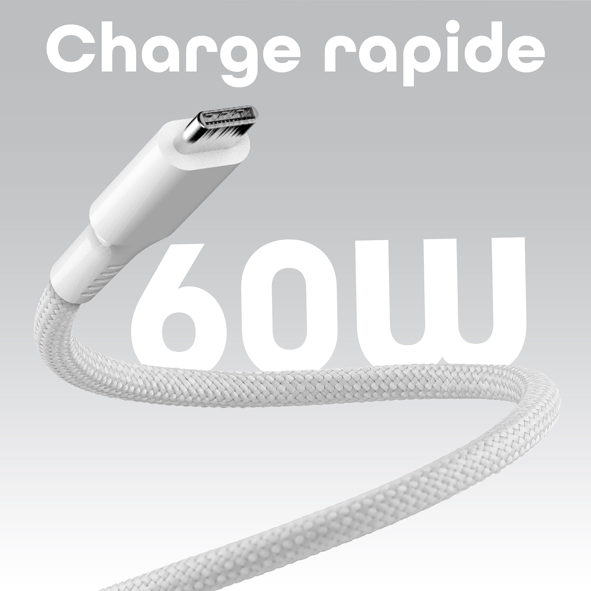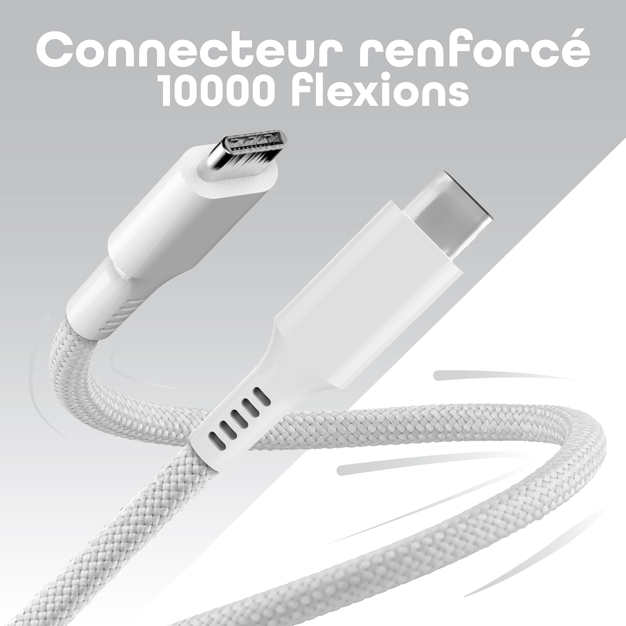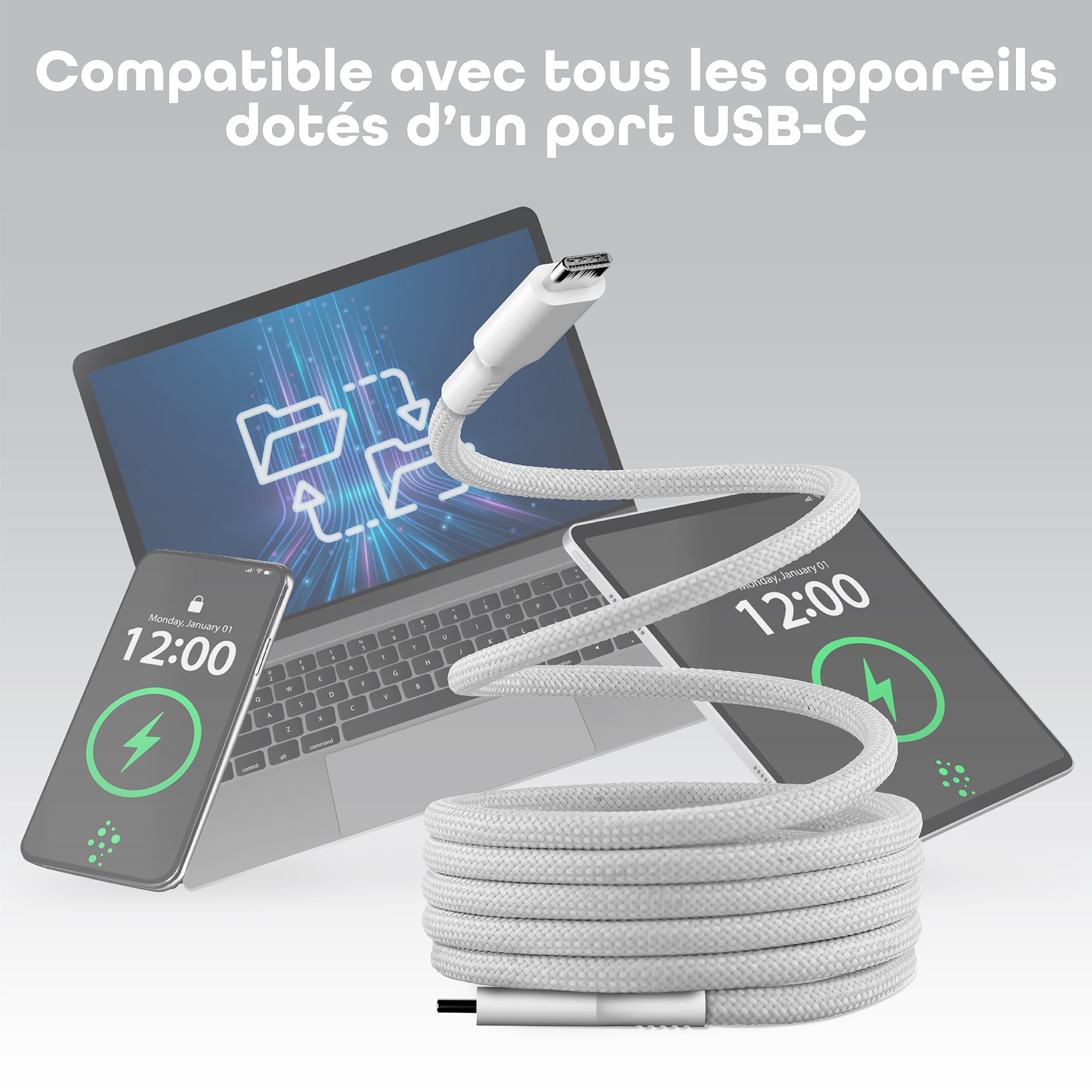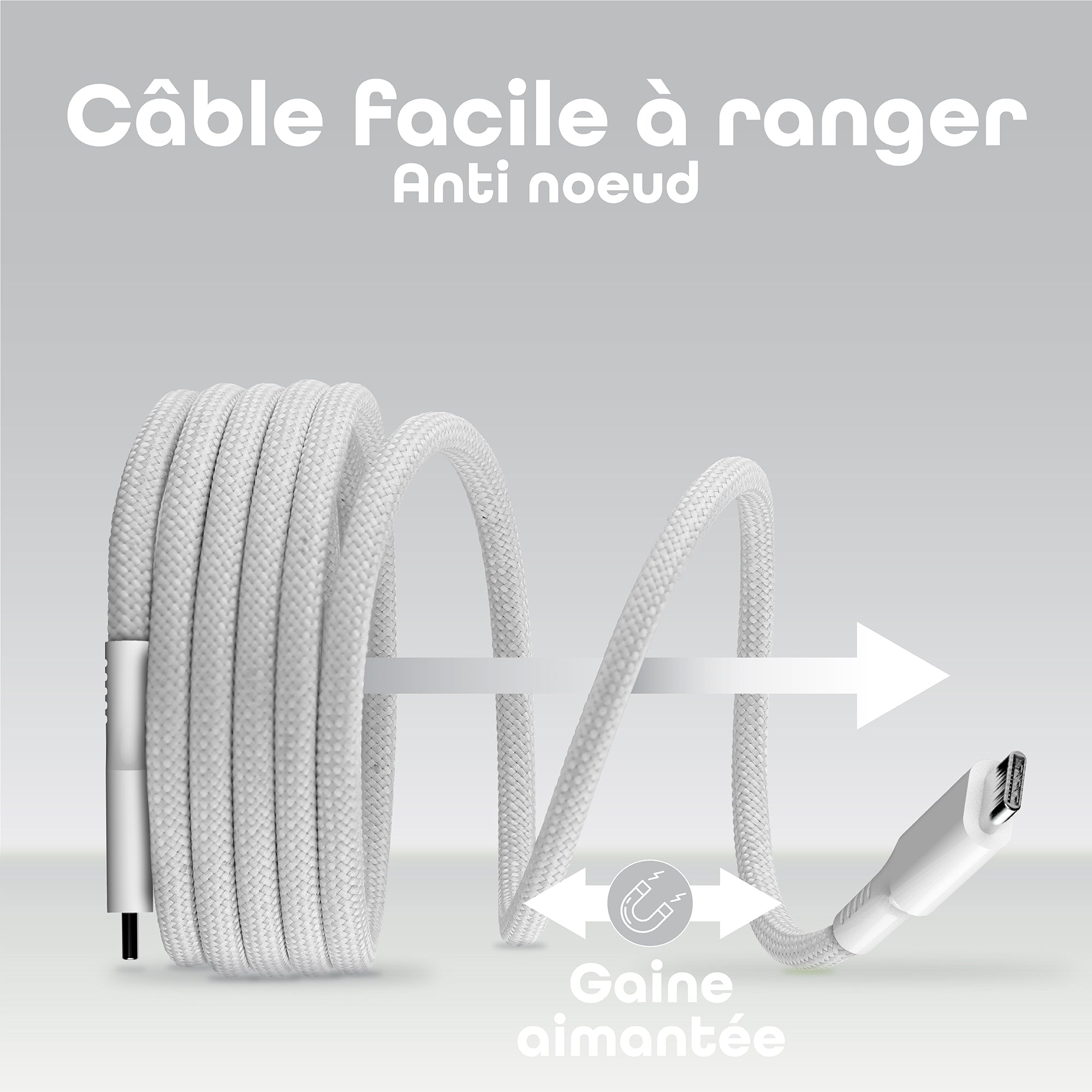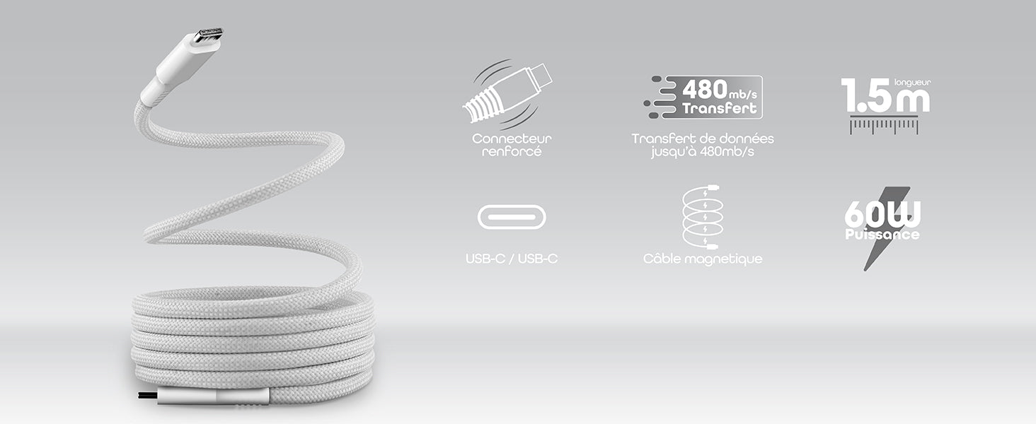 Discover our innovative cable with magnetic sheath, designed to meet all your charging and connection needs. A unique innovation that combines durability, performance and practicality. In addition to being made of braided nylon, the sheath is magnetic, which allows the cable to wrap around itself very easily. It is therefore very easy and practical to store and transport. No more cables that get tangled with each other and knotted, your cable is well stored, easy to unroll and use. As this cable will never leave you, we have chosen to use a braided sheath combining strength and elegance with reinforced connectors made of flexible and resistant plastic (TPE). You can therefore use this cable without worrying about damaging it, it is designed to last. Like all our other Type-C to Type-C cables, it is compatible with a charging power of 60W but also with data synchronization. It is therefore compatible with all your smartphones or other devices equipped with a USB-C port. Its ideal length of 1.5 meters makes it usable everywhere, at home, in the car or even at work. The cable with magnetic sheath is the essential accessory for all your electronic devices. Combining robustness, efficiency and convenience, it is designed to simplify your daily life