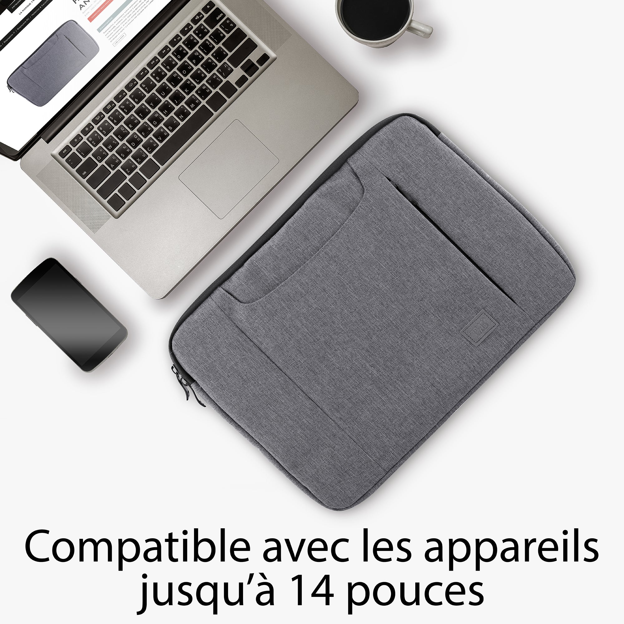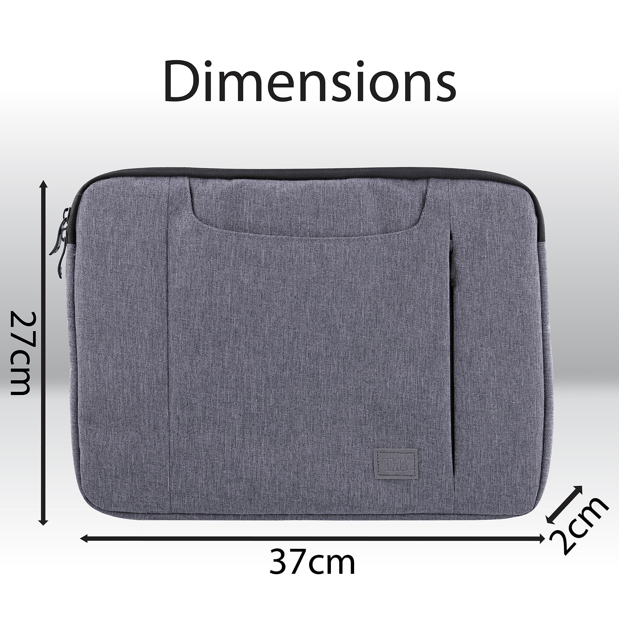 The case features a main interior zipped compartment for storing your laptop up to 14". There's a zipped pocket on the front of the case for storing pens, documents, and other personal belongings.