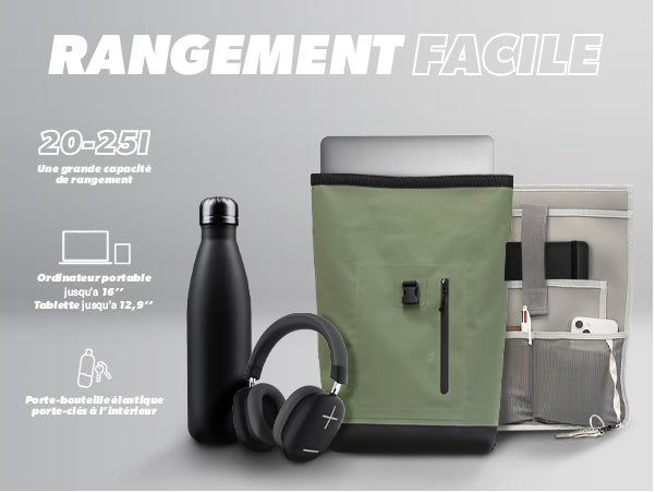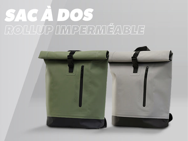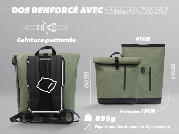 Made of waterproof fabric, it protects your belongings from the rain. Fold the rolltop into a tight roll.