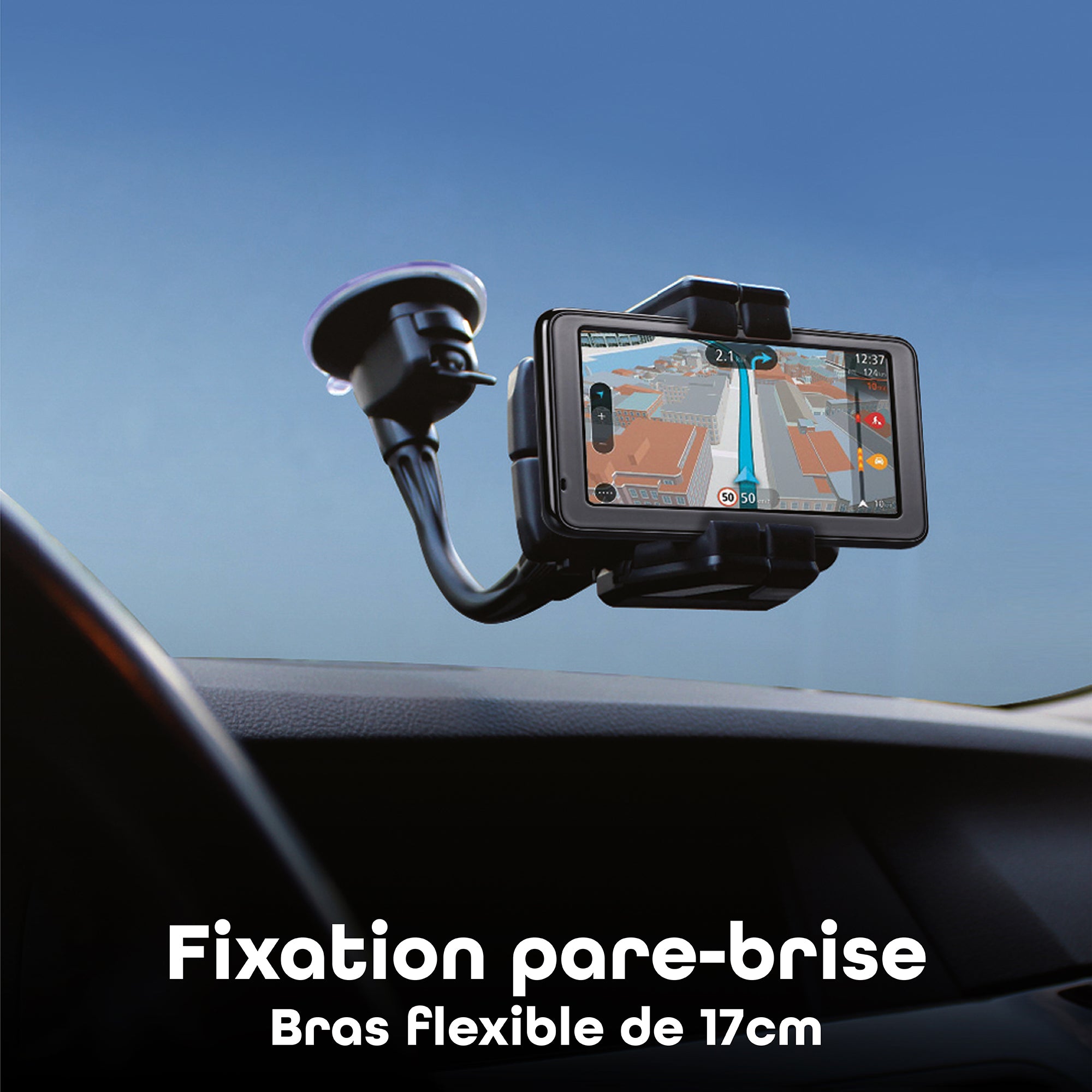 Its suction cup with notched fixing wheel provides a powerful hold on your windshield.