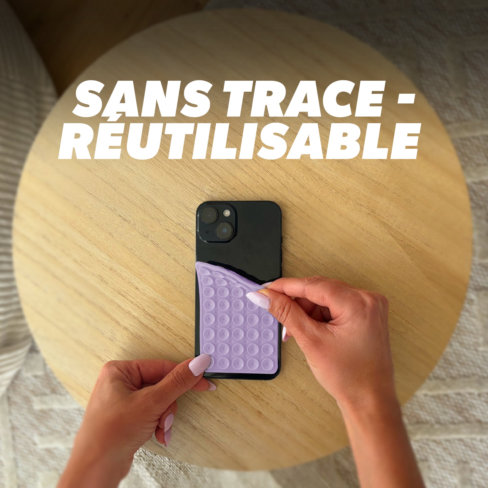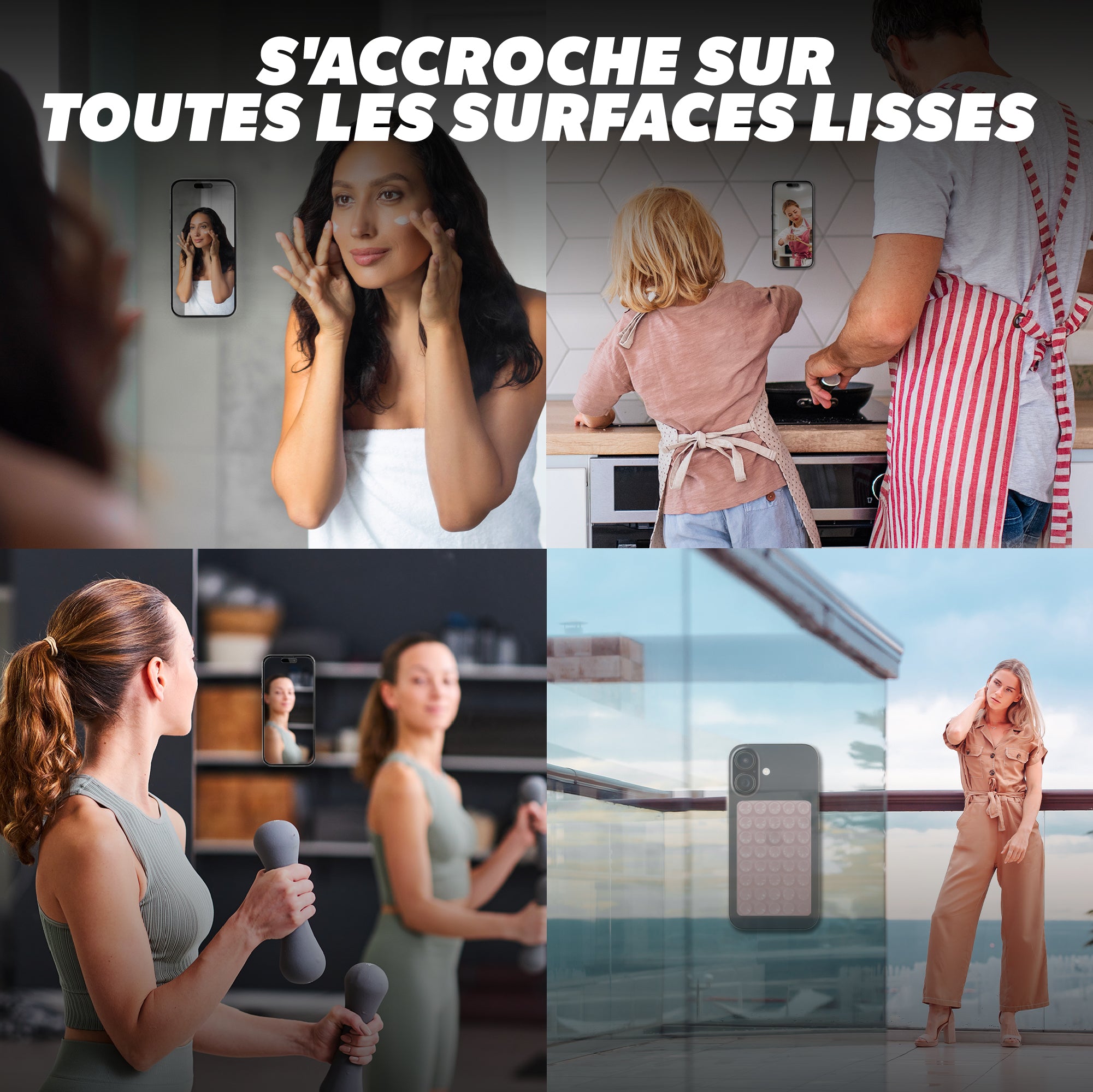 Made of ultra-adhesive silicone, these mounts easily attach to the back of your phone for a stable grip on any smooth surface: mirror, glass, tile, metal, etc.