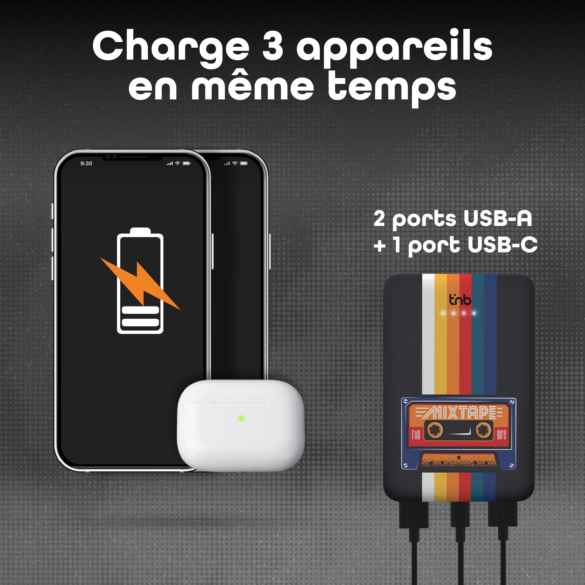Equipped with 2 USB-A ports and 1 USB-C port, it allows you to charge up to 3 devices simultaneously. Its fast charging power reaches 20W via the USB-C port and 18W via the USB-A ports, for efficient charging at any time.
