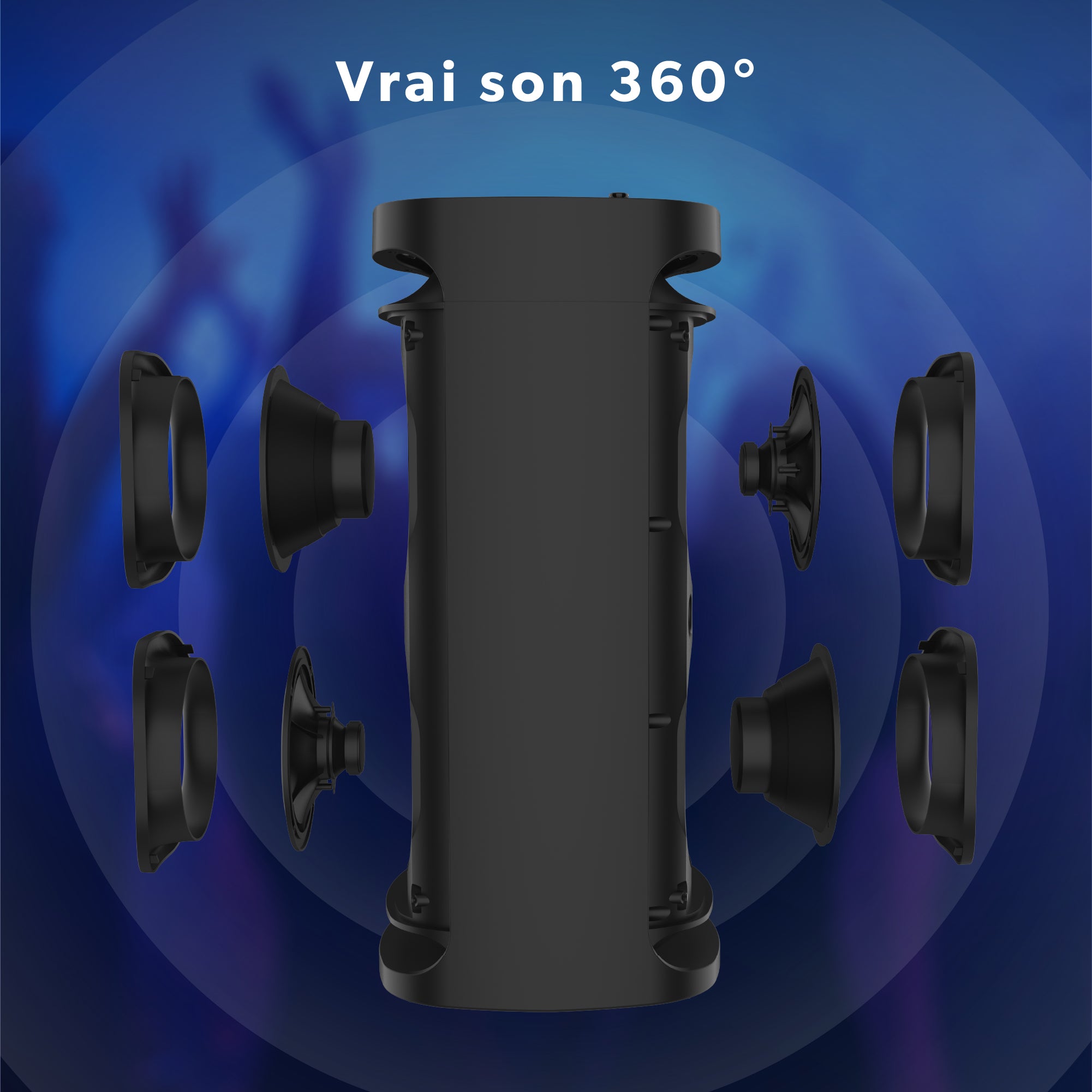 60 Watts RMS power in an innovative design: two speakers on each side of the enclosure for true 360° sound!