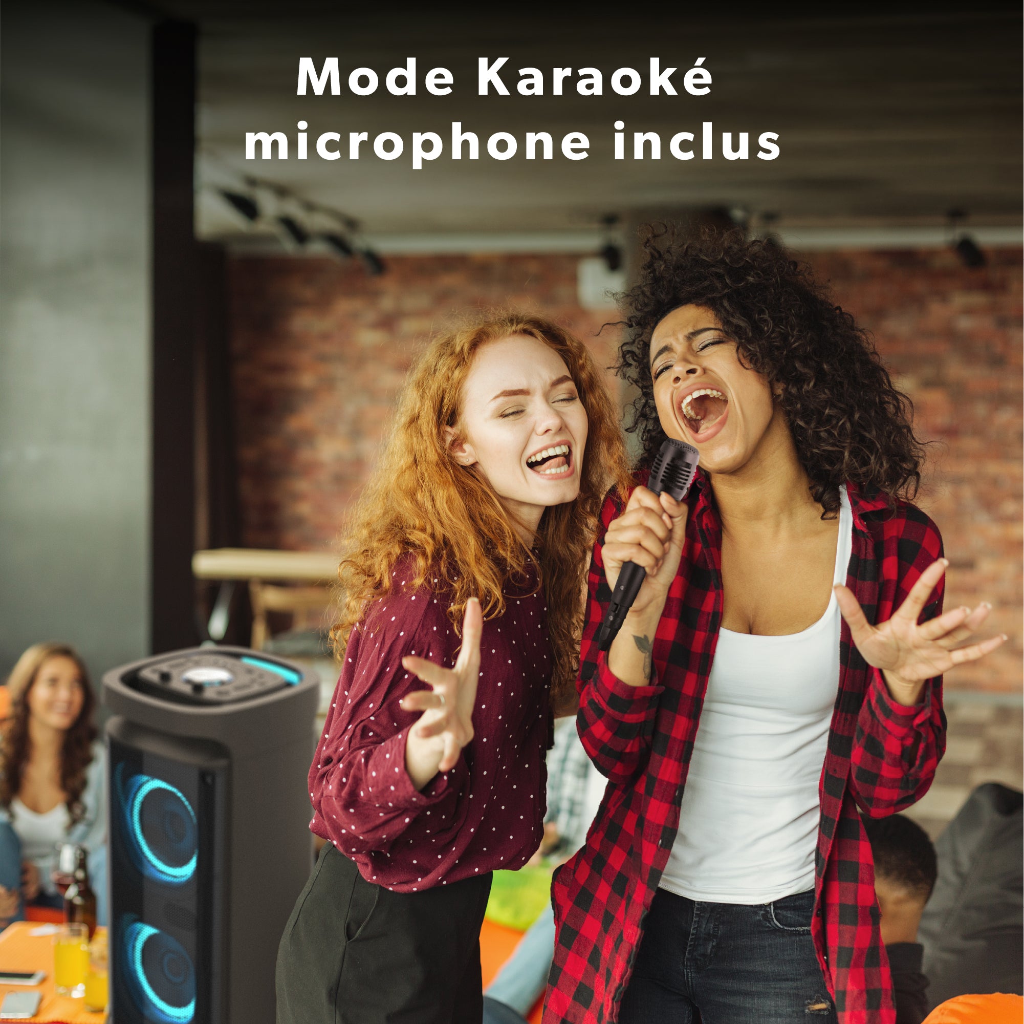 The PARTY BLASTER also has a 6.35 mm jack port: plug in a musical instrument and use the speaker as a studio amp! At the same time, use the included Bluetooth microphone and switch to karaoke mode in an instant! You can control the microphone's volume and echo with a single gesture, so you can become the star of the party.