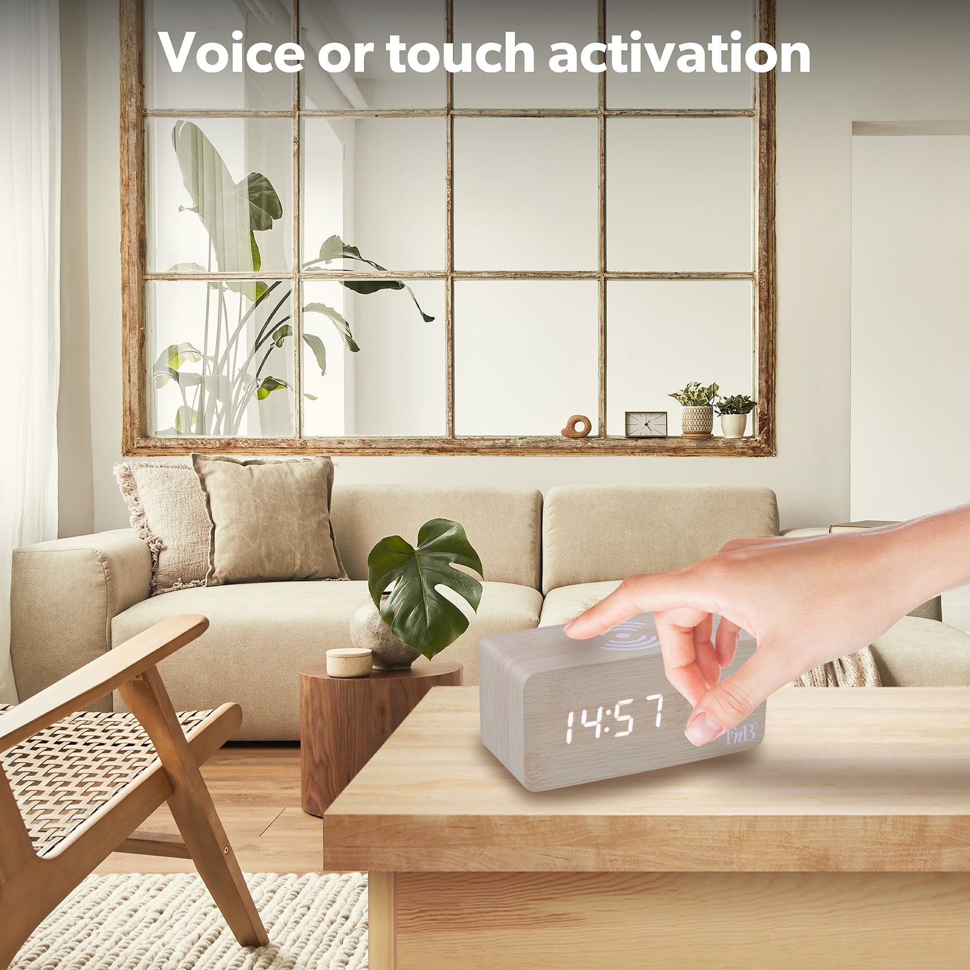 Add a trendy touch to your interior with this wood-finish LED alarm clock with induction charger!