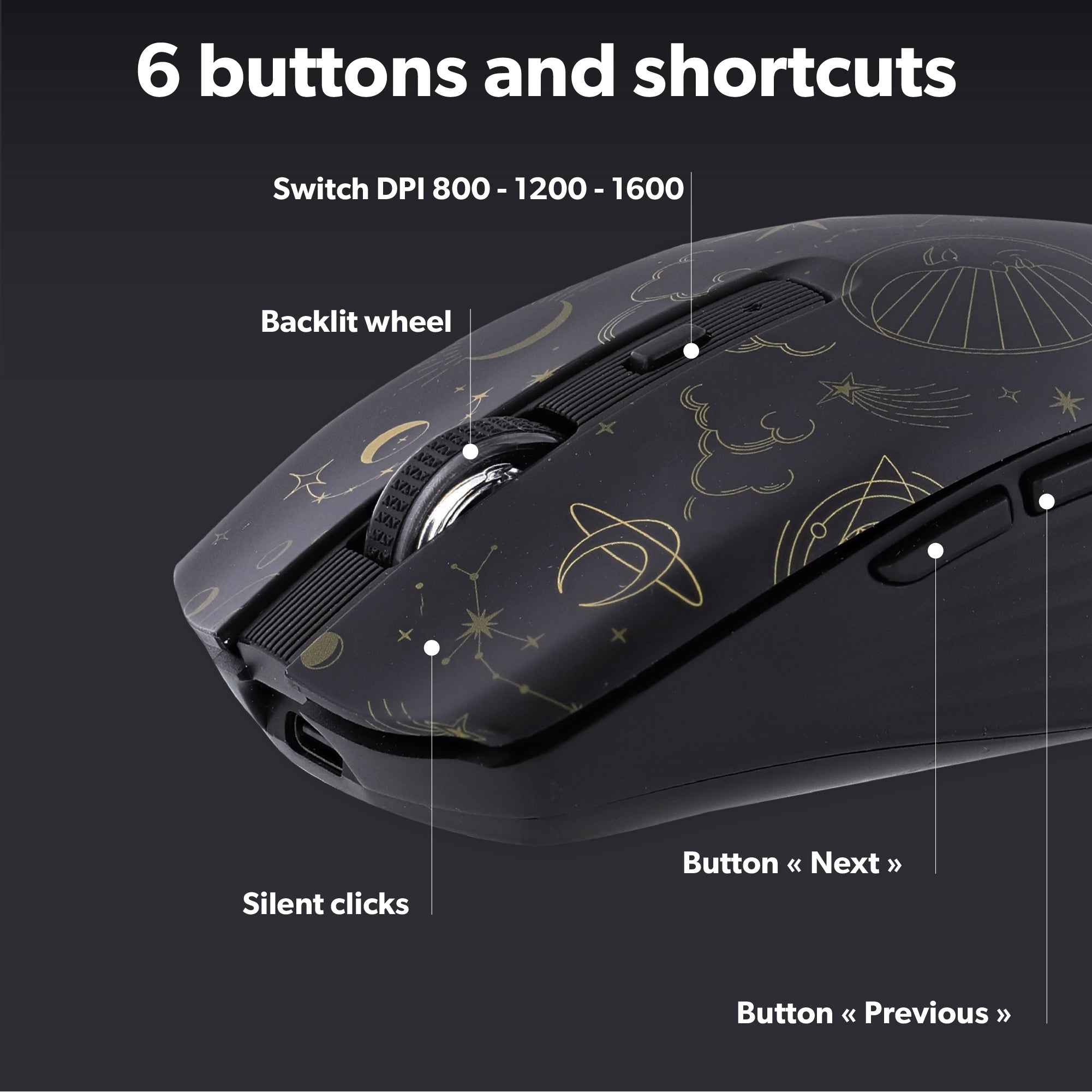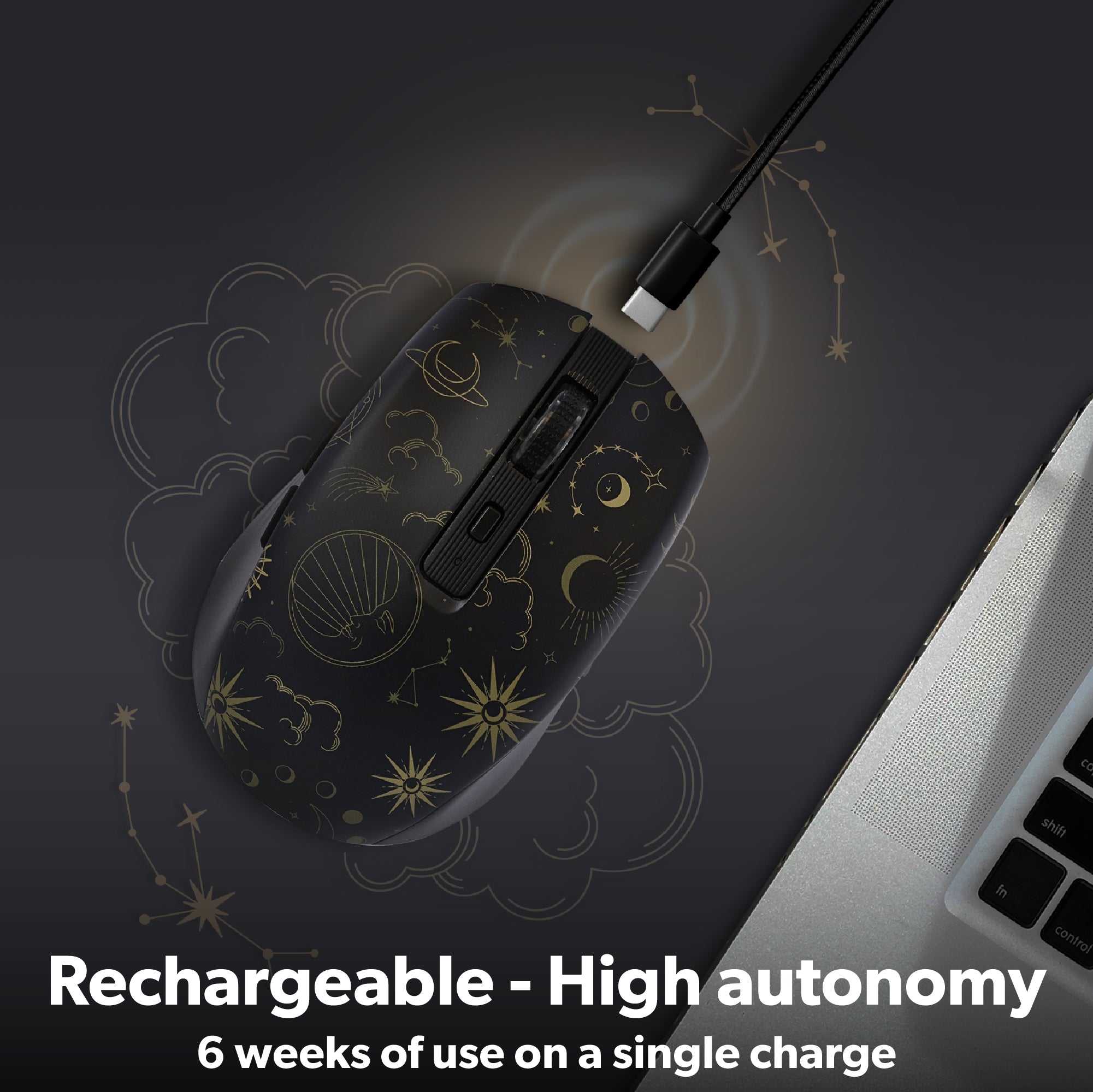 Dual-mode rechargeable Bluetooth and USB-A 2.4GHz wireless mouse.