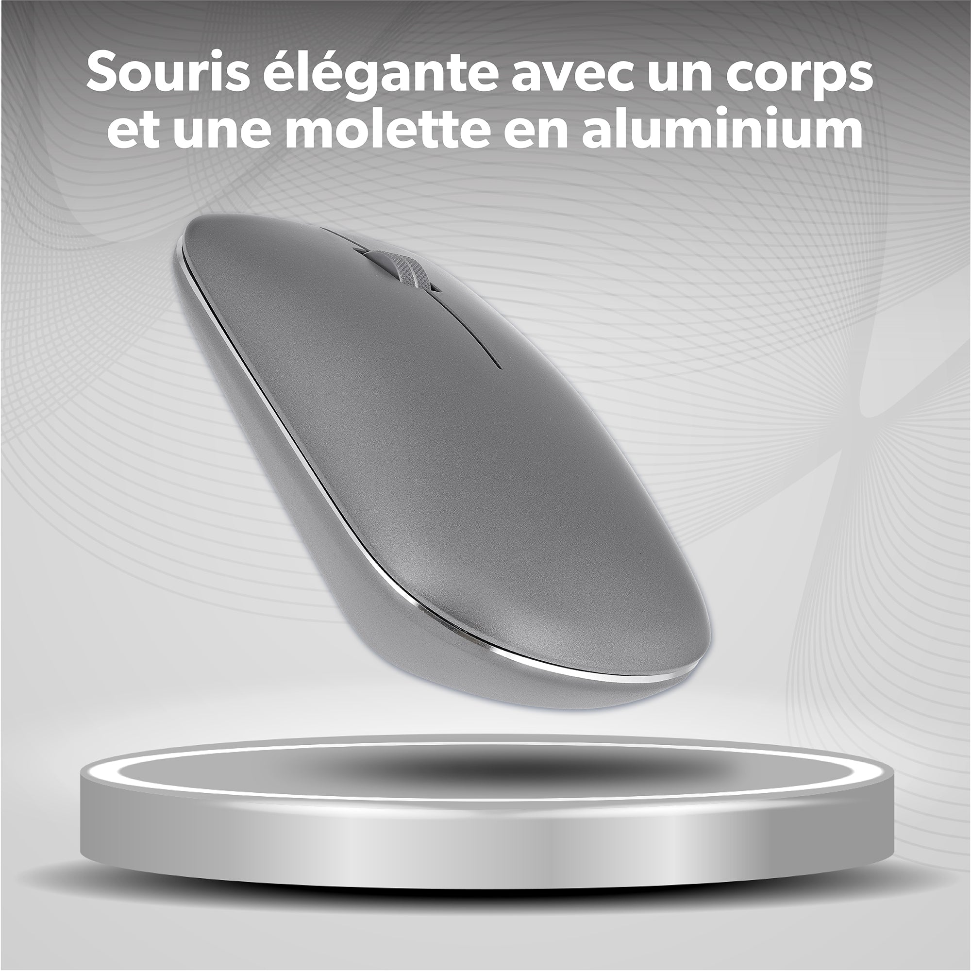 Stylish mouse with aluminum body and scroll wheel.