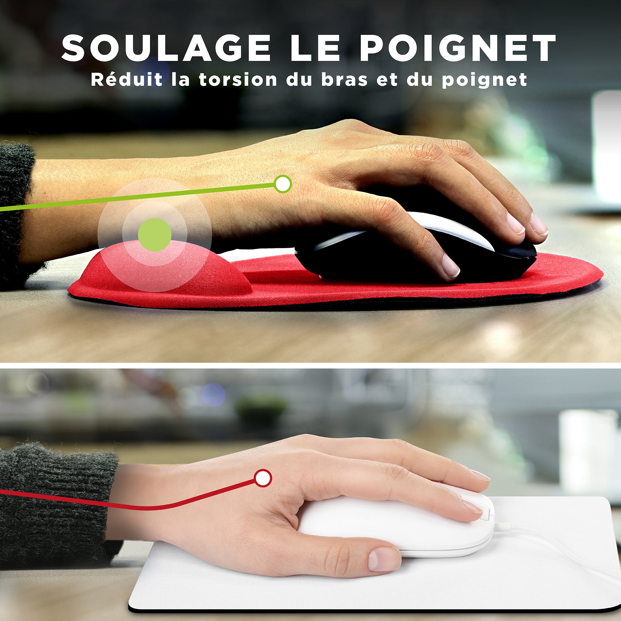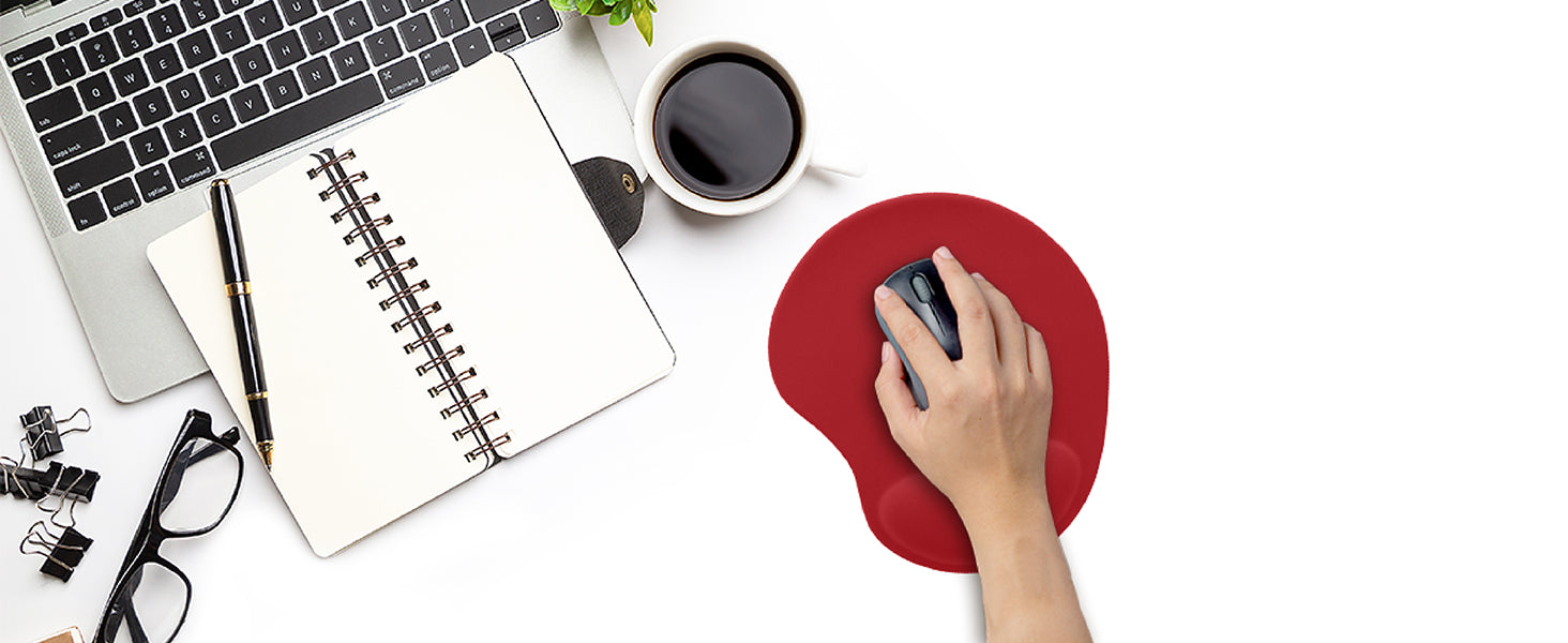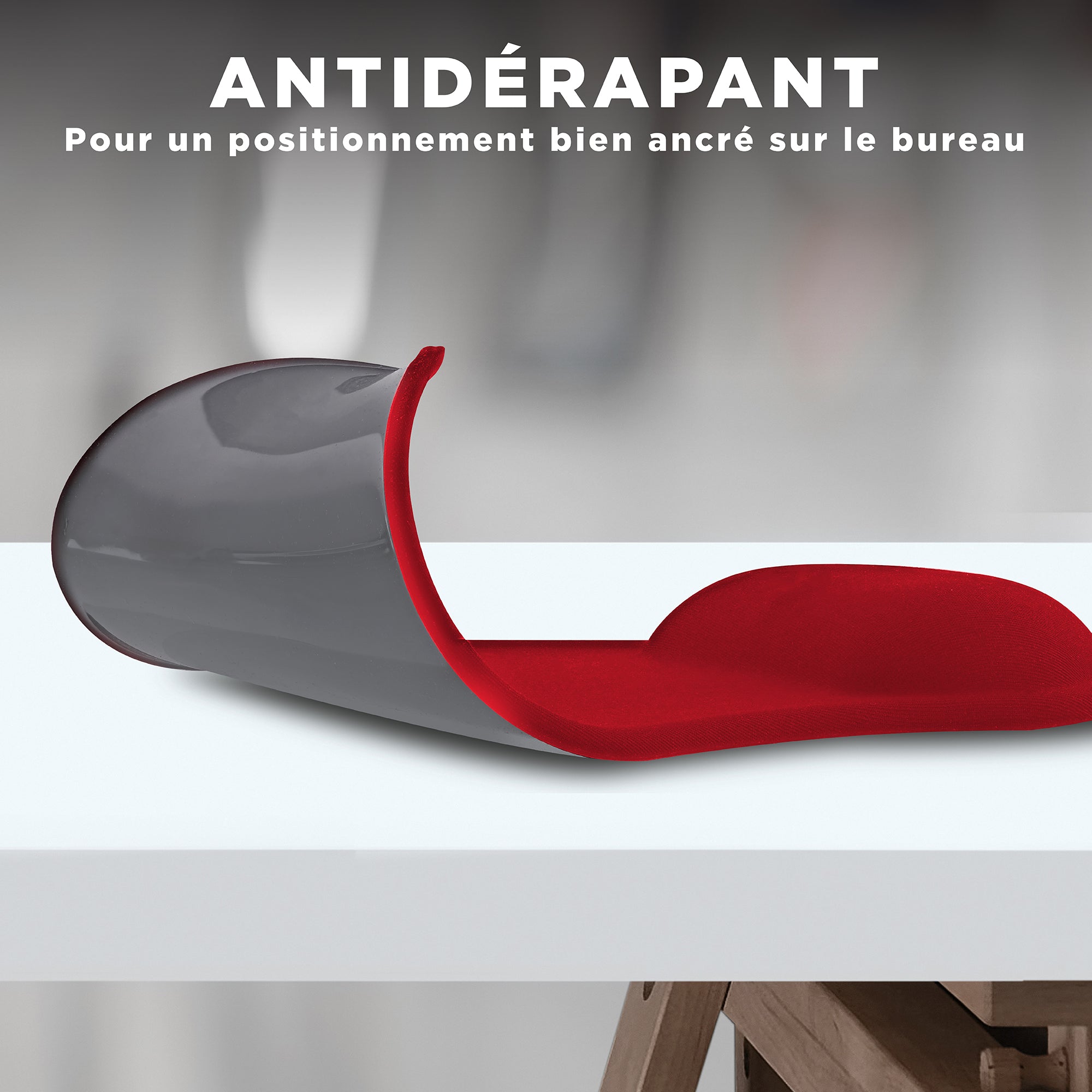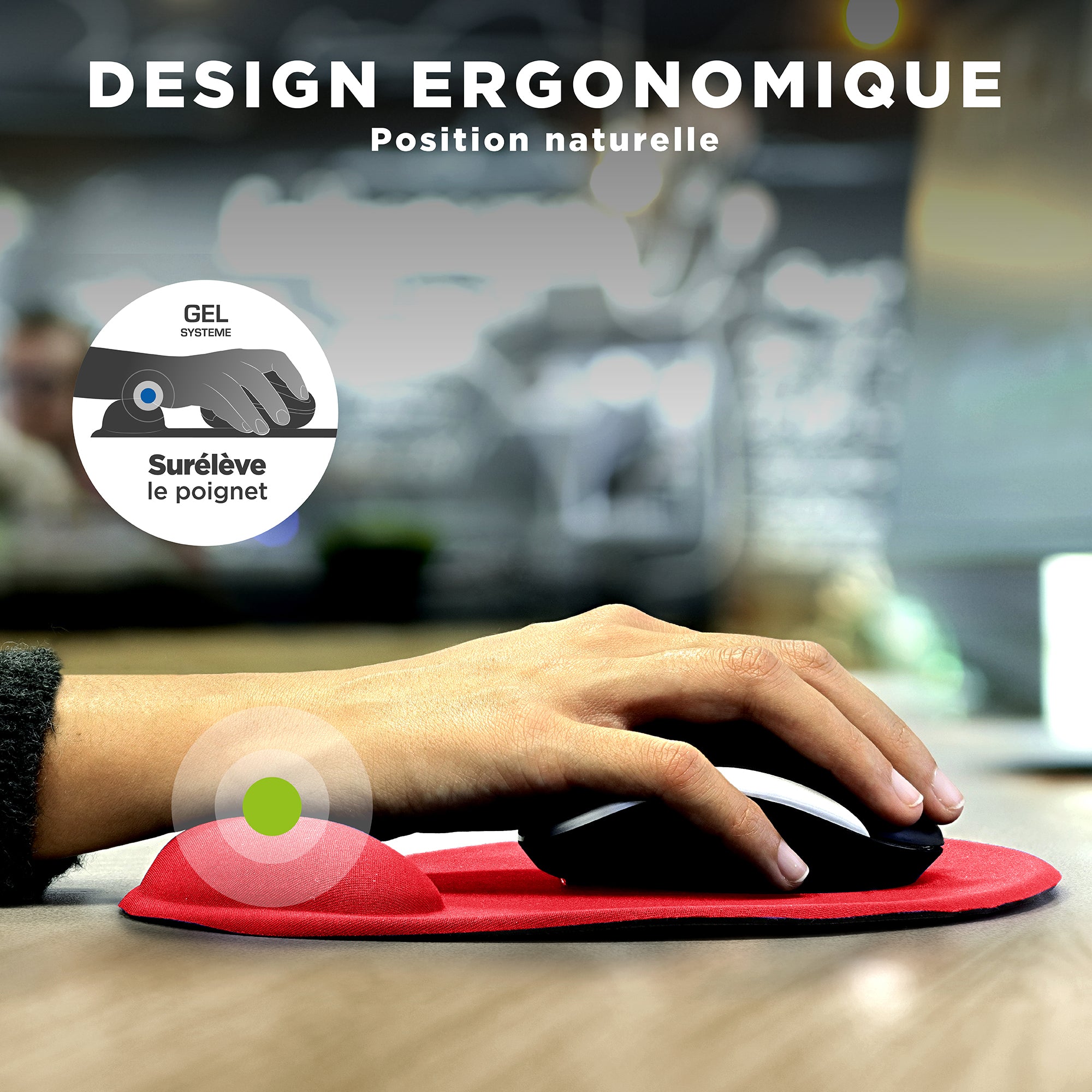 Mouse pad with gel wrist rest. Fits the shape of the wrist and palm of the hand. The gel provides comfortable support and reduces fatigue due to wrist tension. Non-slip coating. Red color.