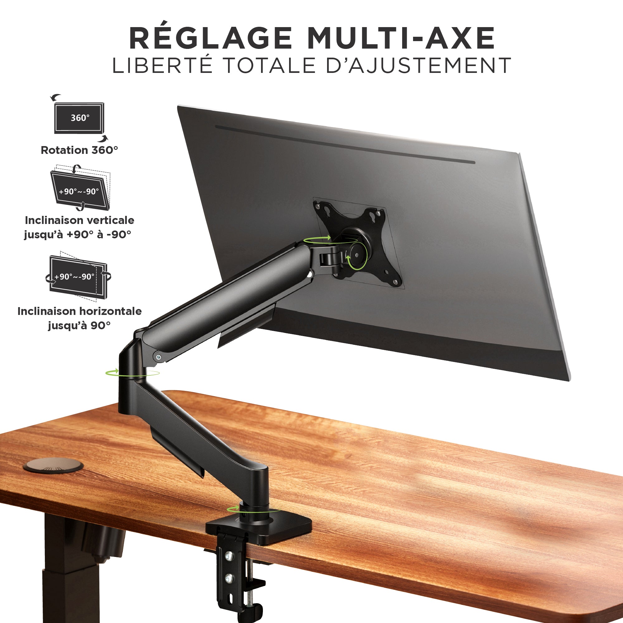 Brazo de pantalla con articulación completa y ajuste de 360°.