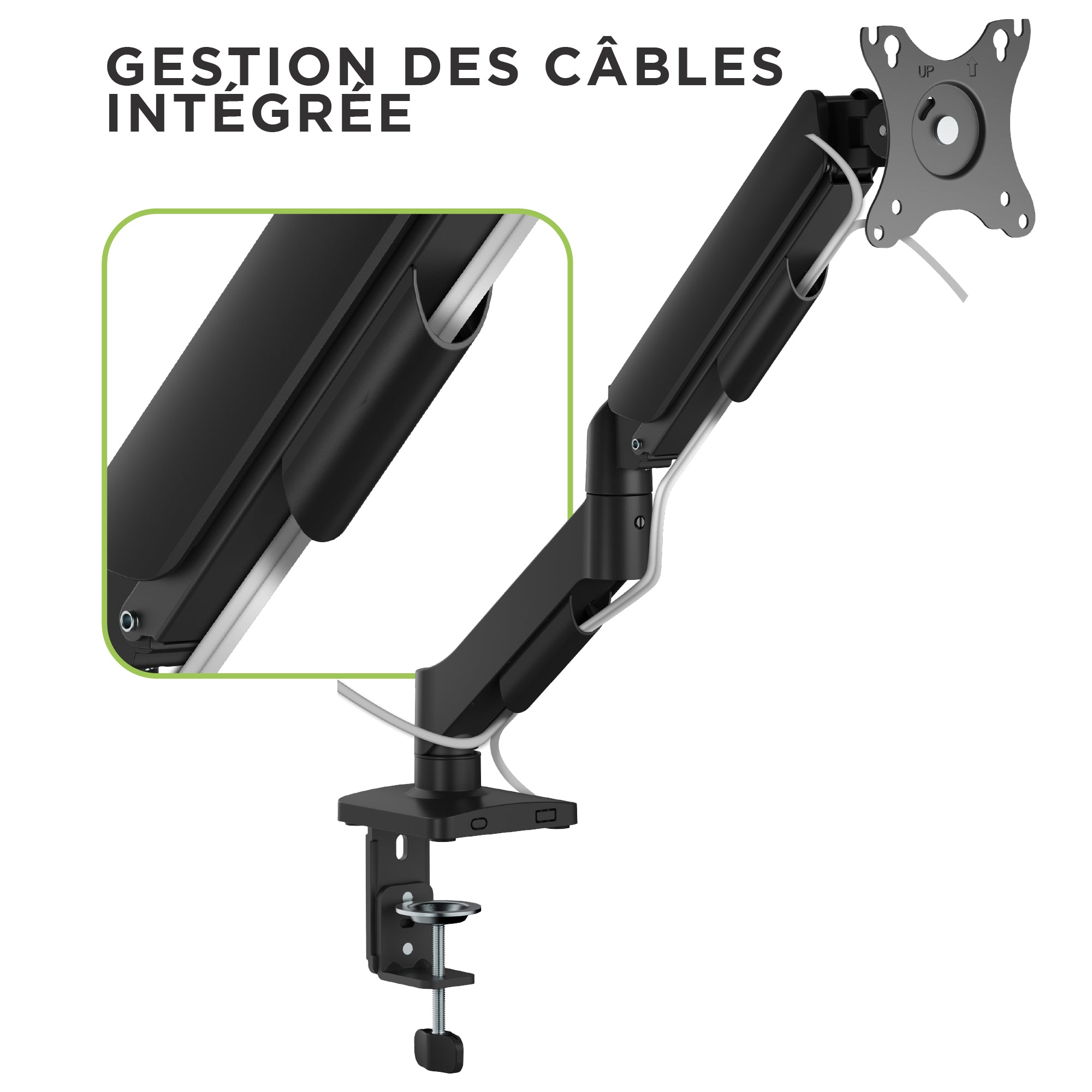Guía de cables integrada en el cuerpo del brazo para facilitar el almacenamiento en el escritorio y liberar espacio.