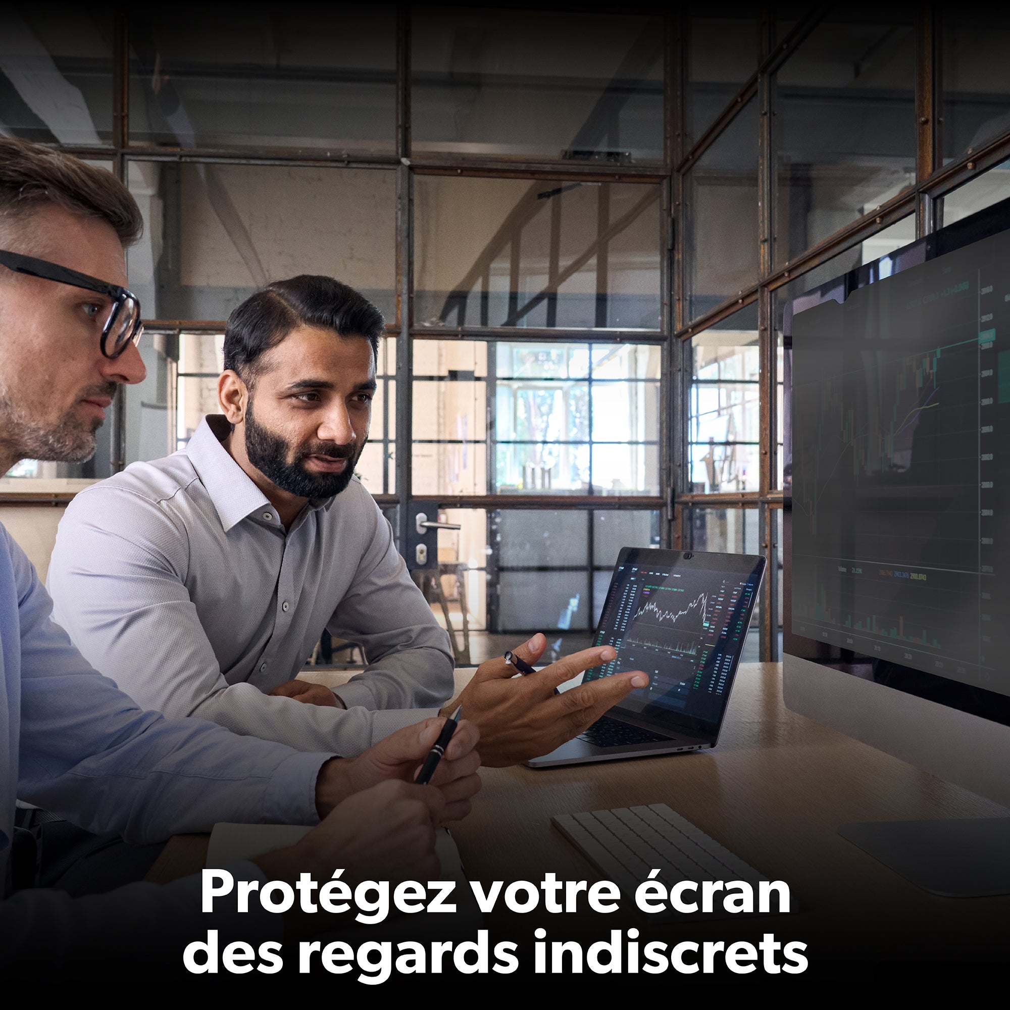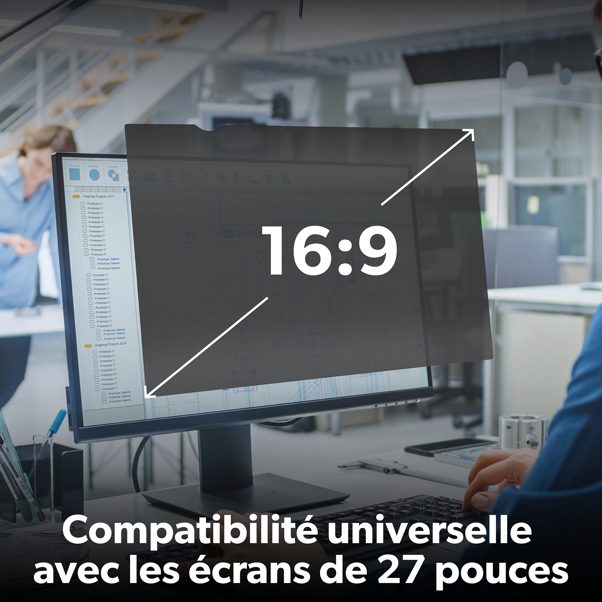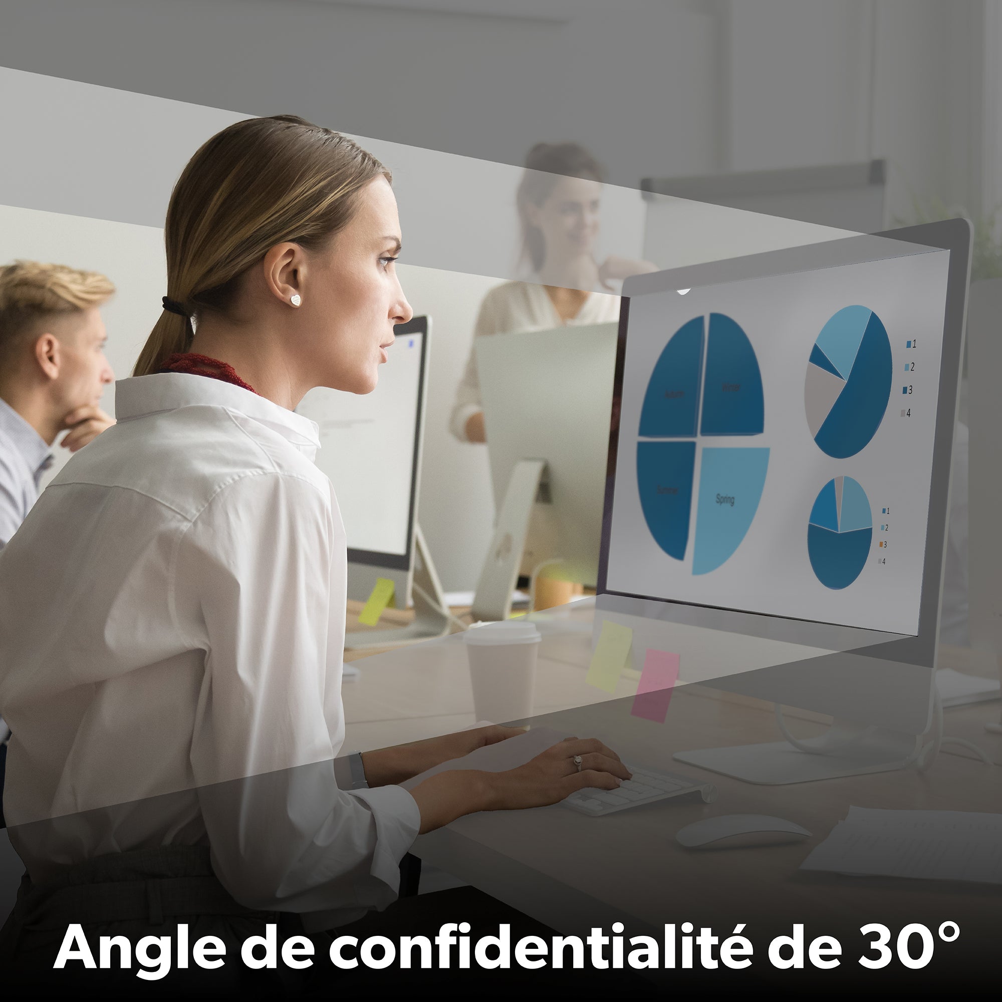 El filtro de privacidad es compatible con todos los monitores de 27". Es fácil de instalar gracias a su material electrostático y sus tiras autoadhesivas. Protege desde ángulos de visión superiores a 30°, permitiendo que solo el usuario frente a la pantalla vea el contenido. Reduce la radiación dañina de luz azul en más del 90 %.