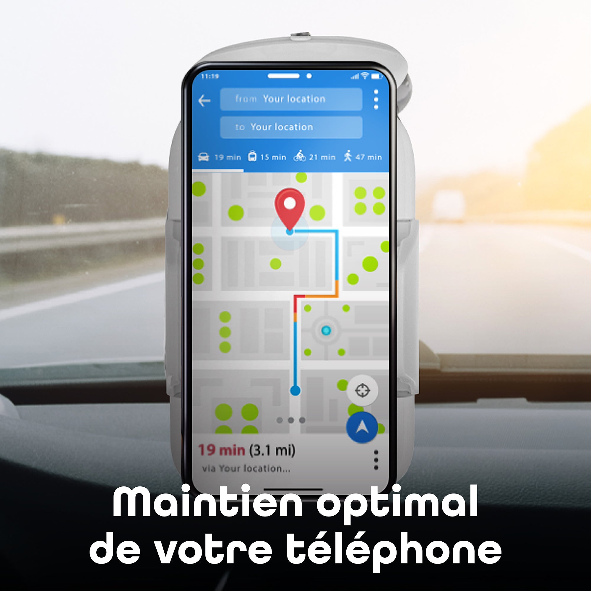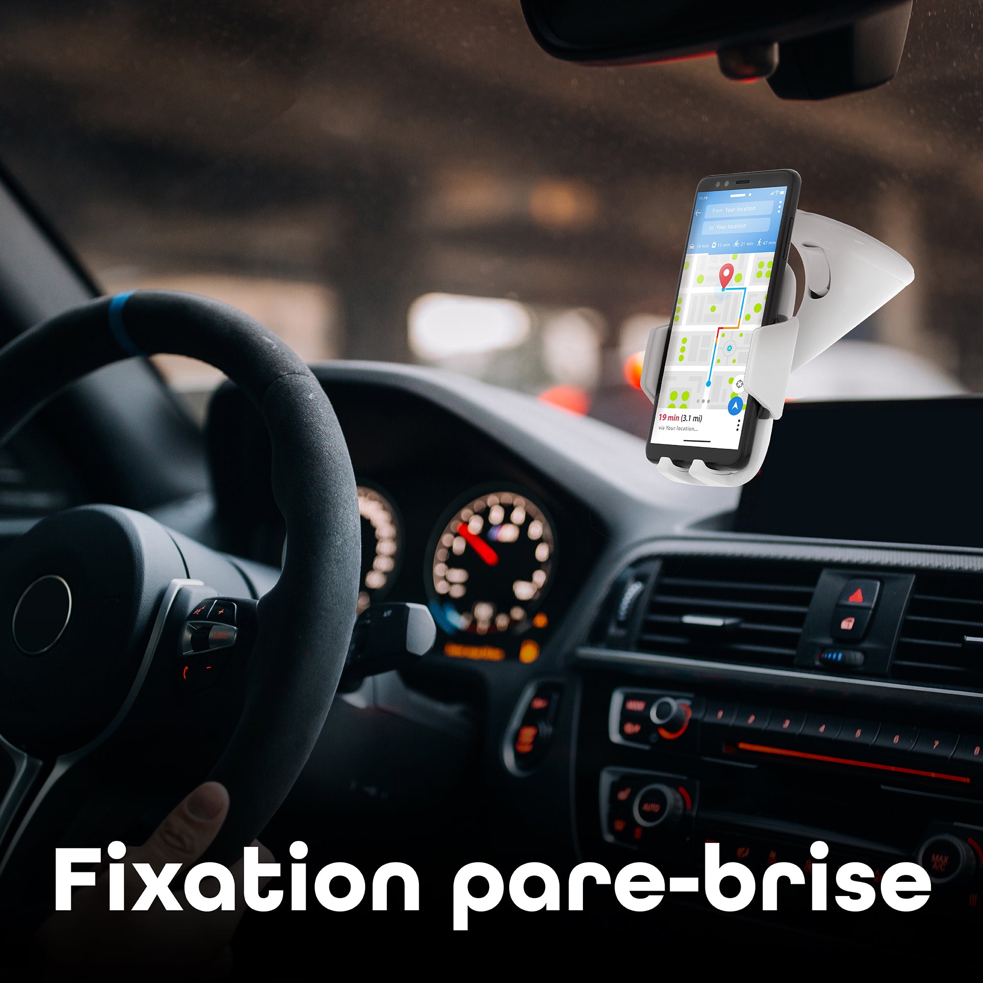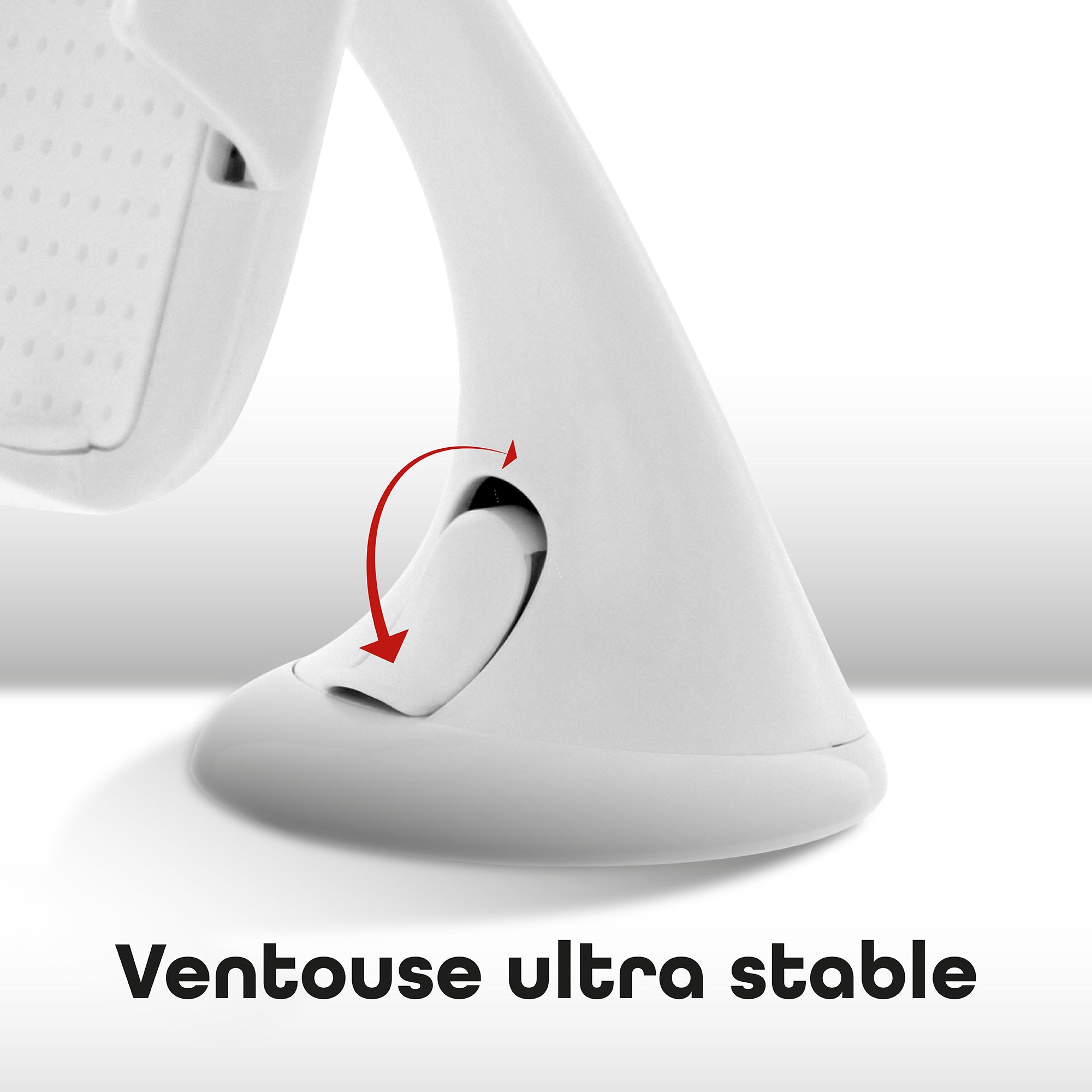 Su gran ventosa permite una potente fijación a su parabrisas o tablero si tiene un adaptador circular.