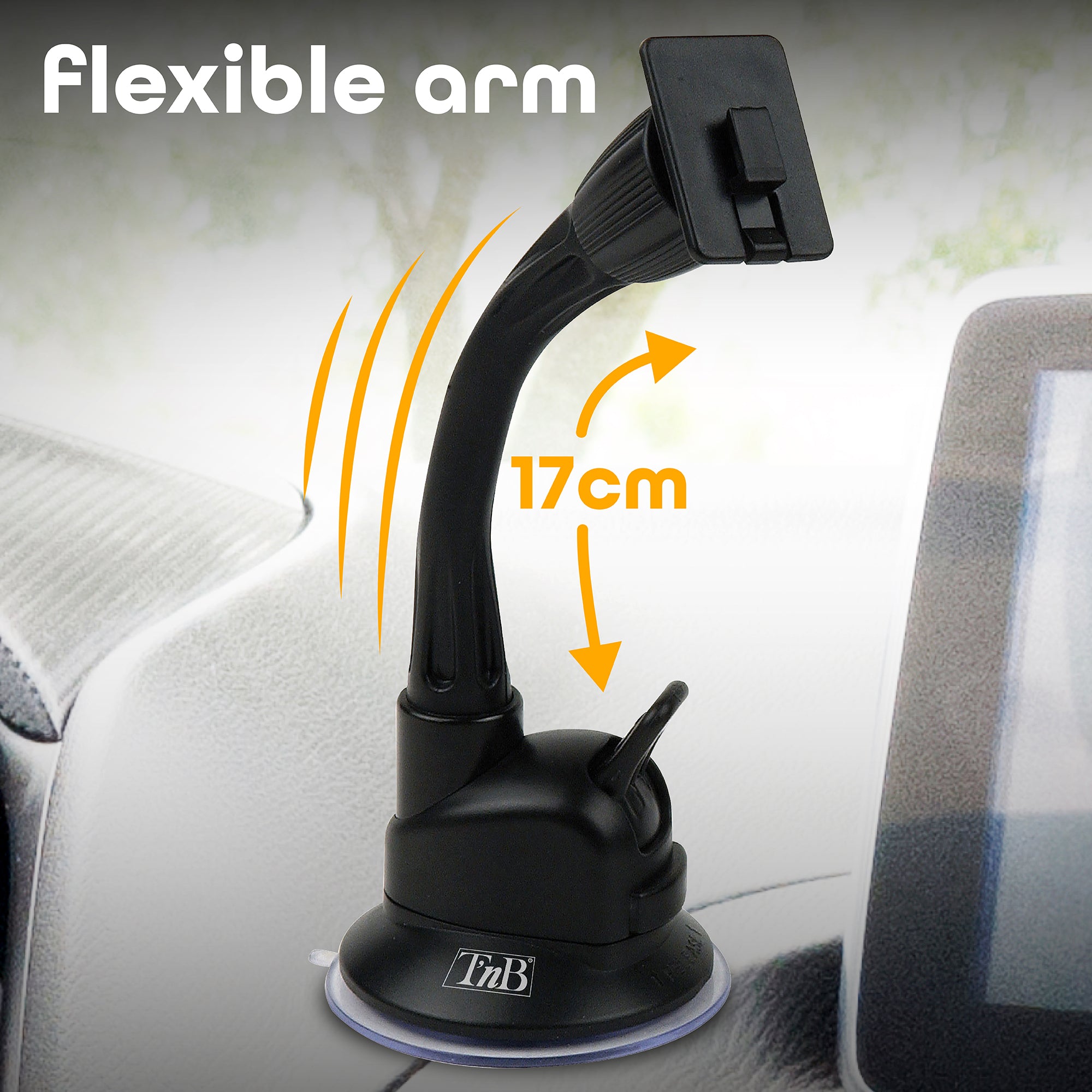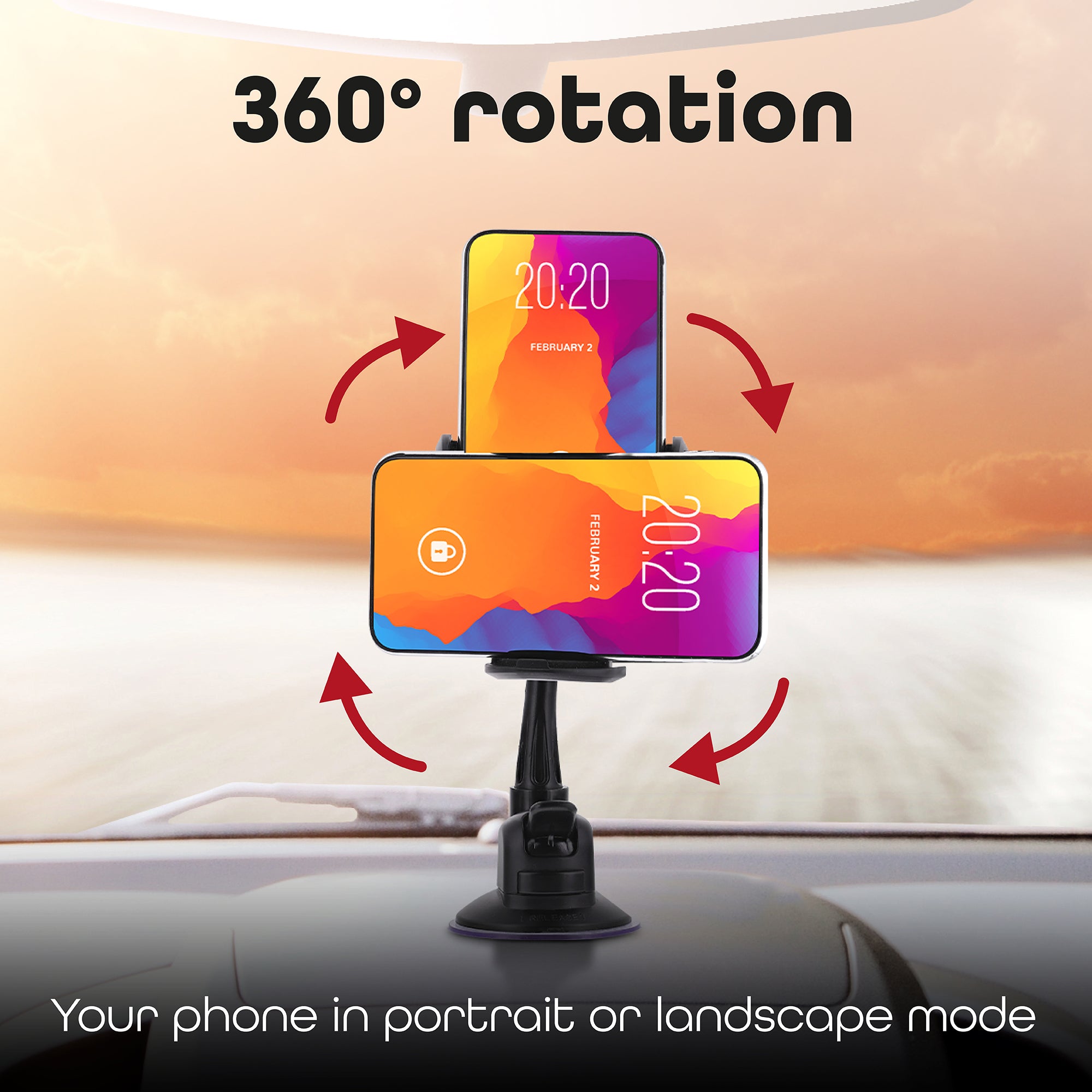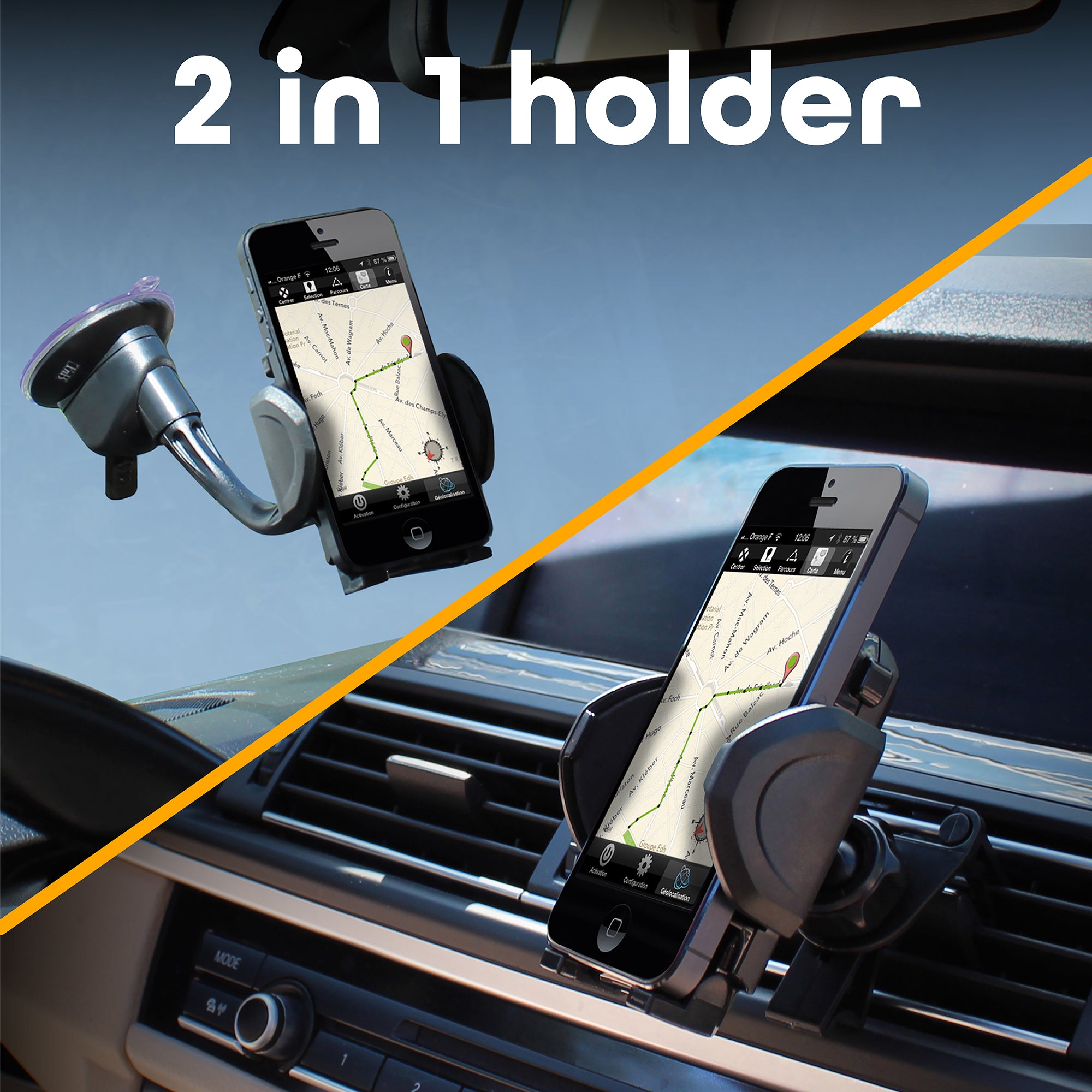 ¡Descubre el soporte ideal para mantener tu smartphone al alcance y a la vista! Este soporte 2 en 1 permite una potente fijación al parabrisas o a la salida de aire. Además, sus clips de sujeción garantizan un soporte óptimo para su dispositivo móvil. Dado que su cabezal se puede girar 360°, puedes incluso orientar tu smartphone en modo horizontal. Su brazo rígido flexible te permite orientar tu smartphone como desees. Robusto, puede contener con seguridad un móvil de hasta 7 pulgadas. ¡Este soporte con ventosa se convertirá rápidamente en el soporte imprescindible para tus viajes!