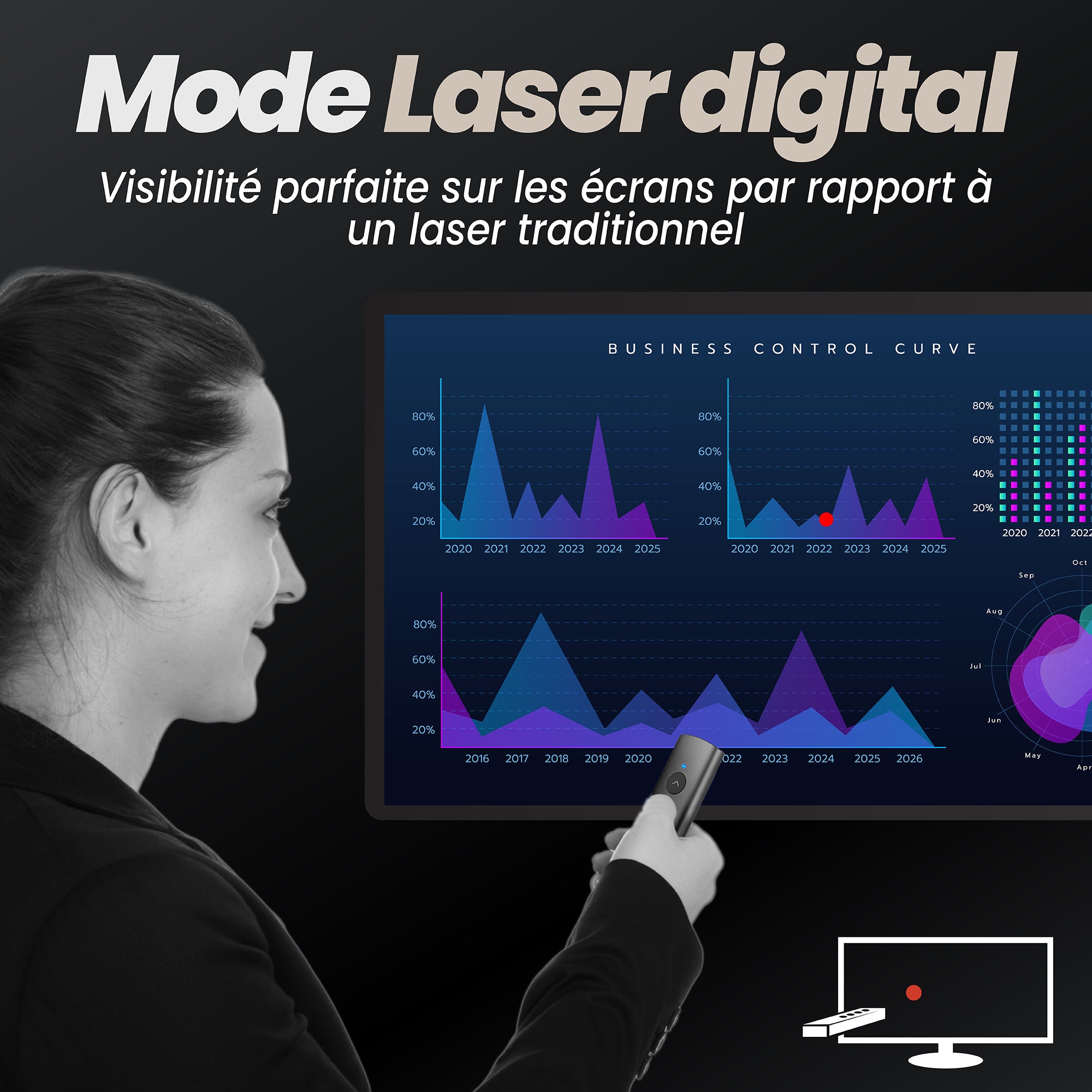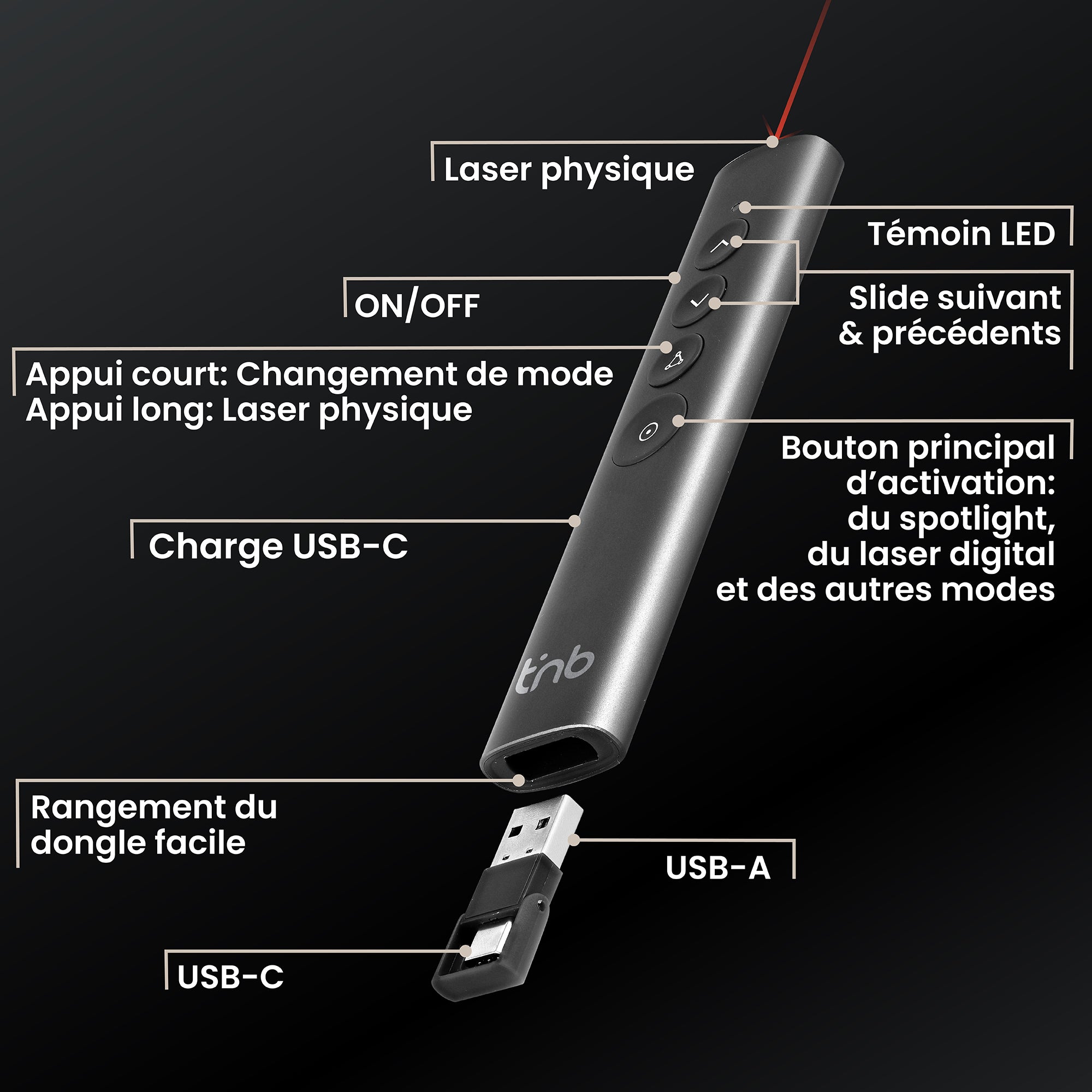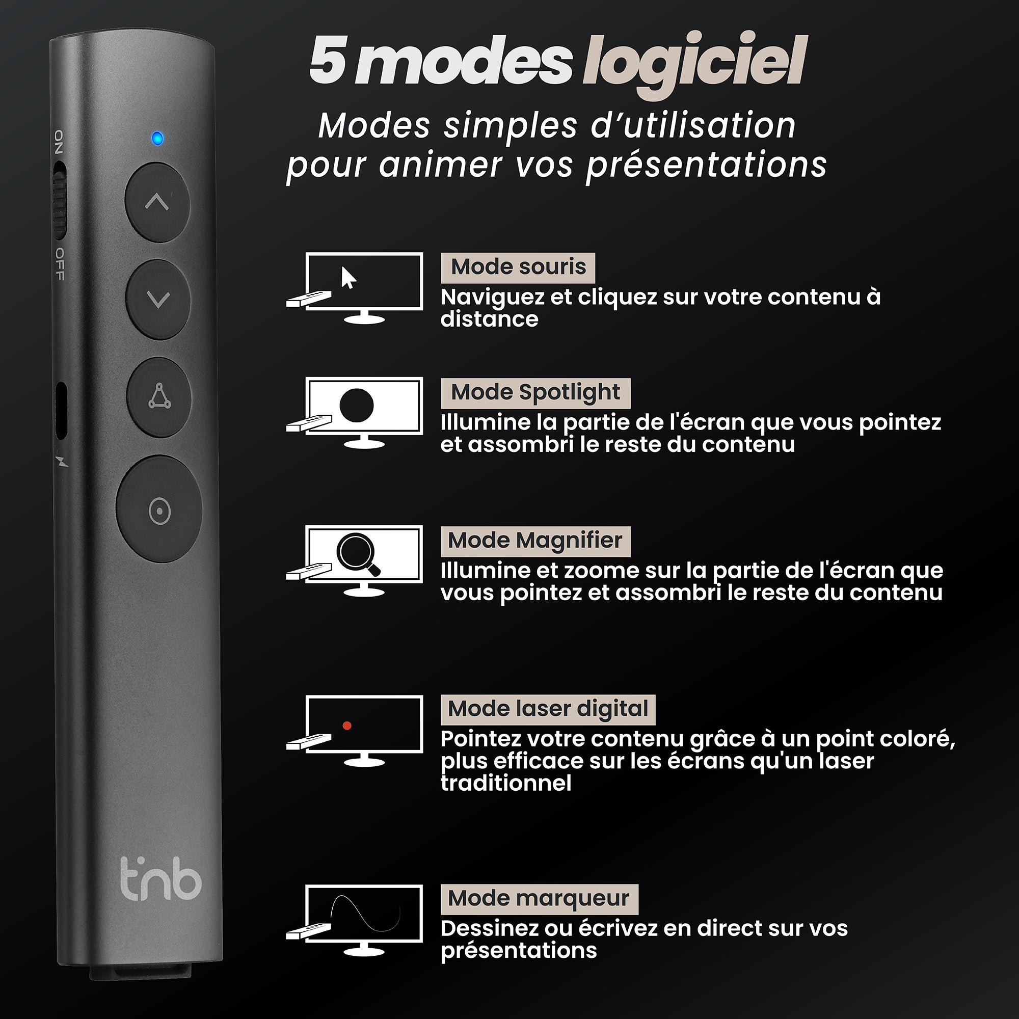 El control remoto de presentaciones Spotlight es la herramienta ideal para sus reuniones y presentaciones. Gracias a su software, el AIRPRESENTER cuenta con 4 modos integrados para animar y presentar su contenido. 4 modos: 1. Modo ratón que le permite navegar con el cursor y hacer clic en sus contenidos. 2. Modo foco que ilumina la parte de la pantalla a la que estás apuntando. 3. Modo de ampliación, que ilumina y amplía el contenido que estás señalando. 4. Modo creativo para dibujar y escribir directamente sobre tu contenido para resaltar lo que quieres. Todo esto con un simple clic y únicamente movimientos del puntero para navegar. Estas tecnologías permiten una legibilidad perfecta en la pantalla a diferencia de los láseres tradicionales que apenas son visibles cuando se apuntan a las pantallas. Además de estas diferentes características, el AIRPRESENTER permite funciones clásicas como el desplazamiento de diapositivas, así como el modo de pantalla negra rápida para ocultar la pantalla. Largo alcance gracias a su adaptador de radiofrecuencia USB-A y USB-C. Su diseño de aluminio y sus botones suaves al tacto proporcionan un agarre agradable e instintivo.