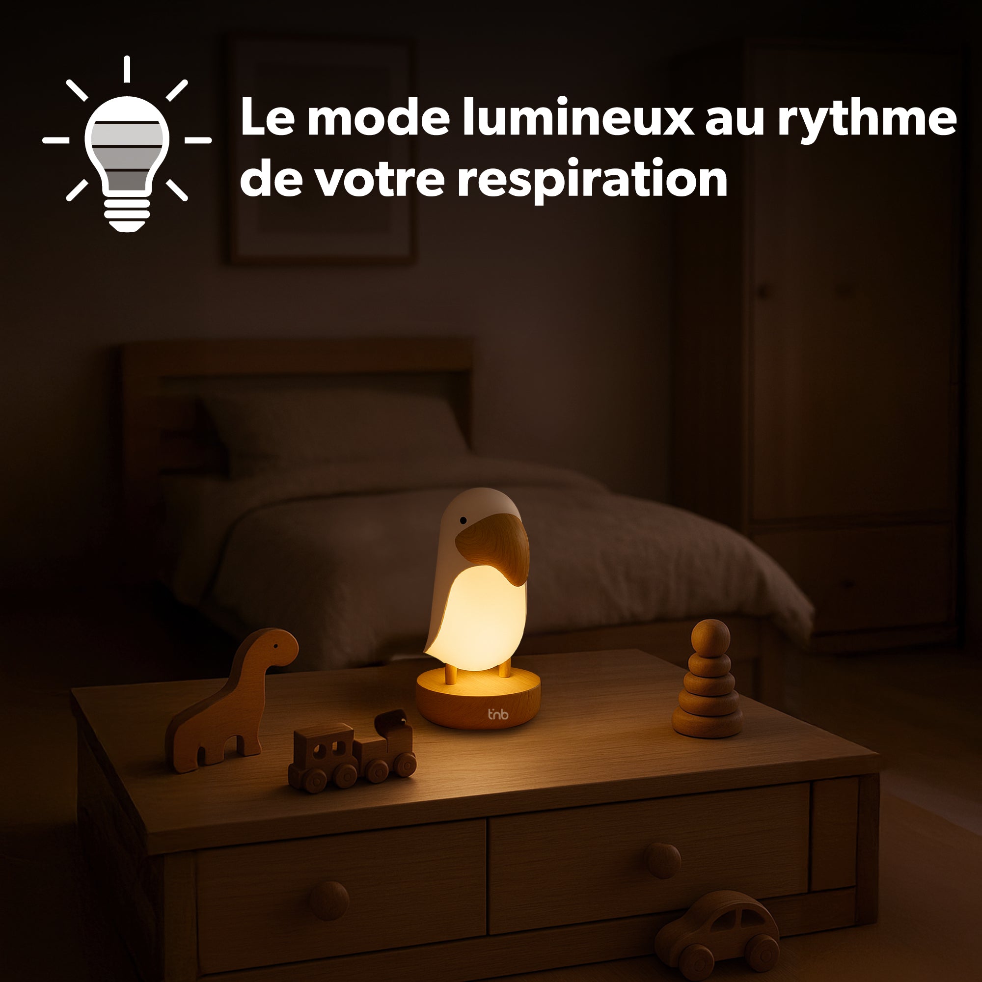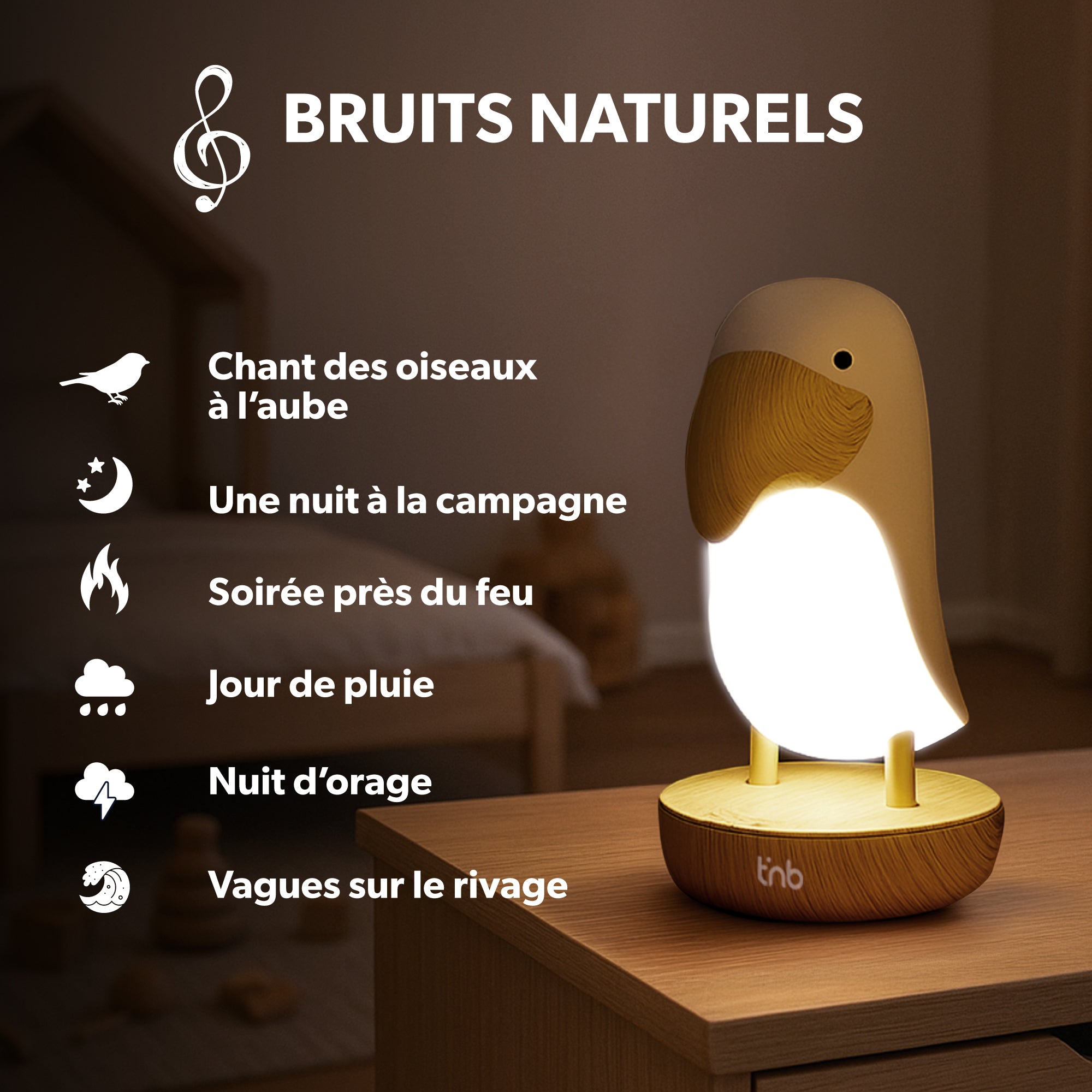 Añade sonidos relajantes a este ambiente luminoso. El tucán permite reproducir 6 ruidos blancos diferentes: estos sonidos, con la misma intensidad en un rango de frecuencias, producen un sonido constante con un efecto relajante y calmante. Así, promueven la relajación y el sueño. El tucán también ofrece una melodía infantil, como una "caja de música".
