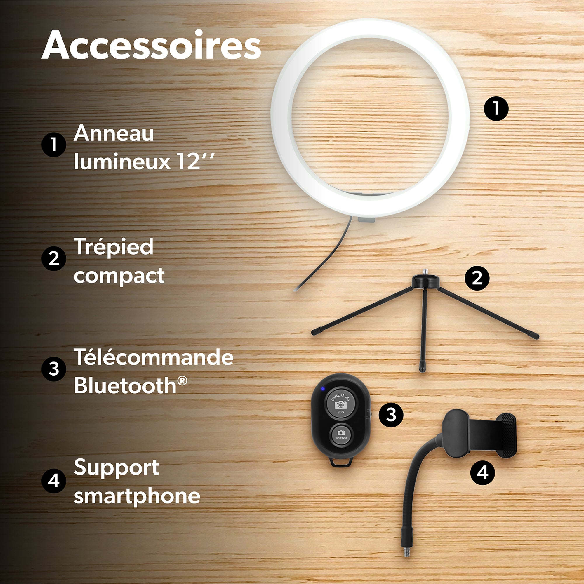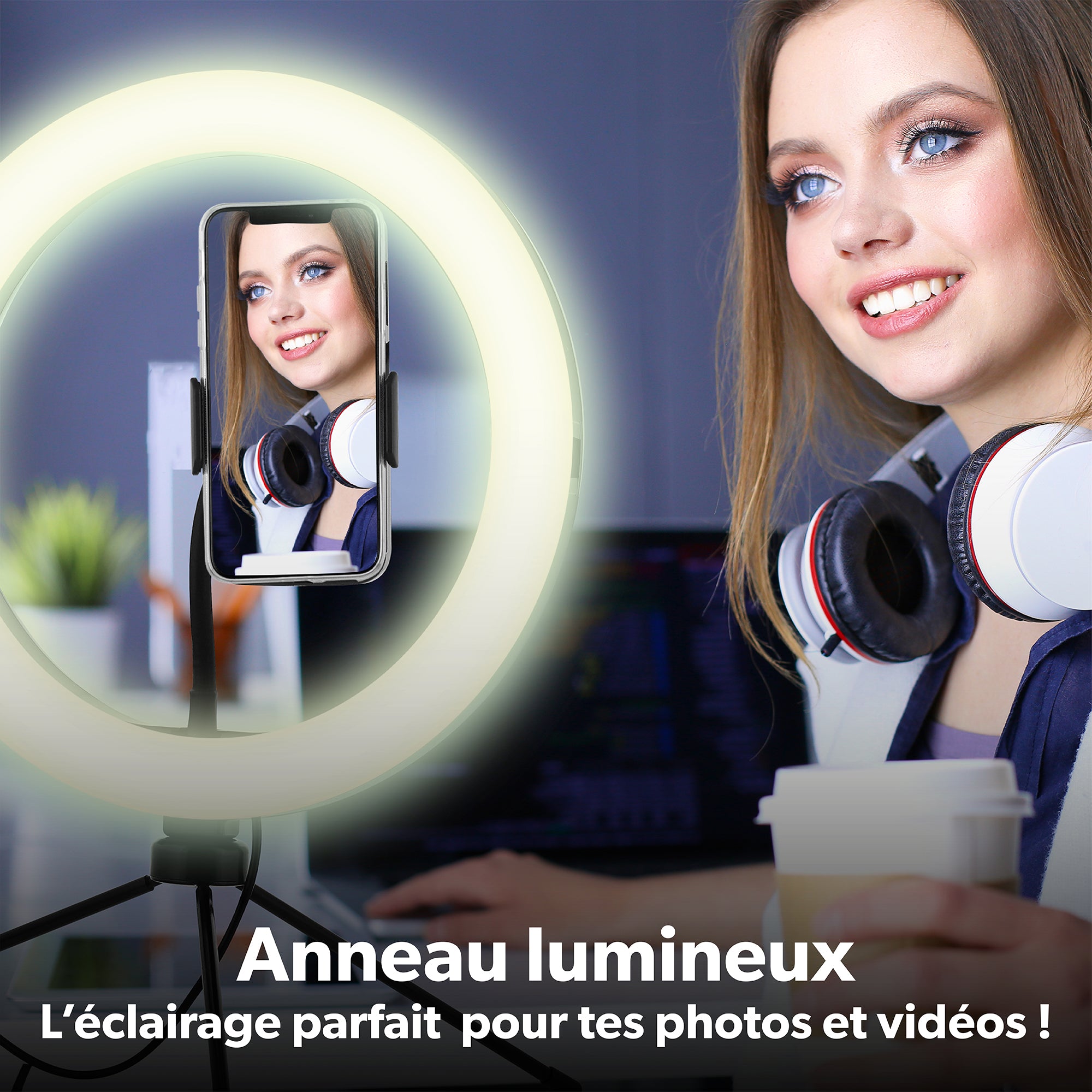 Este anillo de luz con un diámetro de 10" es el accesorio indispensable para sus grabaciones de vídeo. La construcción en forma de anillo permite una difusión uniforme de la luz, lo que evita diferencias de contraste y, por lo tanto, no deja sombras visibles en el plano. El soporte para teléfono inteligente es flexible y por lo tanto Ajustable para una colocación óptima. Además, el soporte se coloca en el centro del anillo. Así, la luz se emite por igual en todo el lente, lo que permite obtener un brillo claro y equilibrado desde todos los ángulos. integrado en el cable, que permite encenderlo y apagarlo y navegar entre las 3 opciones de luz (luz cálida, luz intermedia, luz fría), además de ajustar el nivel de brillo. Se incluye un mando a distancia Bluetooth, para controlar. el teléfono inteligente y tome sus fotos de forma remota. El anillo se coloca sobre un mini trípode de metal cuyo ángulo es ajustable para colocarlo a la altura adecuada. El anillo de luz se alimenta mediante el cable USB adjunto.