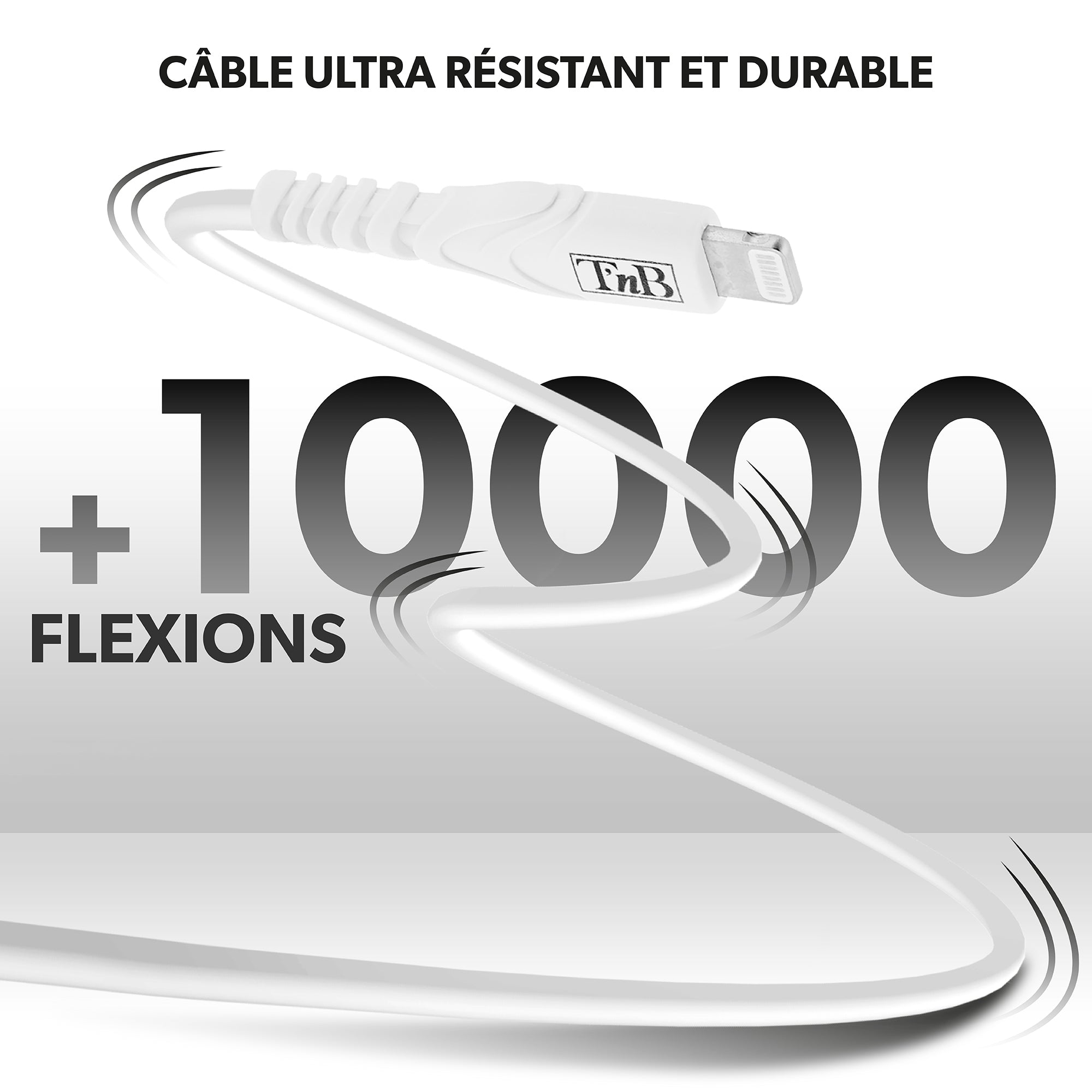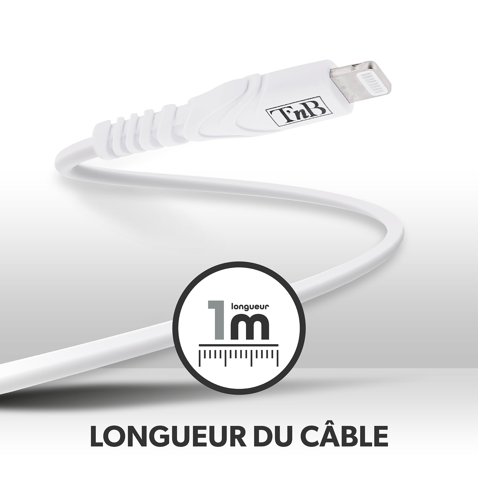 Este cable te permite cargar y sincronizar tu iPhone a muy alta velocidad. Gracias a su tecnología de carga rápida Power Delivery (PD), alcanza una velocidad de carga de 60W. Por lo tanto, es ideal para cargar su iPhone 12, que admite 20 W. Cargarás tu iPhone compatible al 50% en 30 minutos y al 80% en 1 hora. Sus conectores reforzados te brindan una mayor resistencia del cable incluso con un uso intenso. Todos los cables T'nB Lightning® están probados y aprobados por Apple®, garantía de su alta calidad. Cable USB/Lightning para cargar y sincronizar con licencia Apple®: - iPhone 12 mini / iPhone 12 / iPhone 12 Pro / iPhone 12 Pro Max / iPhone SE / iPhone 11 pro max / iPhone 11 pro / iPhone 11 / iPhone XS max / iPhone XR / iPhone XS / iPhone (12/9 pulgadas) / iPad Pro (9,7 pulgadas) / iPad mini 4 / iPad mini 3 / iPad air 2 / iPad Air / iPad mini 2 / iPad mini / iPad (4.ª generación) - iPod touch (sexta generación) / iPod touch (quinta generación) / iPod nano (séptima generación)