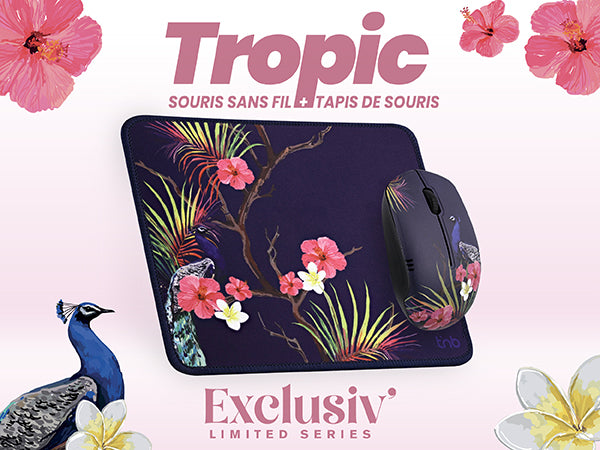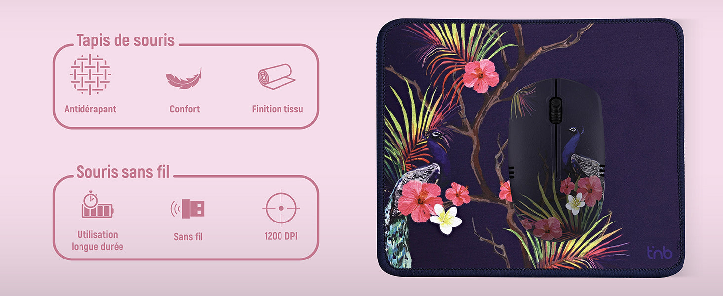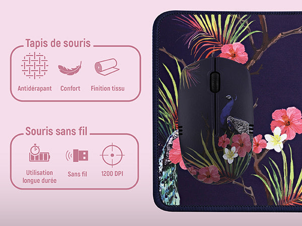 Transforma tu espacio de trabajo con nuestro pack Tropic. Este conjunto incluye un elegante mouse inalámbrico y una alfombrilla de mouse a juego, con un hermoso pavo real rodeado de flores vibrantes sobre un fondo azul profundo. El ratón ergonómico proporciona una navegación suave y sin esfuerzo, mientras que la alfombrilla garantiza un seguimiento preciso y cómodo. Ideal para quienes buscan agregar un toque de sofisticación y color a su oficina, el Tropic Pack combina estilo y funcionalidad para una experiencia de trabajo placentera y estéticamente agradable.