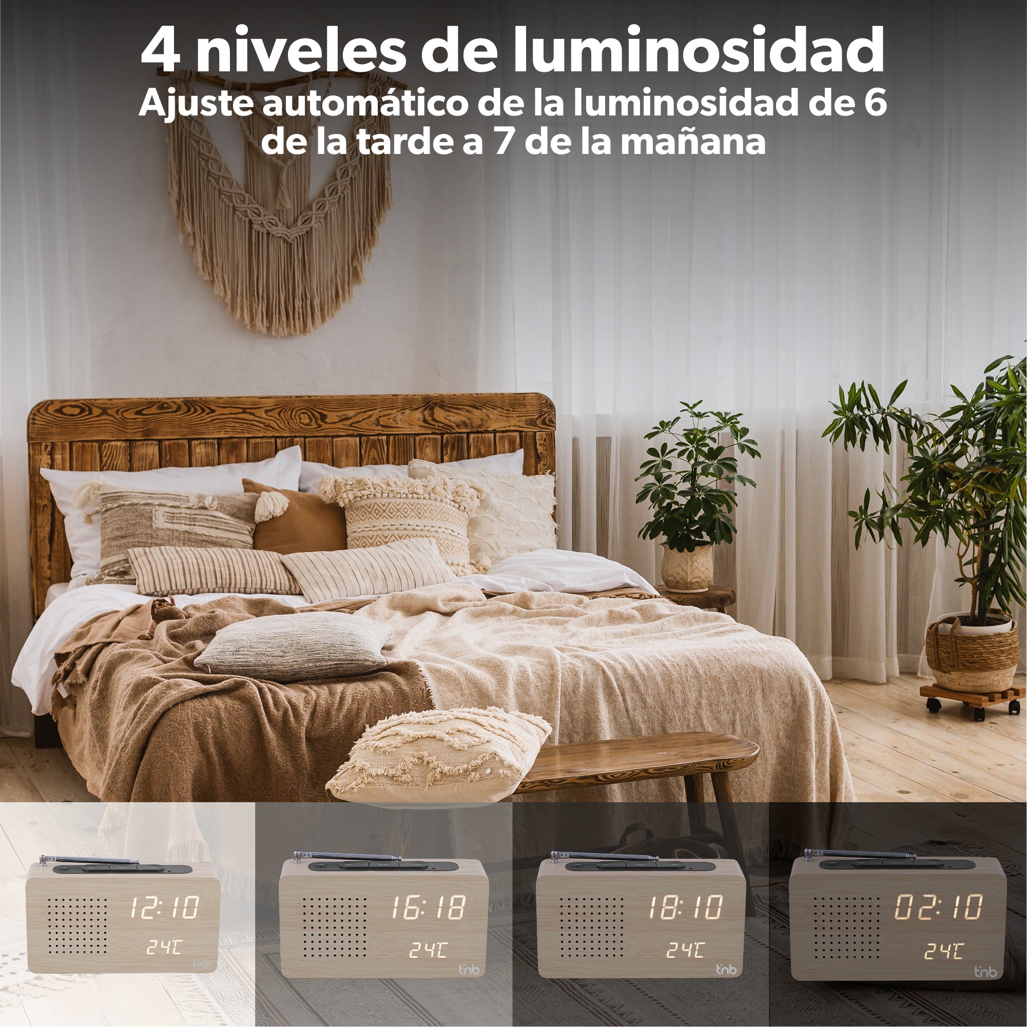 El despertador tiene 3 niveles de brillo y ajuste automático entre las 18h y las 7h para adaptar el brillo a la luz del entorno.