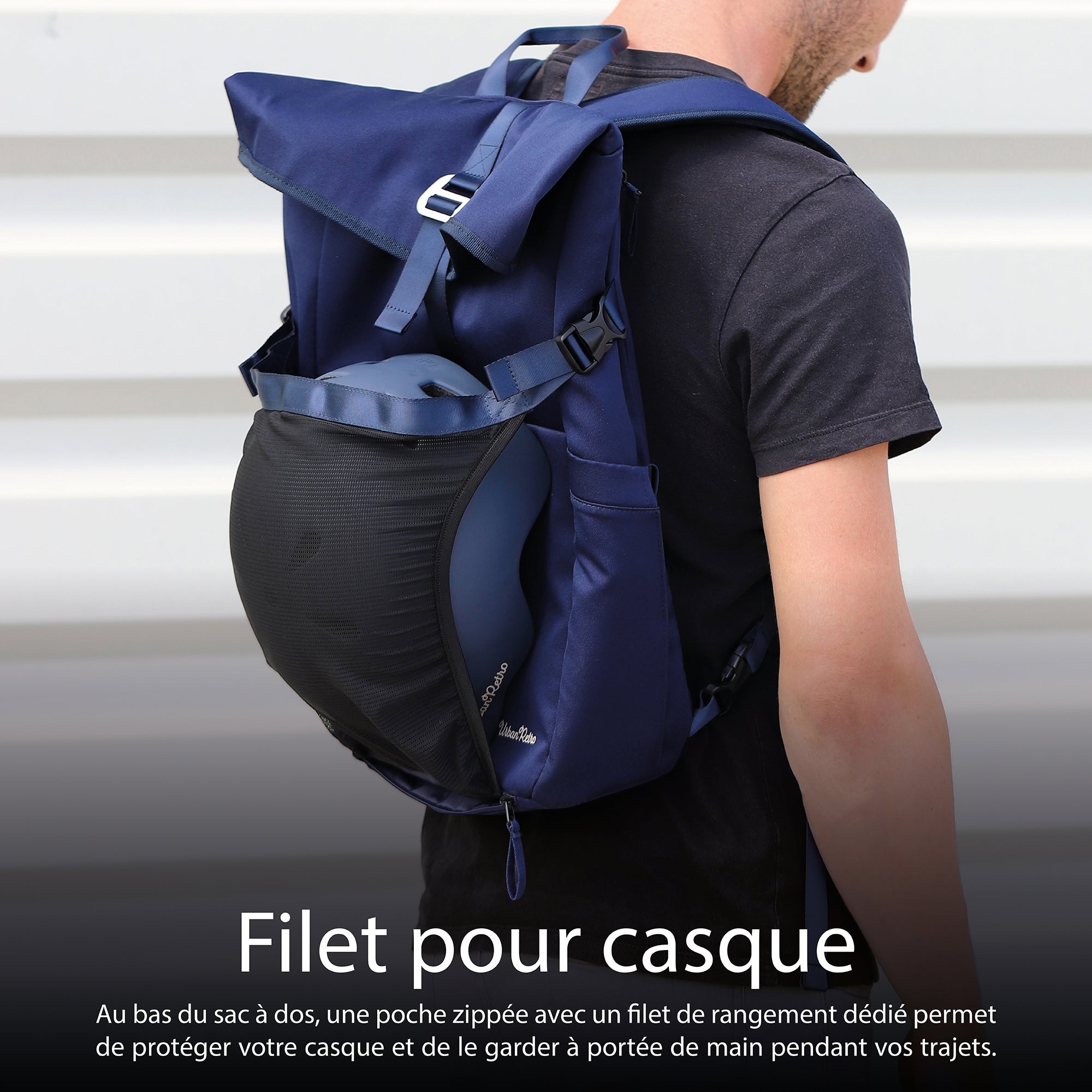 En la parte inferior de la mochila, en un bolsillo con cremallera, hay una red para guardar el casco.