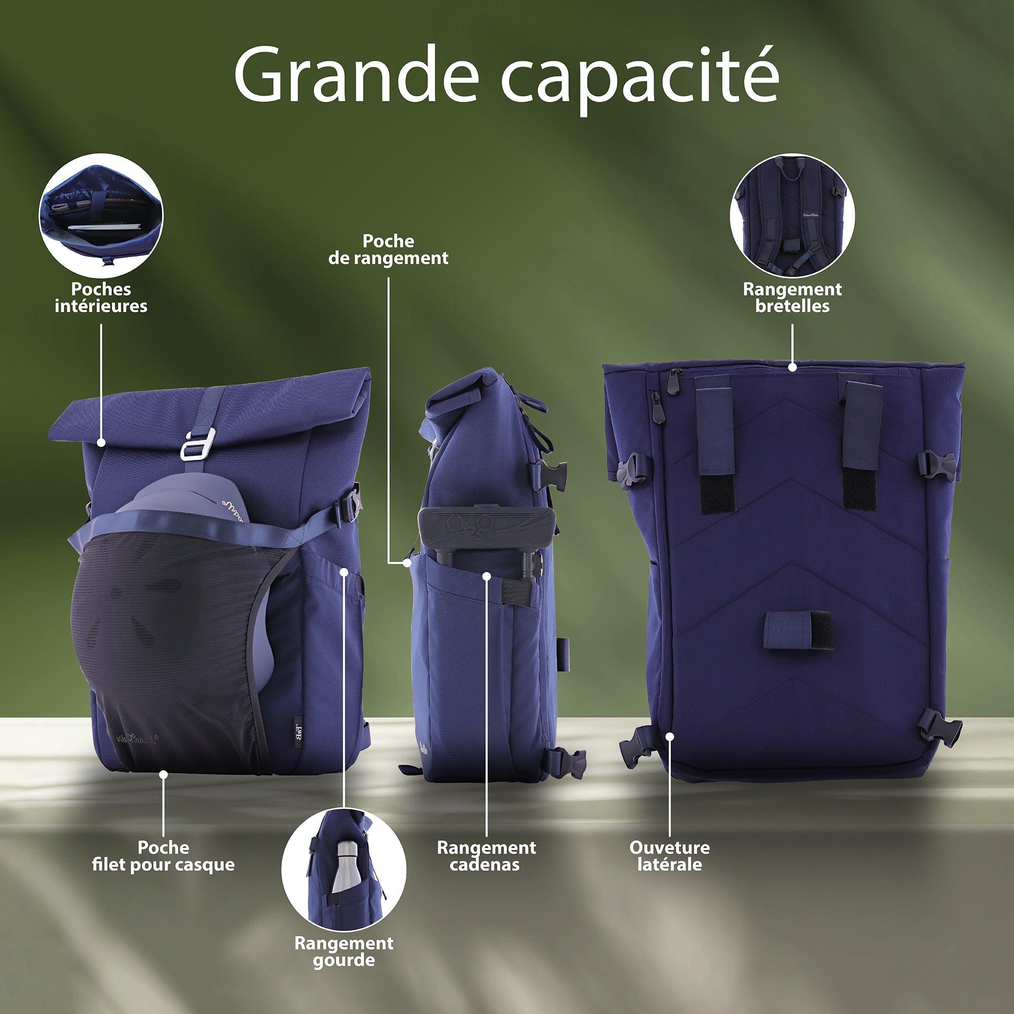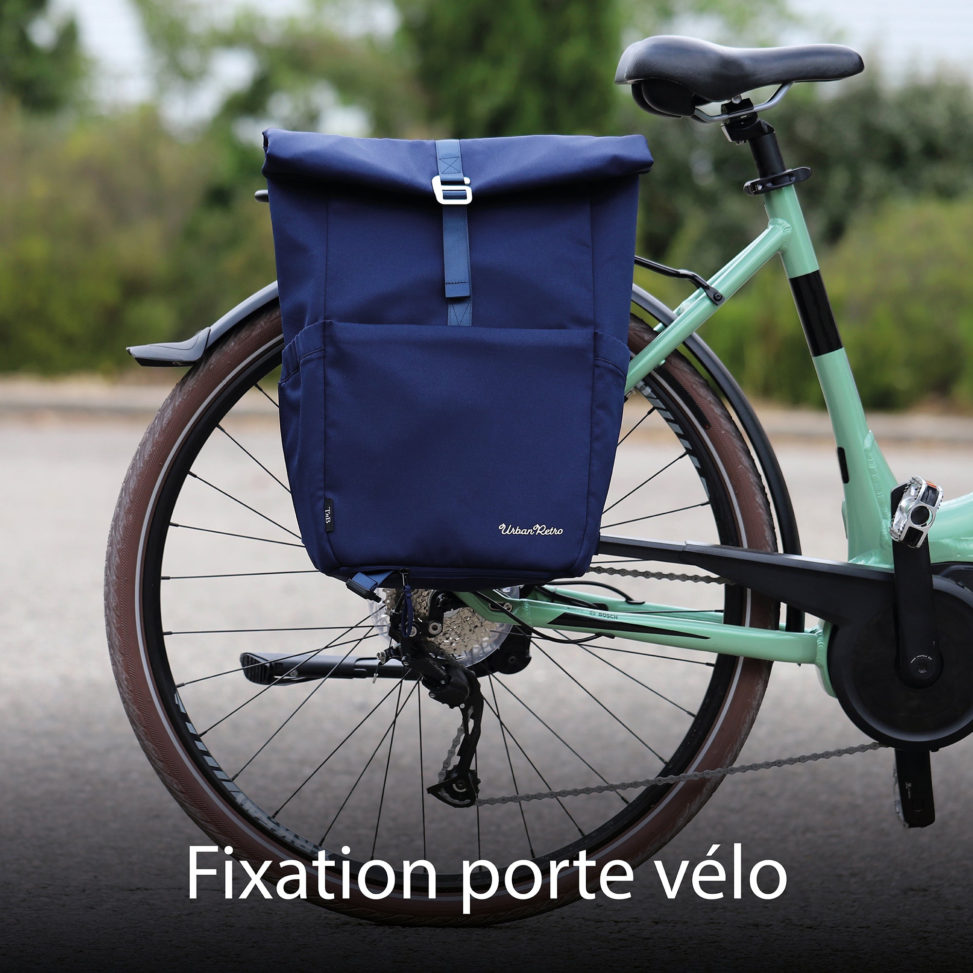 En la parte trasera, la mochila cuenta con dos correas de hombro ultracómodas y una correa para el pecho. Las correas son retráctiles y se guardan fácilmente en la parte trasera para asegurar la mochila al portaequipajes lateral.