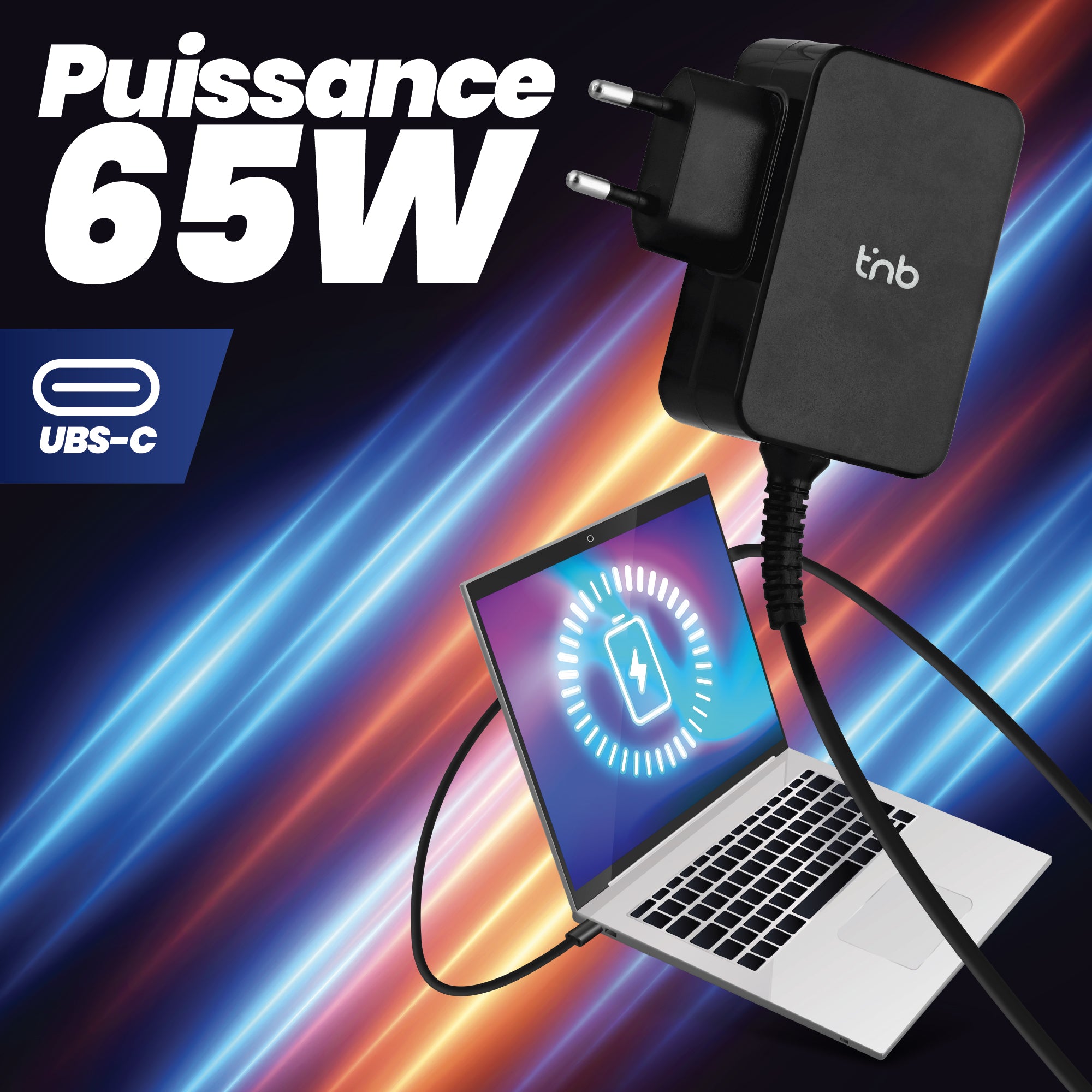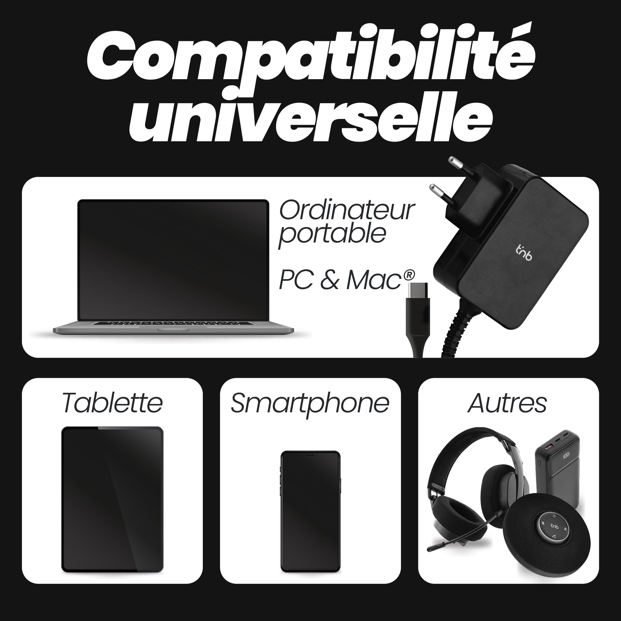 Cargador USB-C de 65 W con toma de pared. Dimensiones compactas para llevarlo a cualquier parte. Le permite cargar todos sus dispositivos, teléfonos inteligentes, tabletas, computadoras. Su cable de 180 cm te permite una gran flexibilidad en tu instalación, estés donde estés.