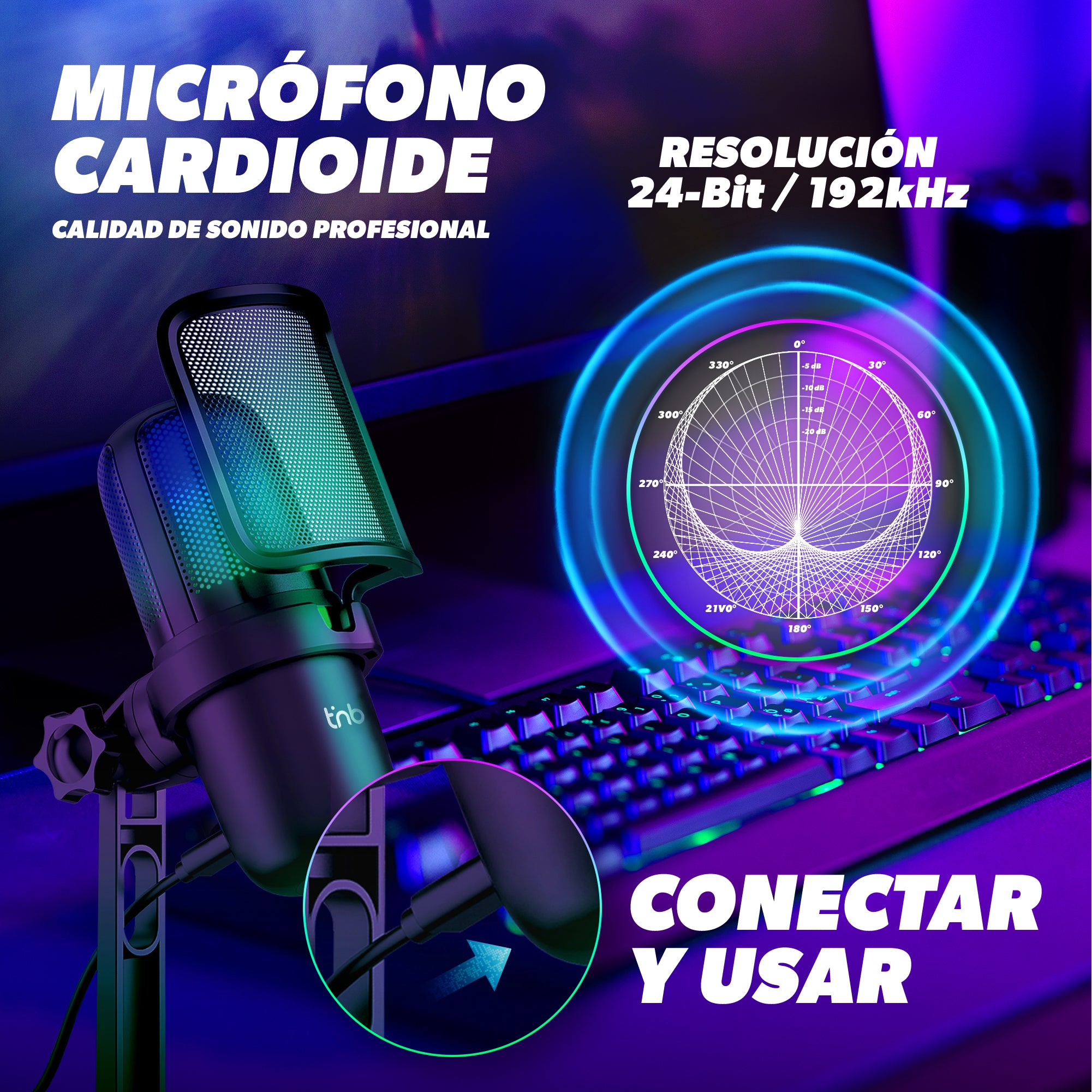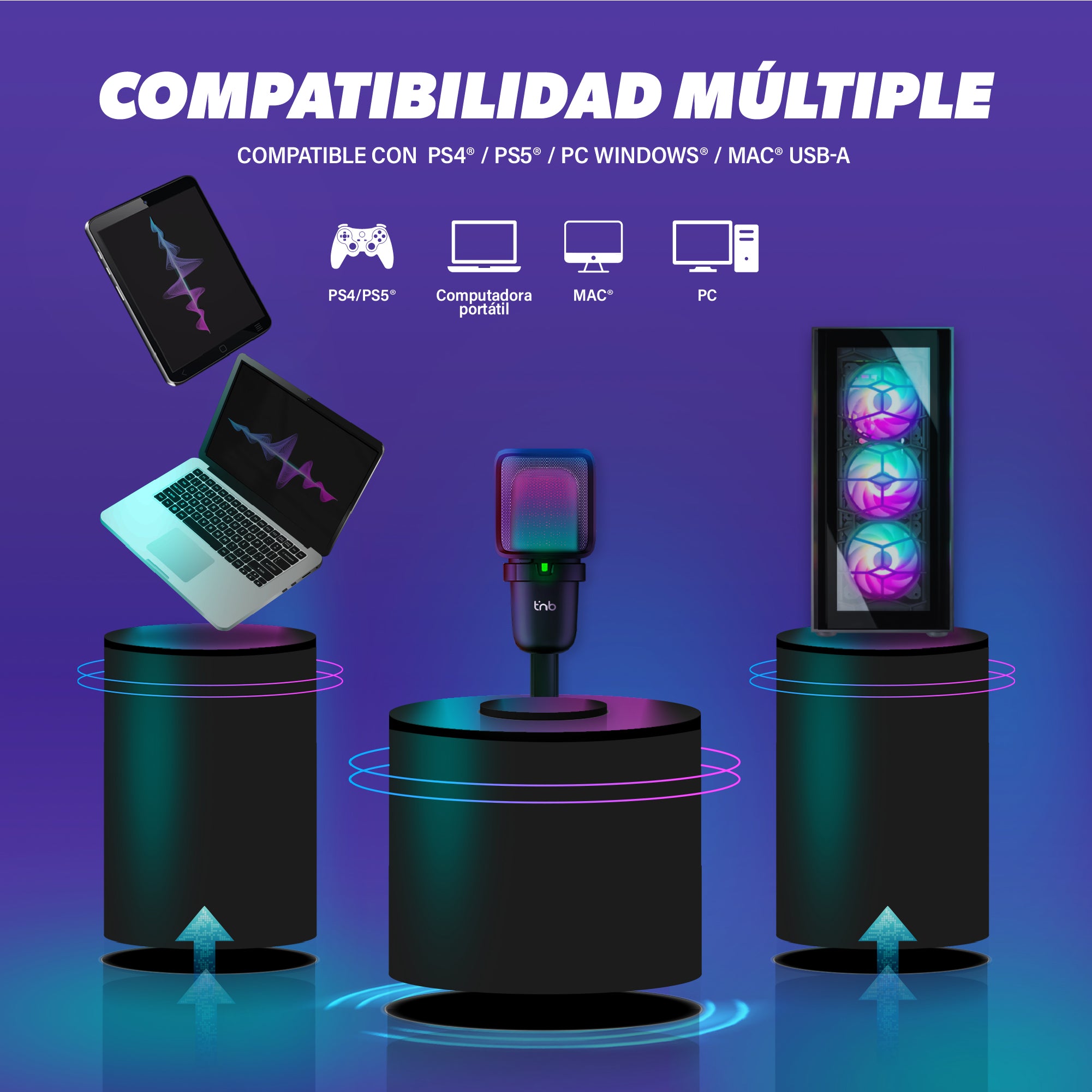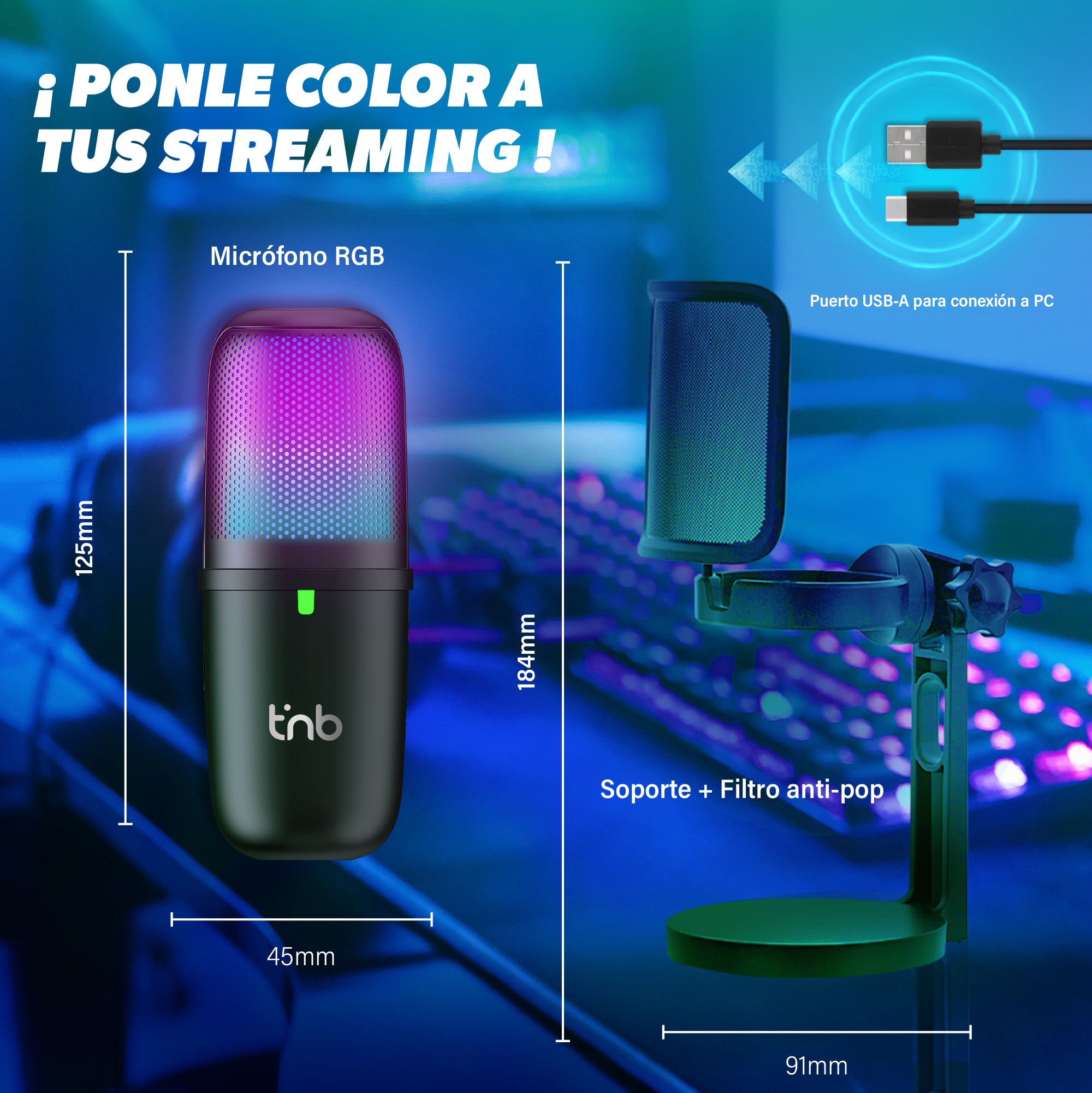 Este micrófono de condensador unidireccional te ofrece una iluminación RGB dinámica mientras transmites o juegas. Los cambios de color son programables. Equipado con un soporte antivibración y un filtro antipop metálico, reduce las vibraciones en el escritorio y elimina los molestos ruidos explosivos para una transmisión óptima a todos tus suscriptores y oyentes. El botón táctil y el indicador LED frontal te permiten ver, activar o desactivar el modo silencio. Con su sencilla instalación plug-and-play, simplemente conéctalo a tu ordenador Windows, MacBook o PS4 y empieza a transmitir y jugar al instante.
