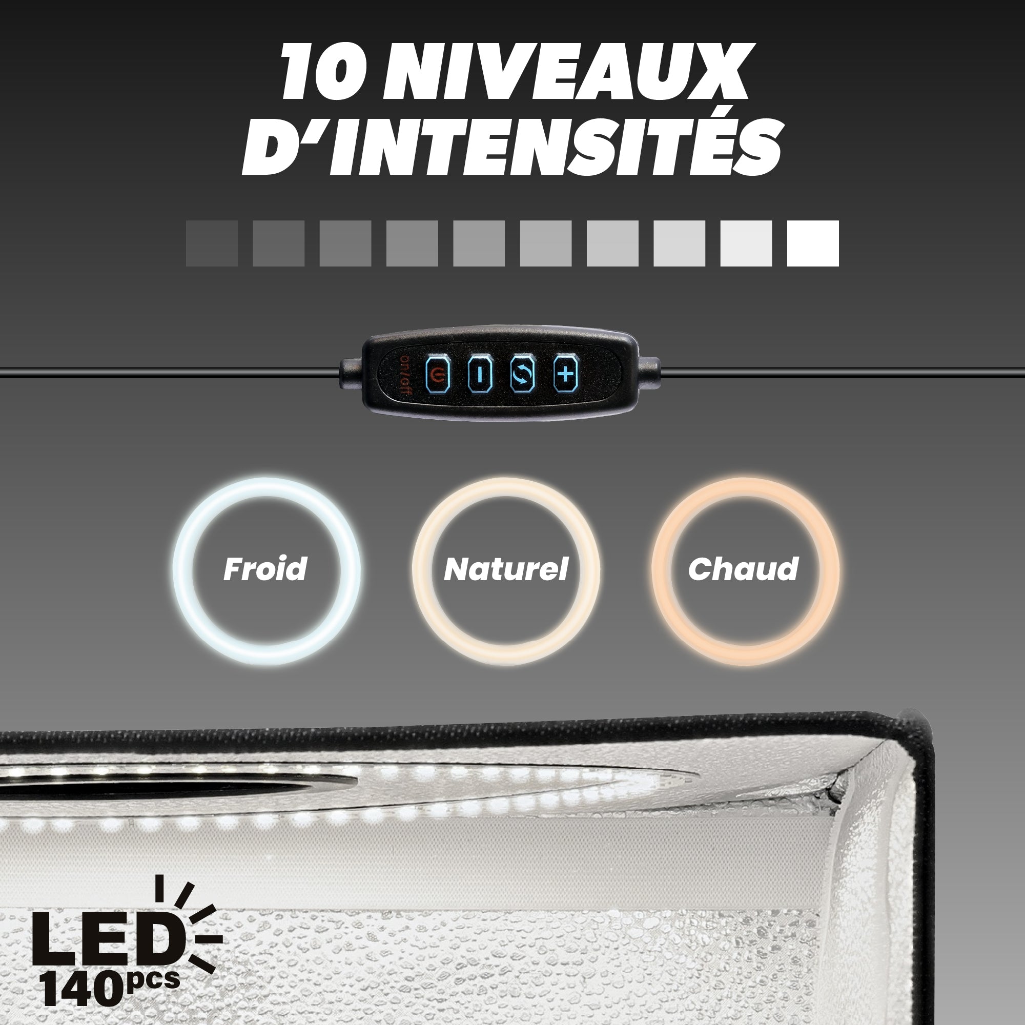 - Les parois réfléchissantes qui créent une diffusion de lumière harmonisée 360° sur l'objet
