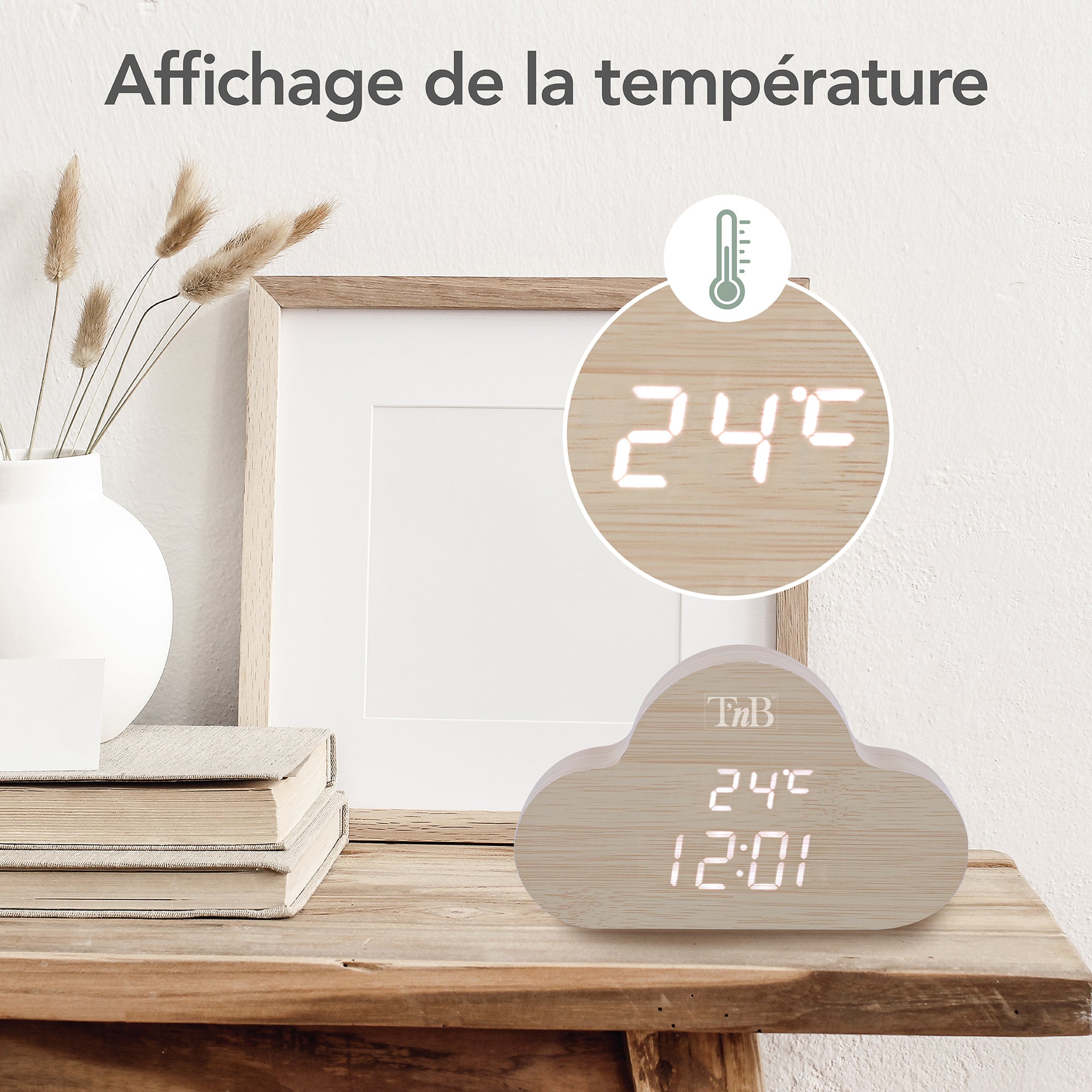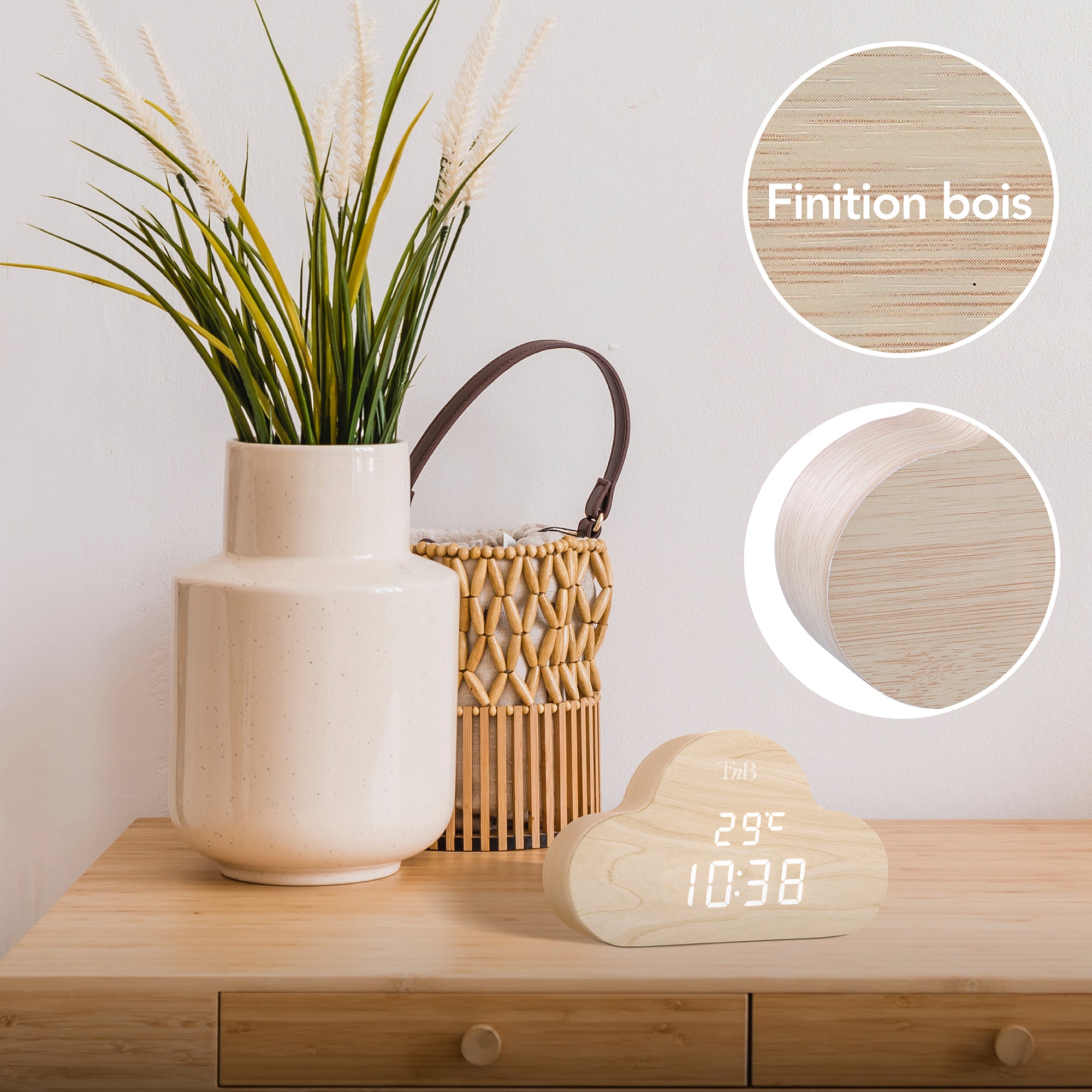 ¡Añade un toque moderno a tu interior con este reloj despertador LED con acabado de madera en forma de nube!
