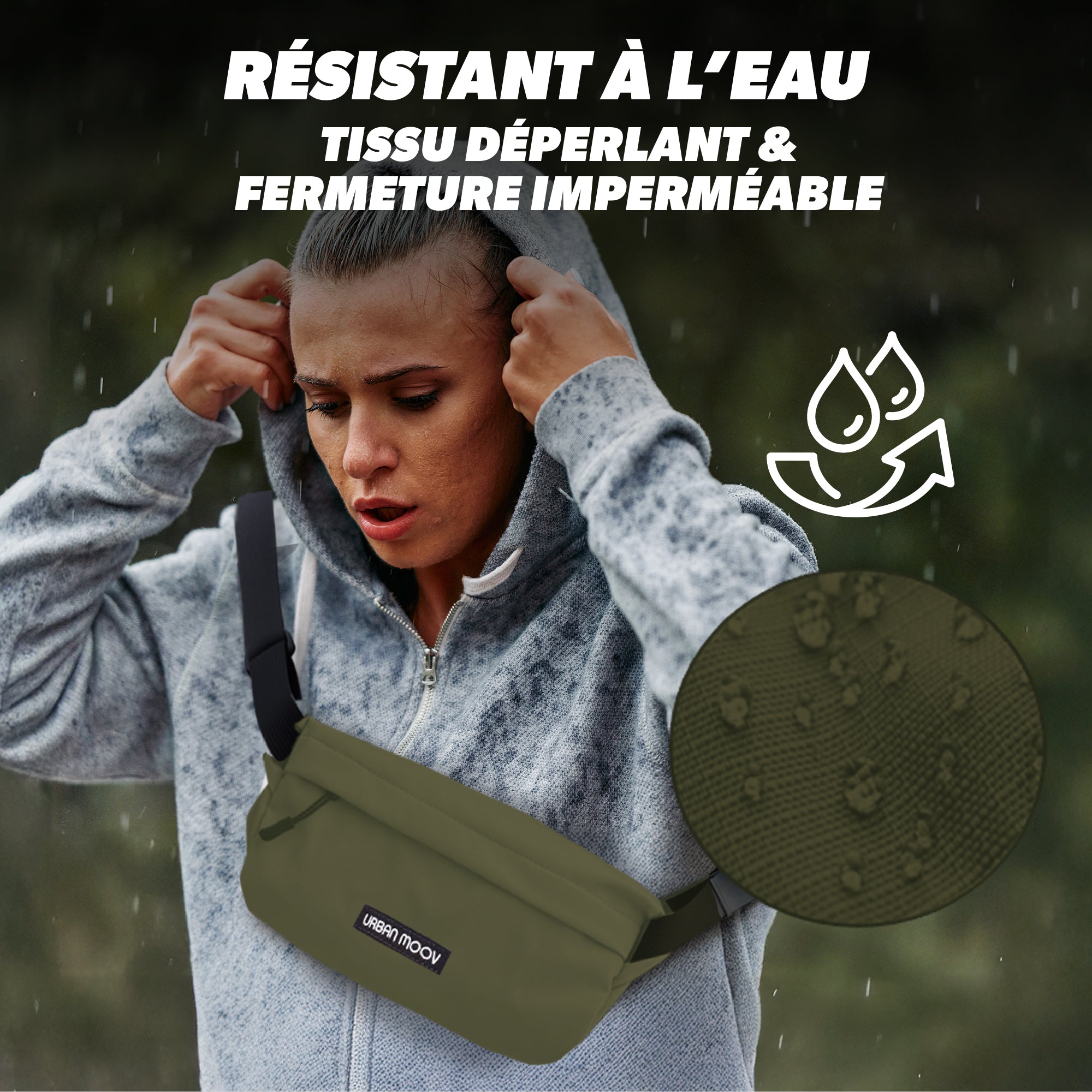 Tejido resistente al agua y cierre principal impermeable.