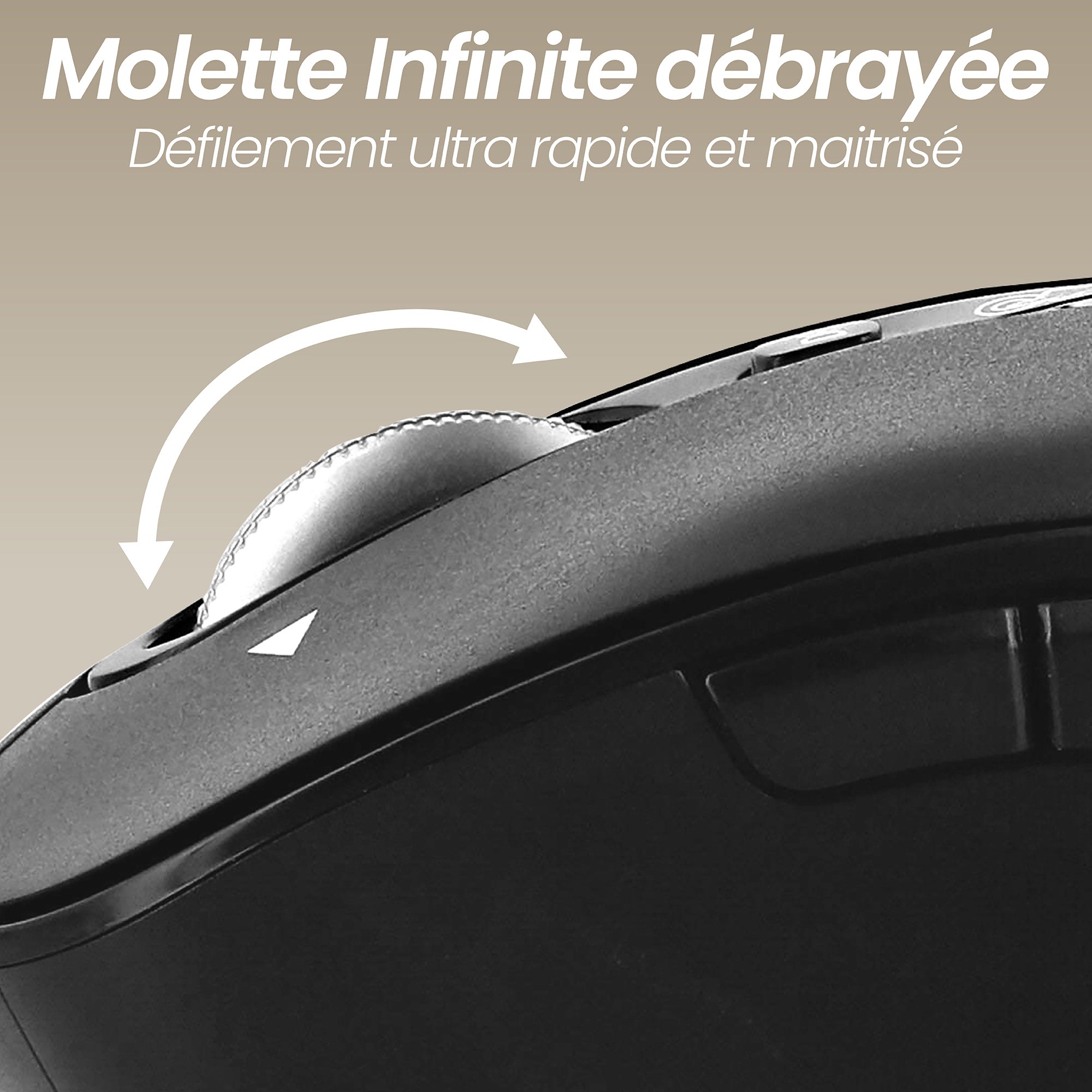 Ratón inalámbrico recargable INFINITE con rueda de desplazamiento extraíble. Desplázate ultrarrápido con un simple clic de la rueda.