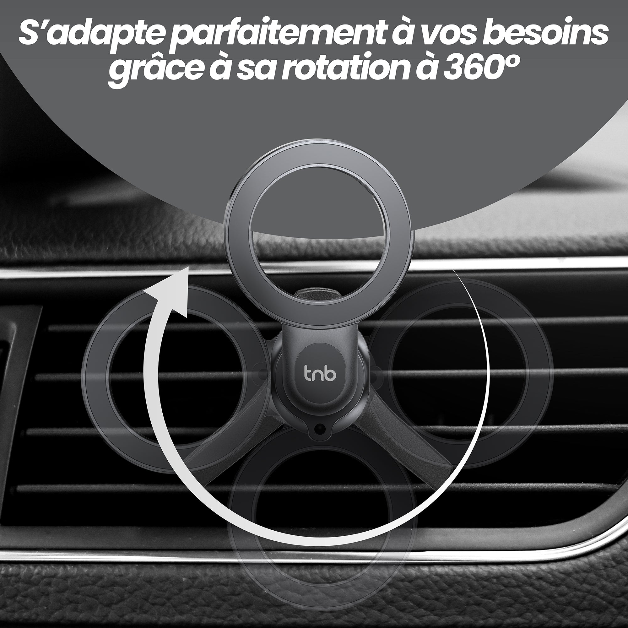 Este soporte magnético ultracompacto y elegante se fija fácilmente a la rejilla de ventilación de tu vehículo. Te permite acceder a tu smartphone con un solo movimiento, garantizando un uso cómodo y seguro en el coche.