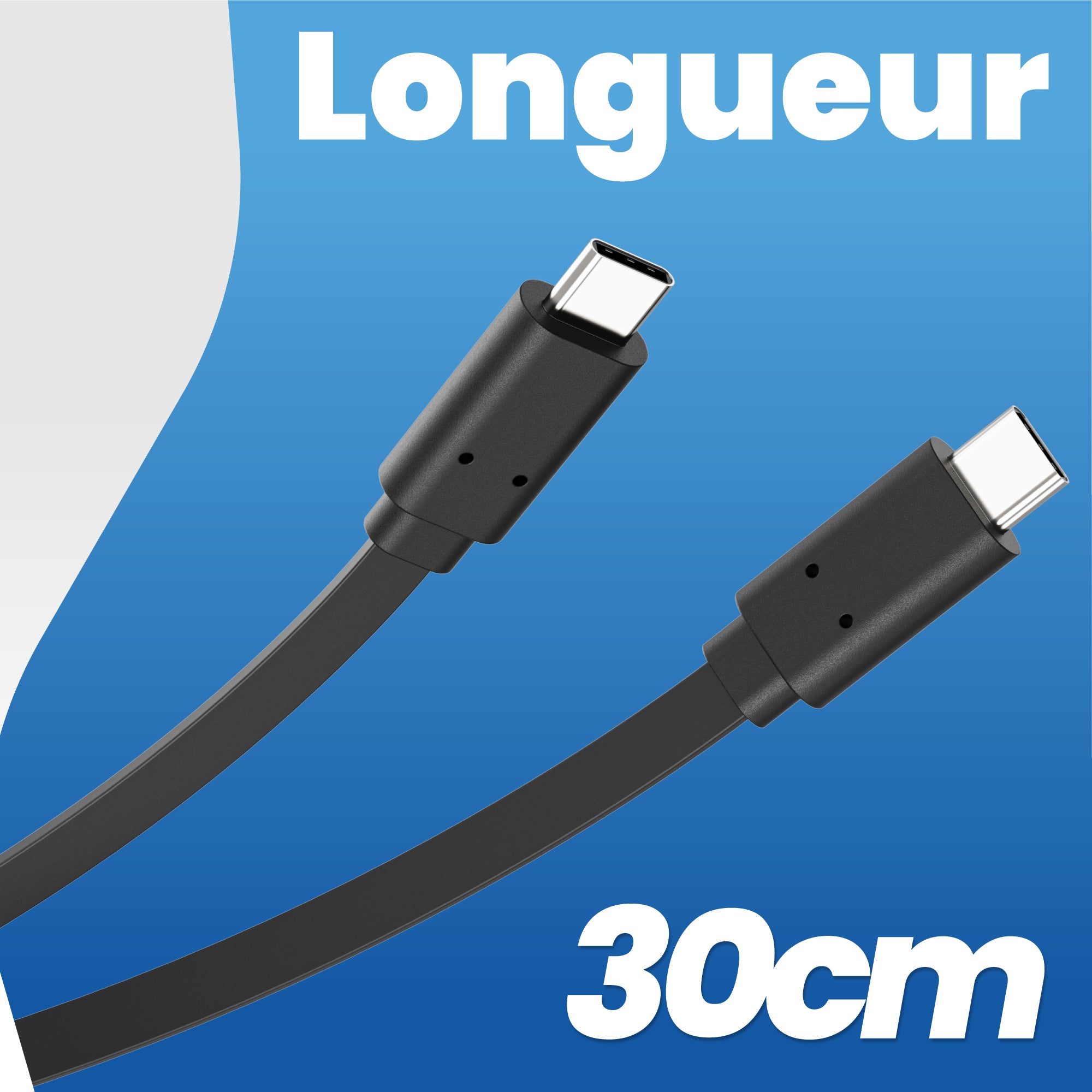 Ce câble USB Type-C vers USB Type-C plat de 30 cm est fait pour vous. Il se range facilement et prend peu de place grâce à sa structure plate facile à tordre et à plier.