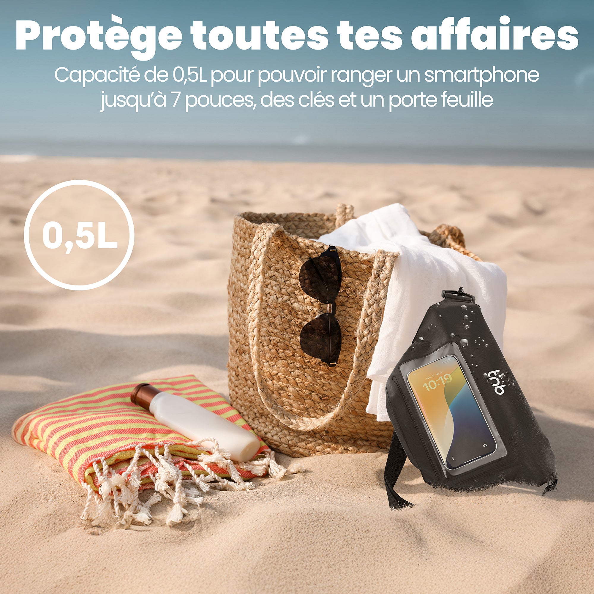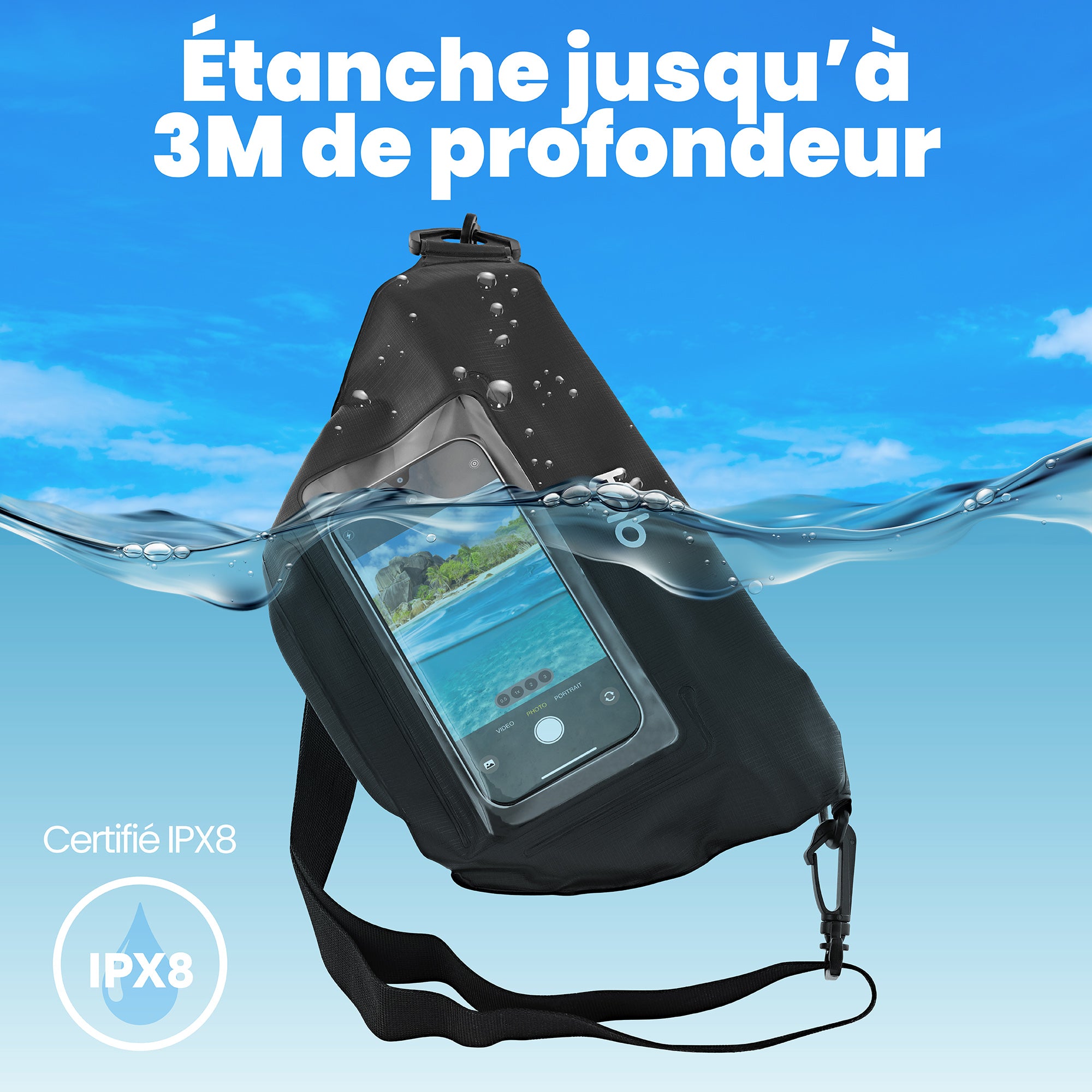 Sa sangle ajustable et détachable vous permet de la porter autour de la taille ou en bandoulière, selon vos préférences. C’est l’accessoire idéal pour les sorties à la plage, les activités nautiques, le ski, ou tout simplement pour garder vos objets de valeur au sec en toute circonstance.