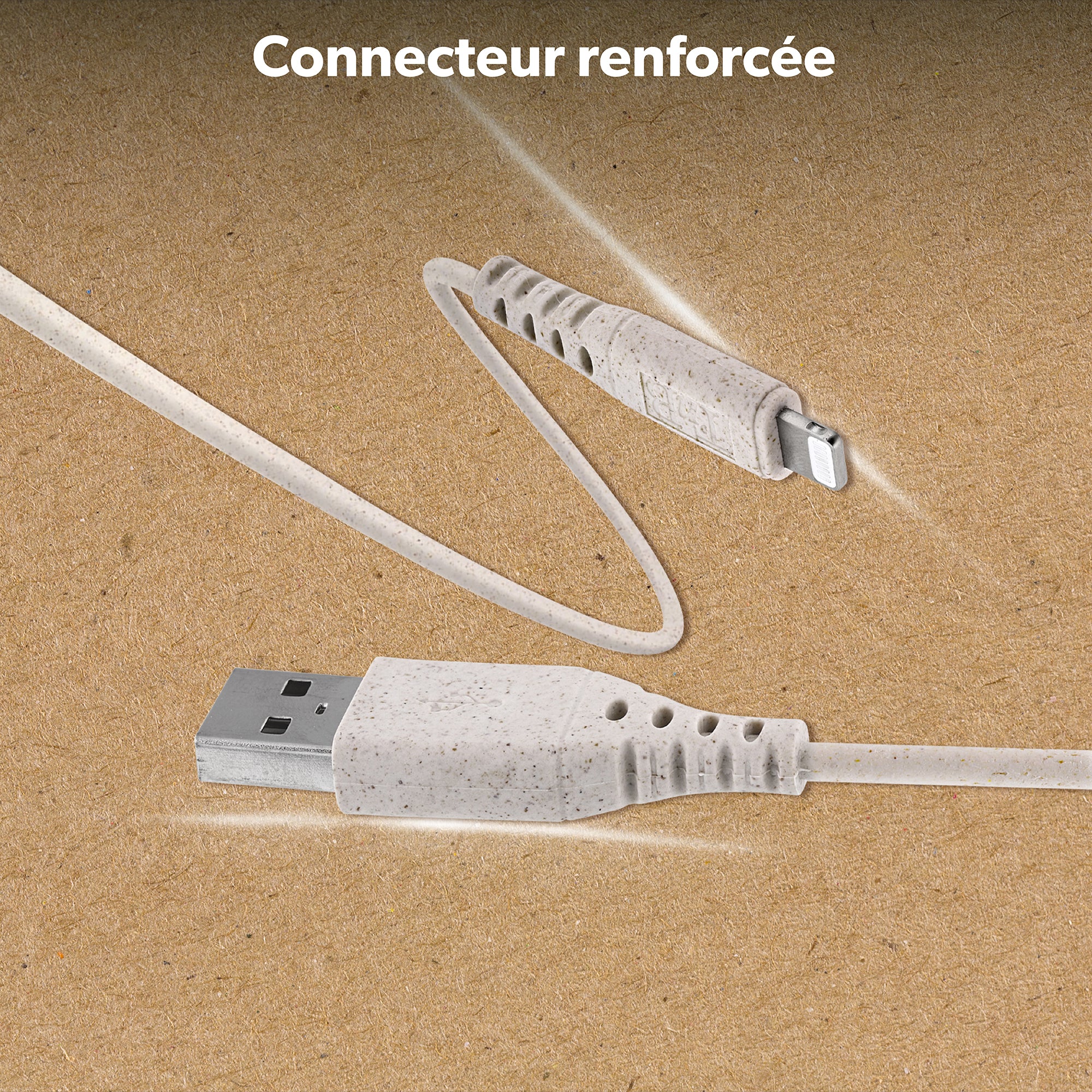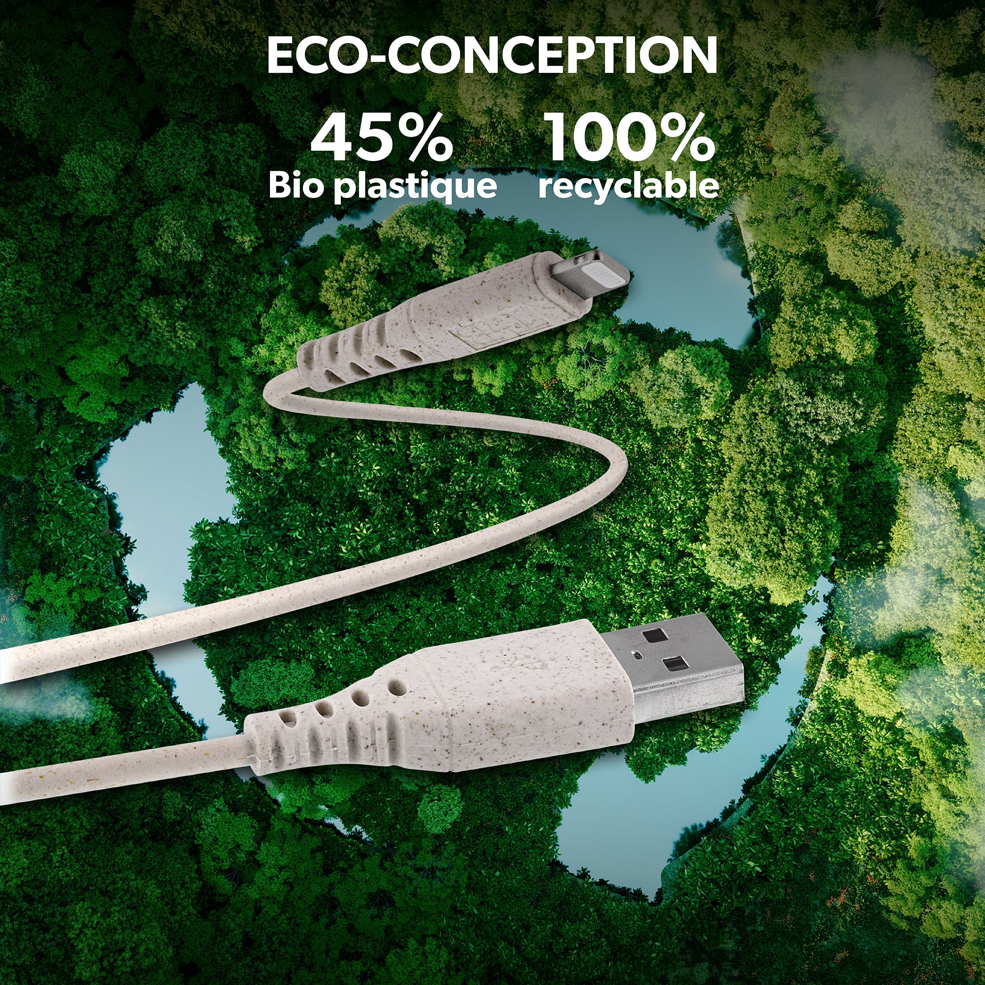 Ce câble est composé à 45% de bioplastique ce qui entraîne une réduction de l'utilisation du plastique dans sa conception. Le plastique qui entre dans la composition de ce câble est en TPE, qui est aujourd'hui le plastique le plus facile à recycler.