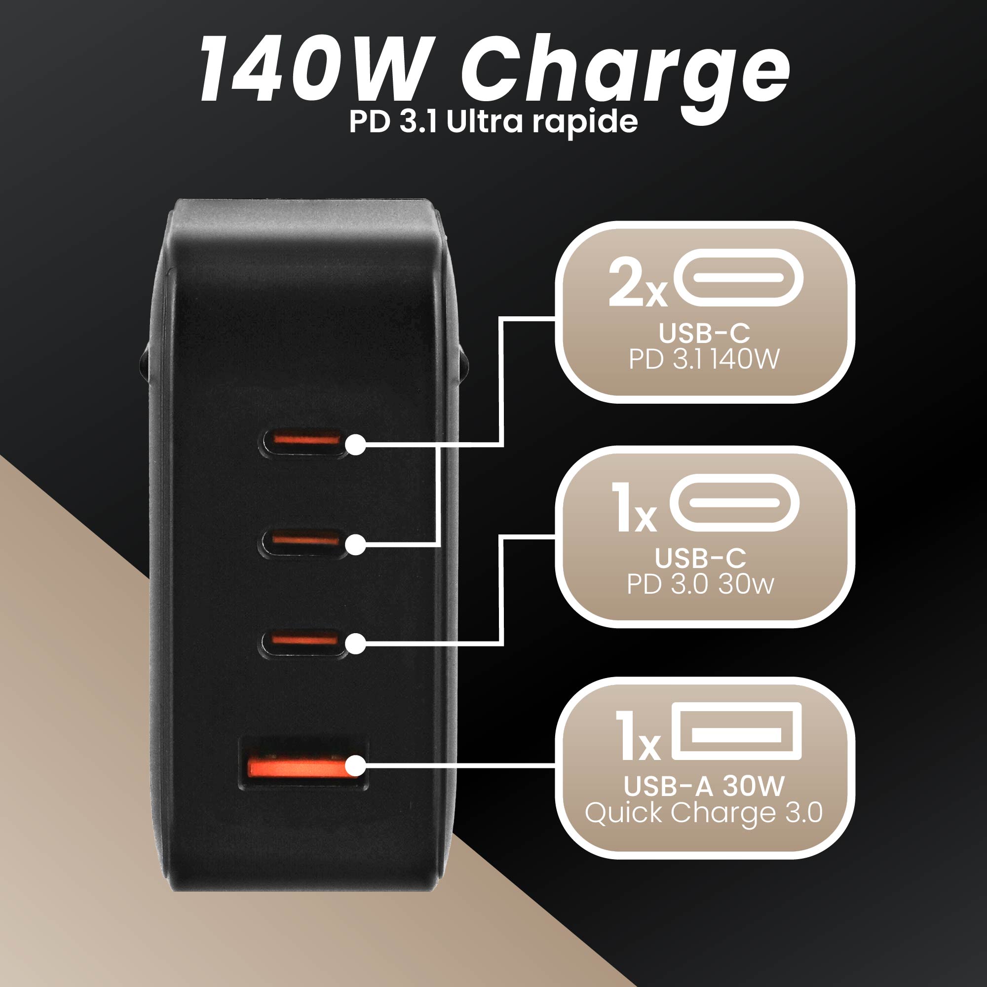 • Puissance max : jusqu’à 140W USB-C + 25W USB-A pour une charge rapide simultanée.