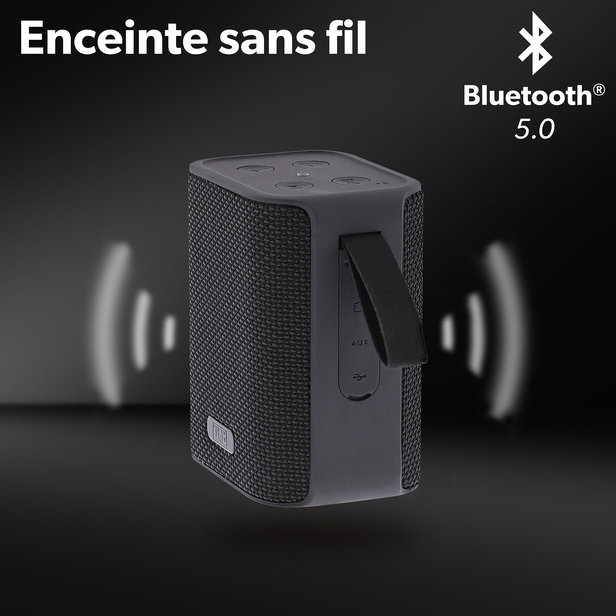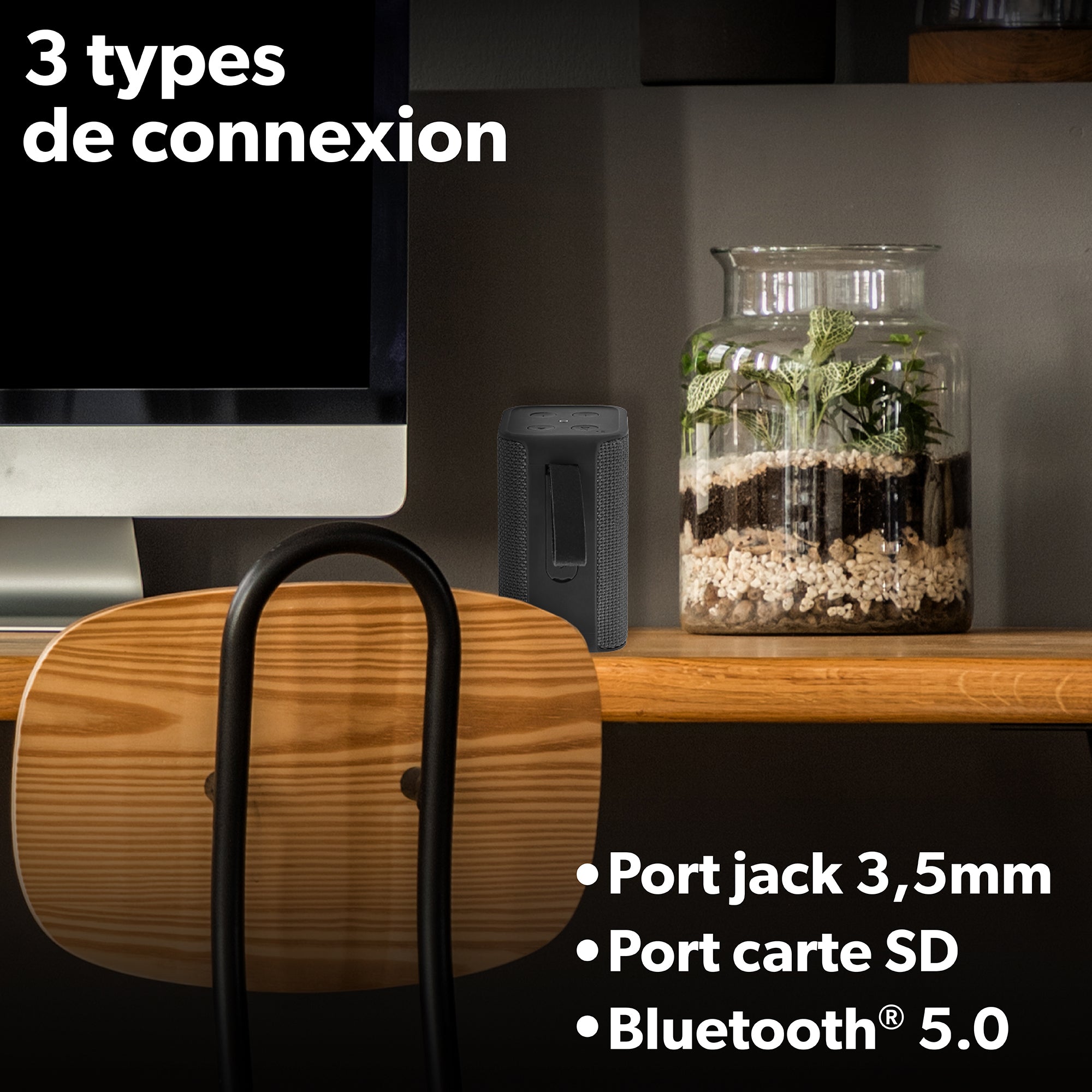Dotée d'une batterie lithium de 1200 mAh (3,7V), votre enceinte se connecte sans fil via la technologie Bluetooth 5.0 avec une portée de 10 mètres maximum, et vous permet d'écouter votre musique avec une autonomie de 10 heures !