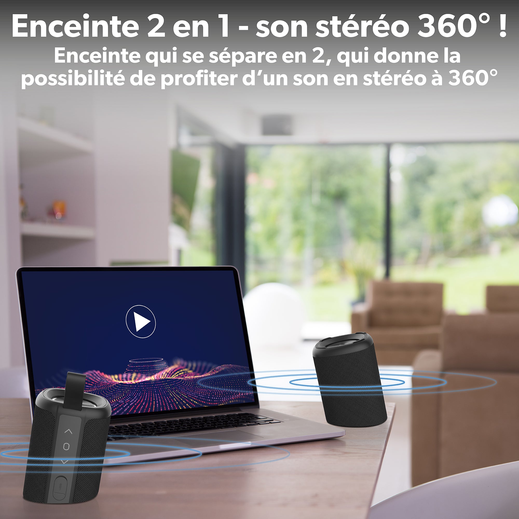 Enceinte Bluetooth Waterproof XPLORE noire, 20 Watts stéréo, avec batterie lithium intégrée, séparable en 2 enceintes de 10W chacune.