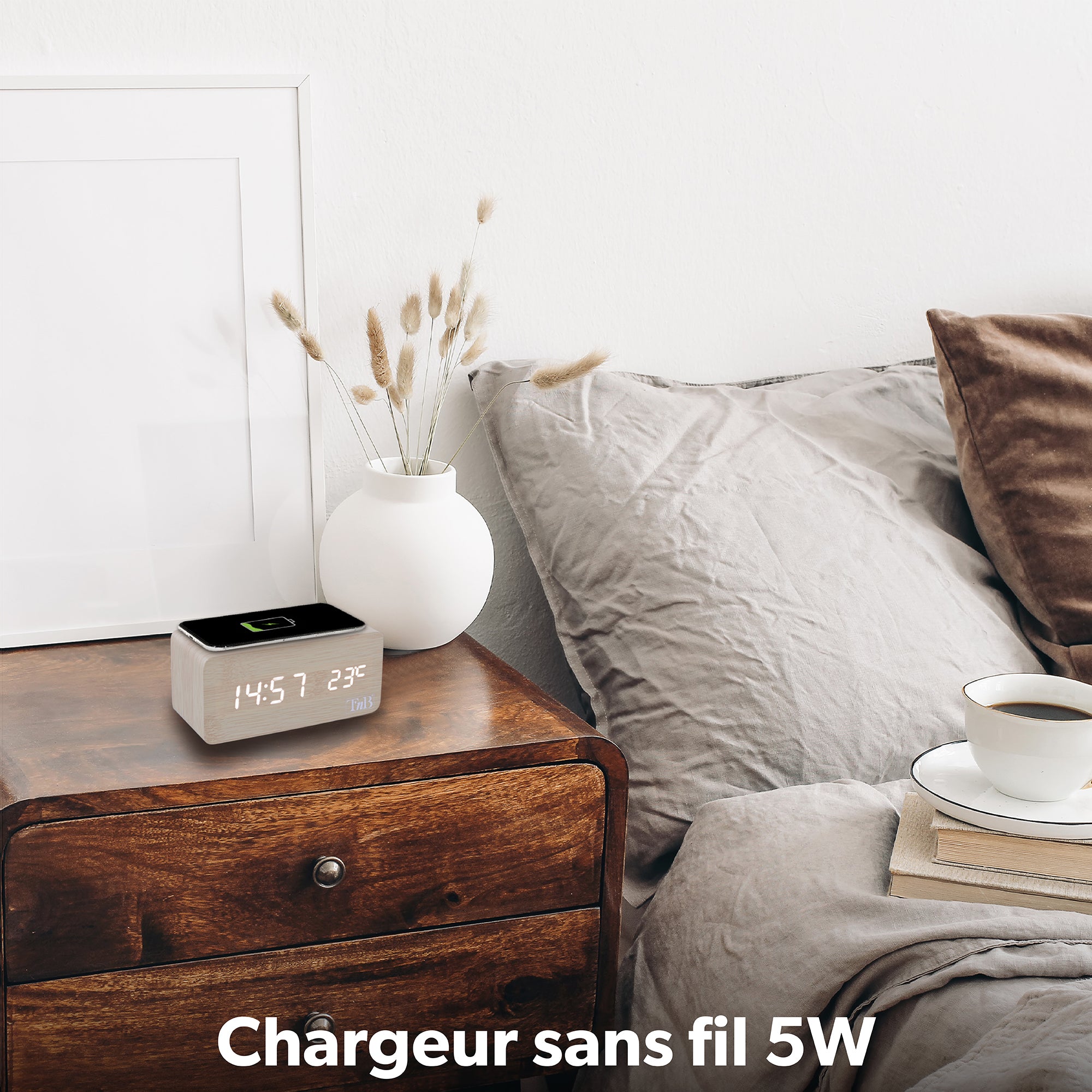 Donnez une touche tendance à votre intérieur avec ce réveil LED finition bois avec chargeur à induction !