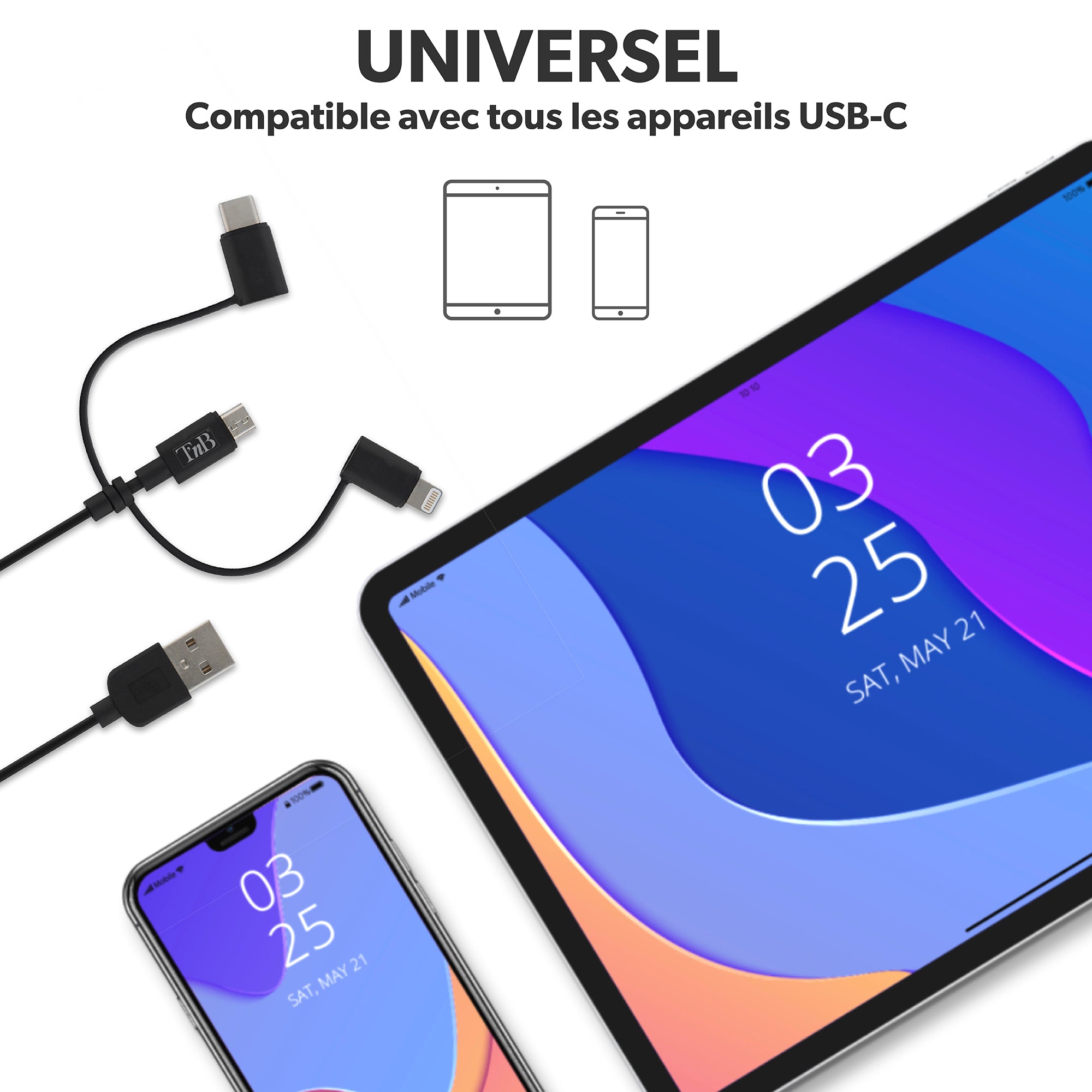 Avec ce câble T'nB 3 en 1 ne cherchez plus quel câble utiliser pour recharger votre téléphone, votre tablette ou votre liseuse.