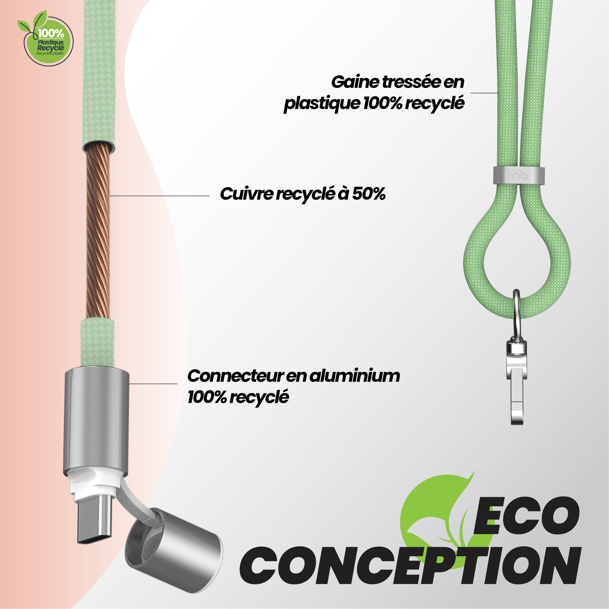 Sa gaine tressée en rPET 100 % recyclé, ses connecteurs en aluminium recyclé et son cuivre à 50% recyclé reflètent un engagement écoresponsable fort. Les embouts métalliques clipsables protègent les connecteurs lorsque le câble n’est pas utilisé. Une plaque de maintien fine et discrète vient se glisser entre votre coque et votre smartphone pour garantir une fixation solide, sans abîmer votre appareil.