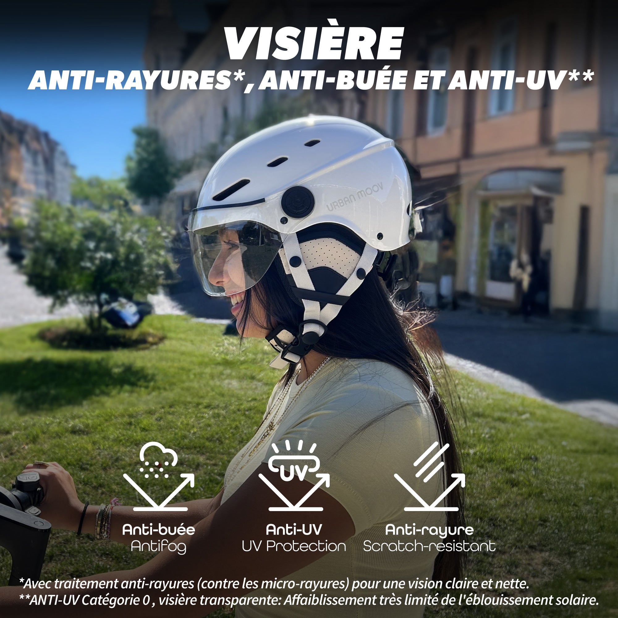 Sa visière transparente est traitée anti-rayures, anti-buée et anti-UV et garantit une visibilité optimale. Elle s'apprécie face au vent, la pluie, la poussière, les insectes quand vous prenez de la vitesse.