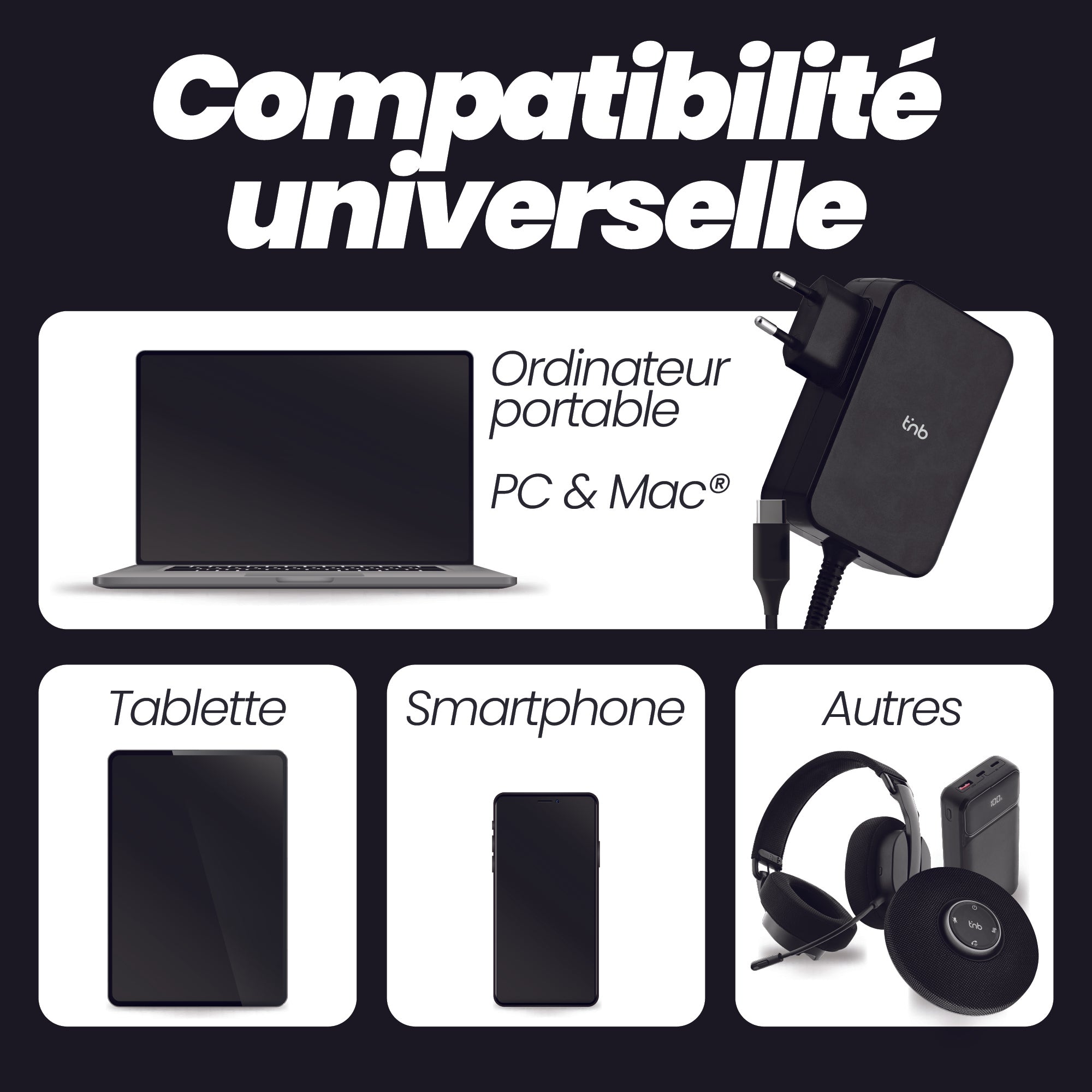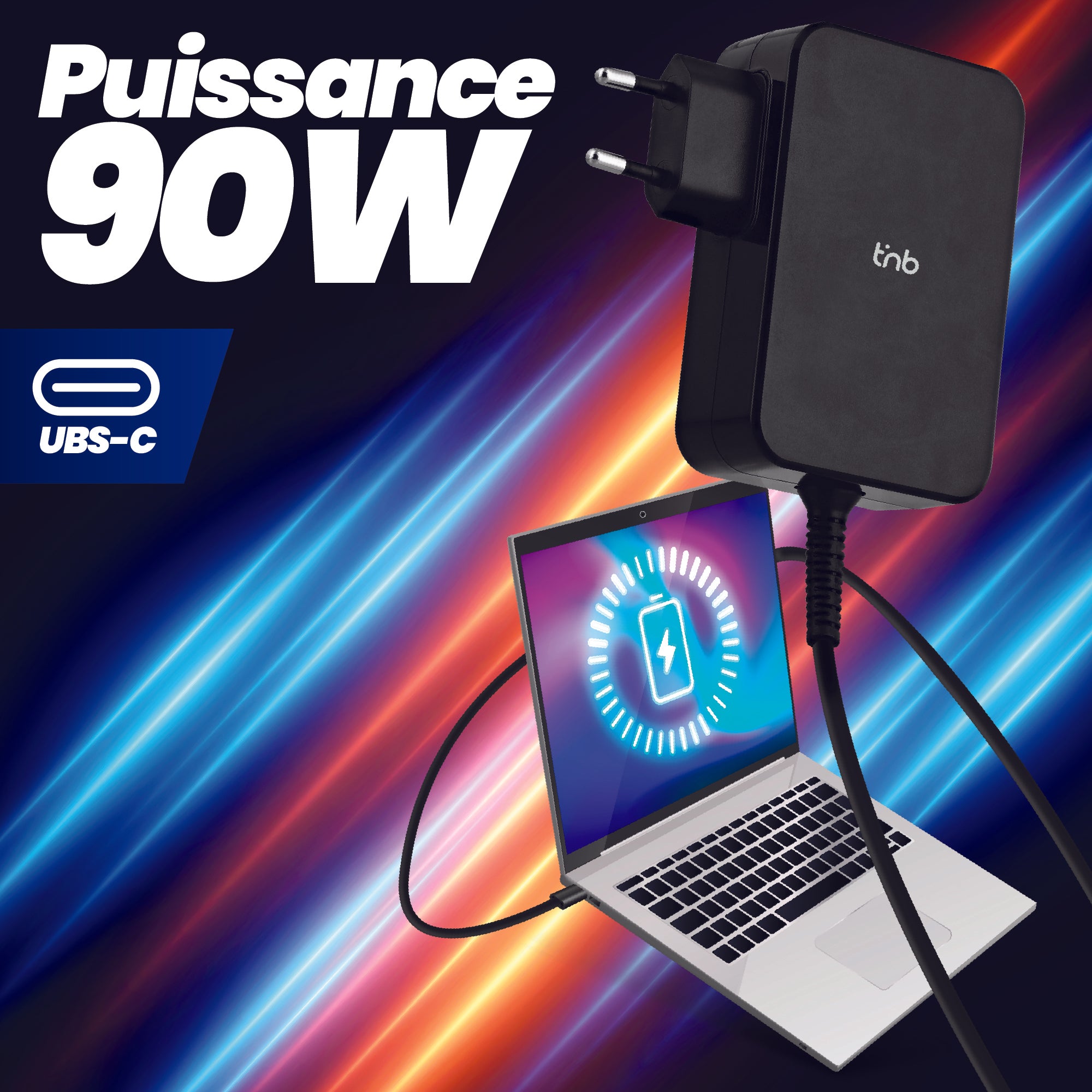 Chargeur USB-C 90W avec prise murale. Dimensions compactes pour l'emmener partout. Permet de recharger tous vos appareils, smartphones, tablettes, ordinateurs.