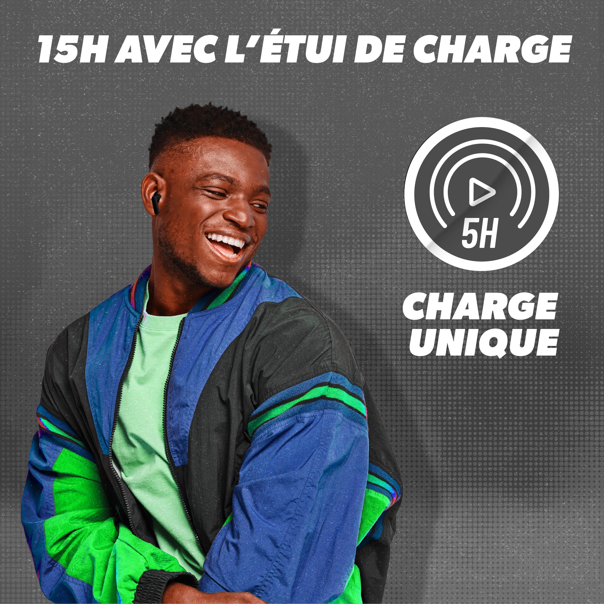 L'autonomie totale des écouteurs dépasse les 15 heures, avec 5 heures d'autonomie sur une seule charge.