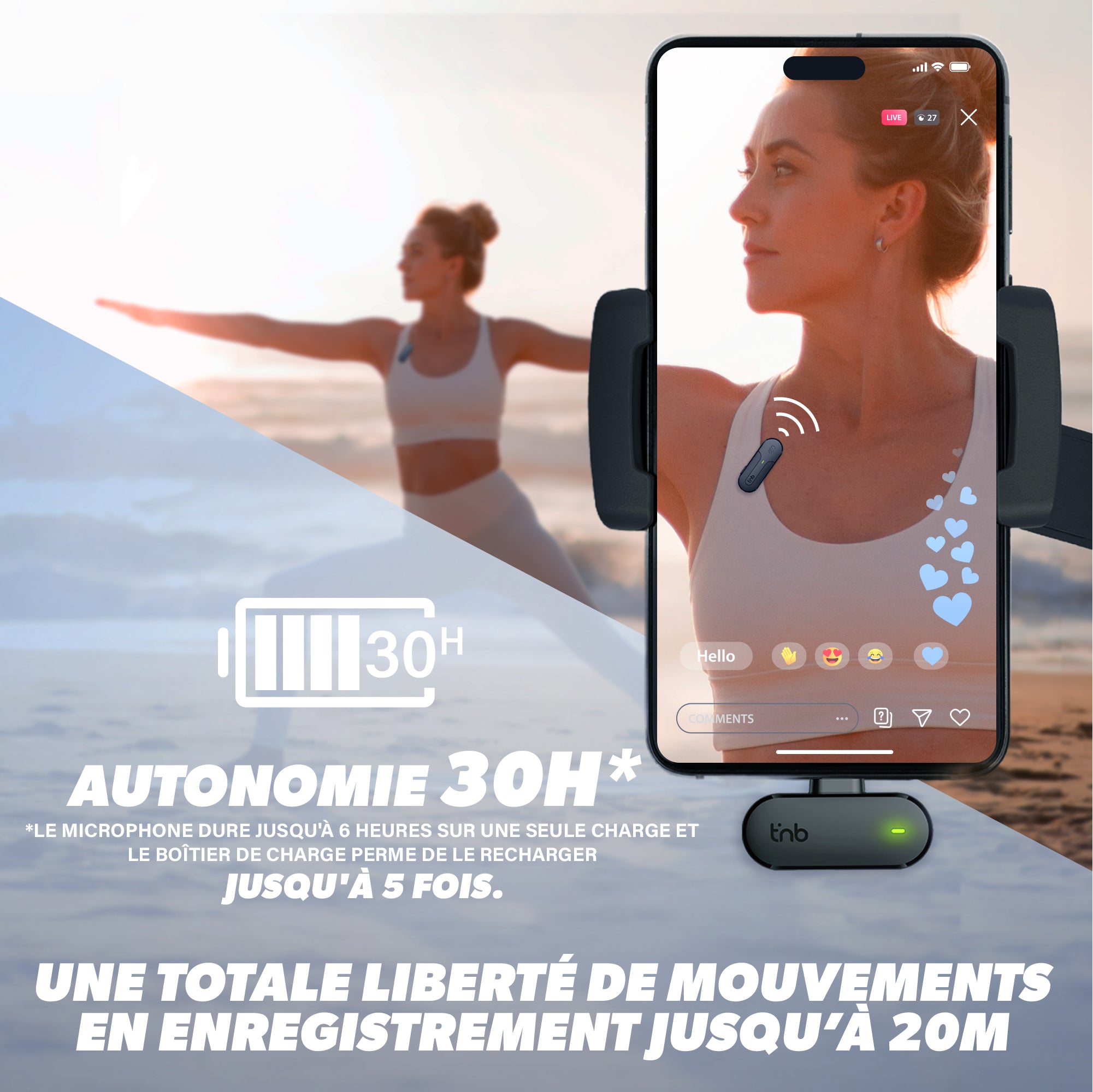 Grâce à la technologie omnidirectionnelle, le microphone capte les sons à 360° et retranscrit tout l'environnement sonore de manière plus précise. Équipé d'un boîtier de charge par contact pour les longues journées de tournage en extérieur jusqu'à 30H et un rangement pratique. Pochette de rangement incluse.
