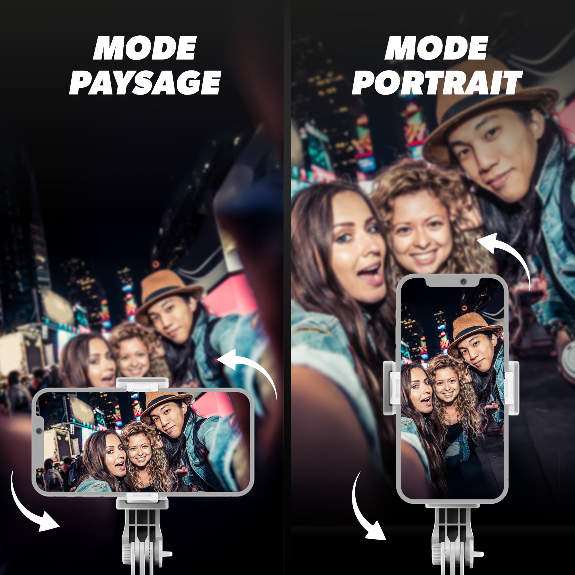 La mâchoire rotative à 360° offre la possibilité de prendre des photos en mode portrait ou paysage. Elle est compatible avec les smartphones Apple et Android d'une largeur maximale de 9 cm.