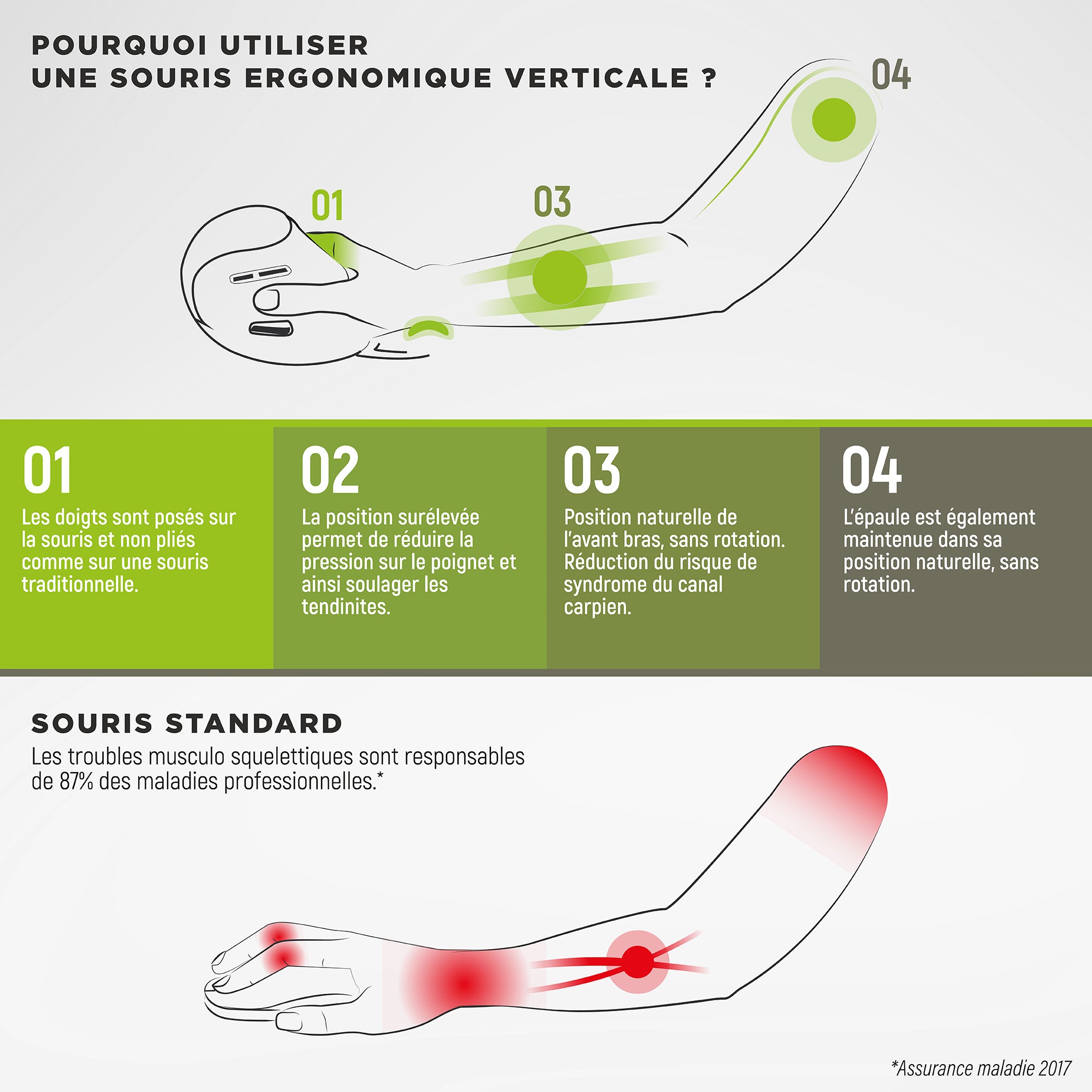 Cette souris verticale vous maintient l'avant-bras aligné dans une position naturelle et réduit ainsi la fatigue musculaire et les douleurs.