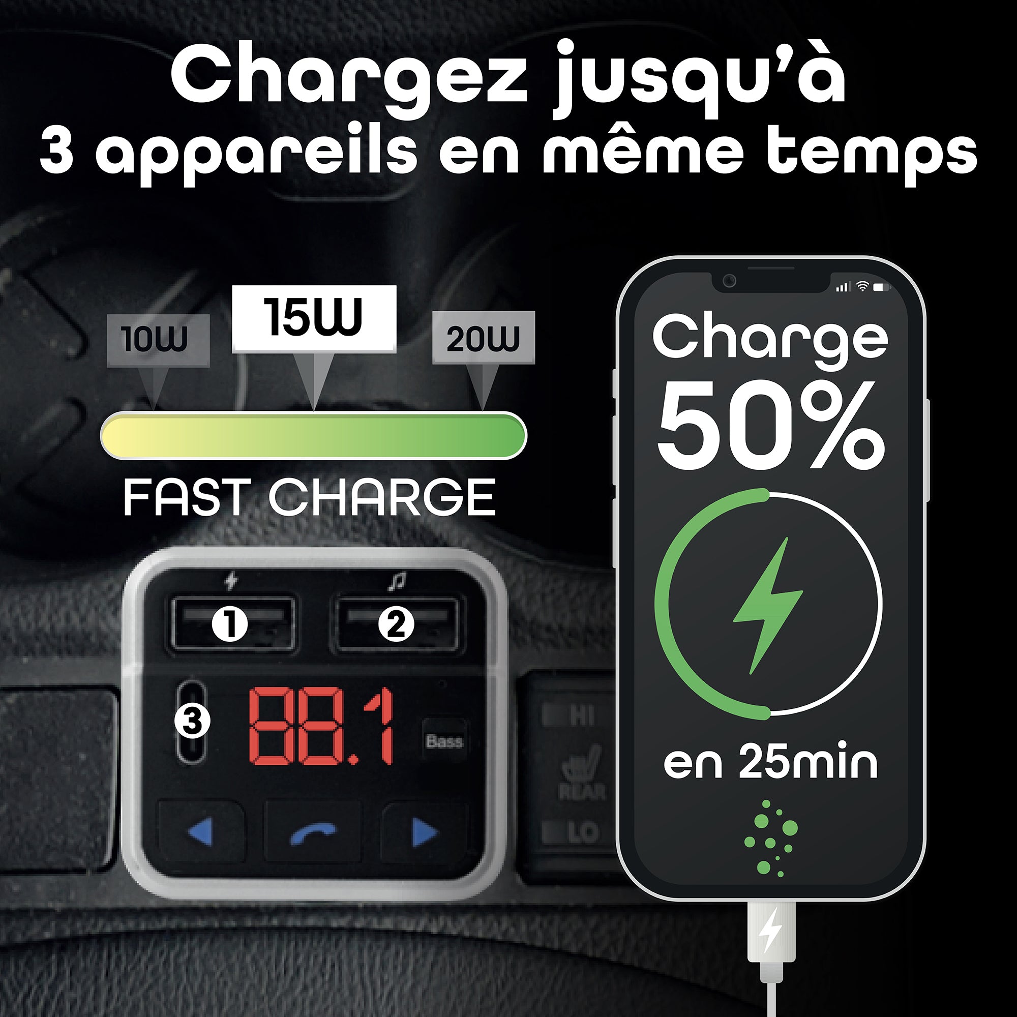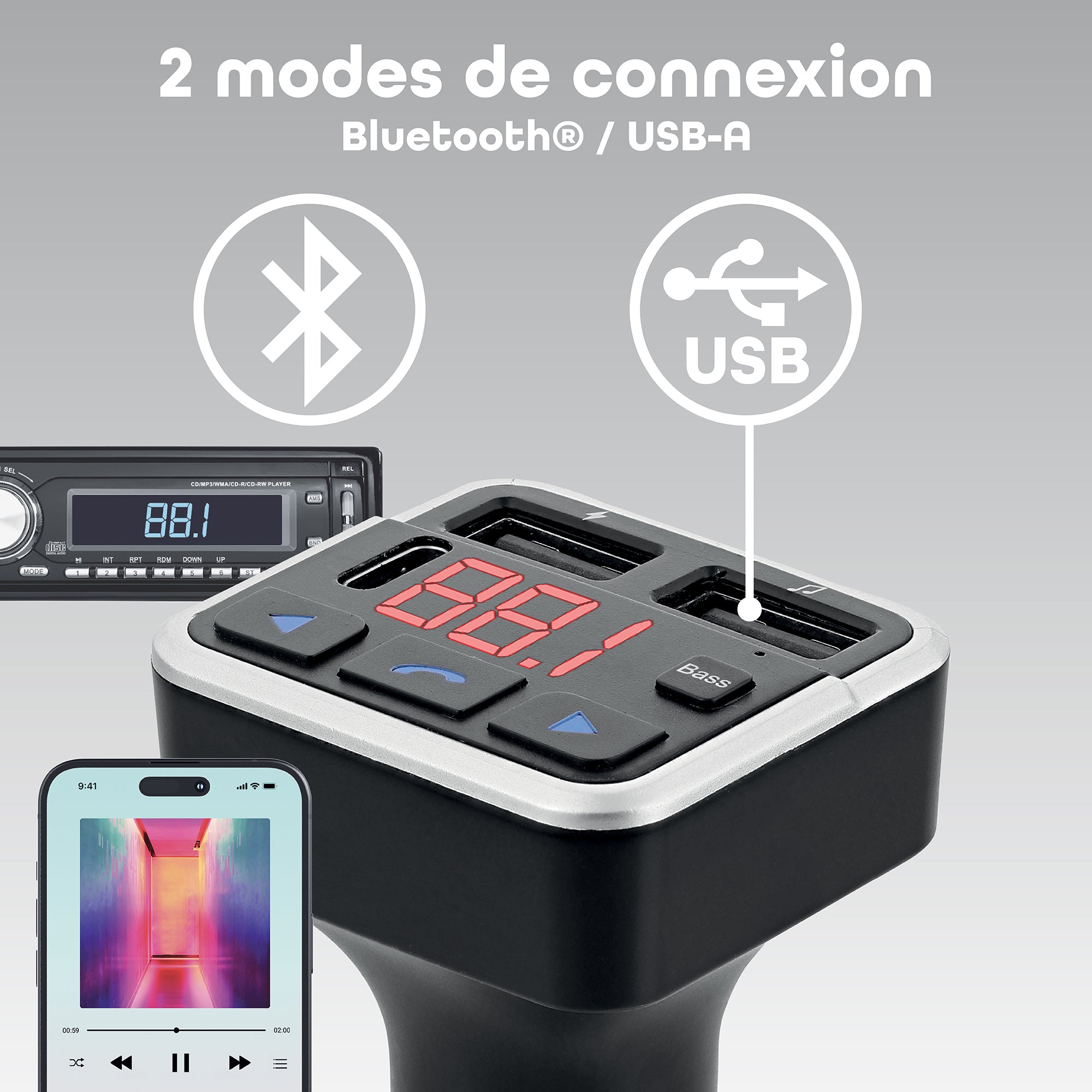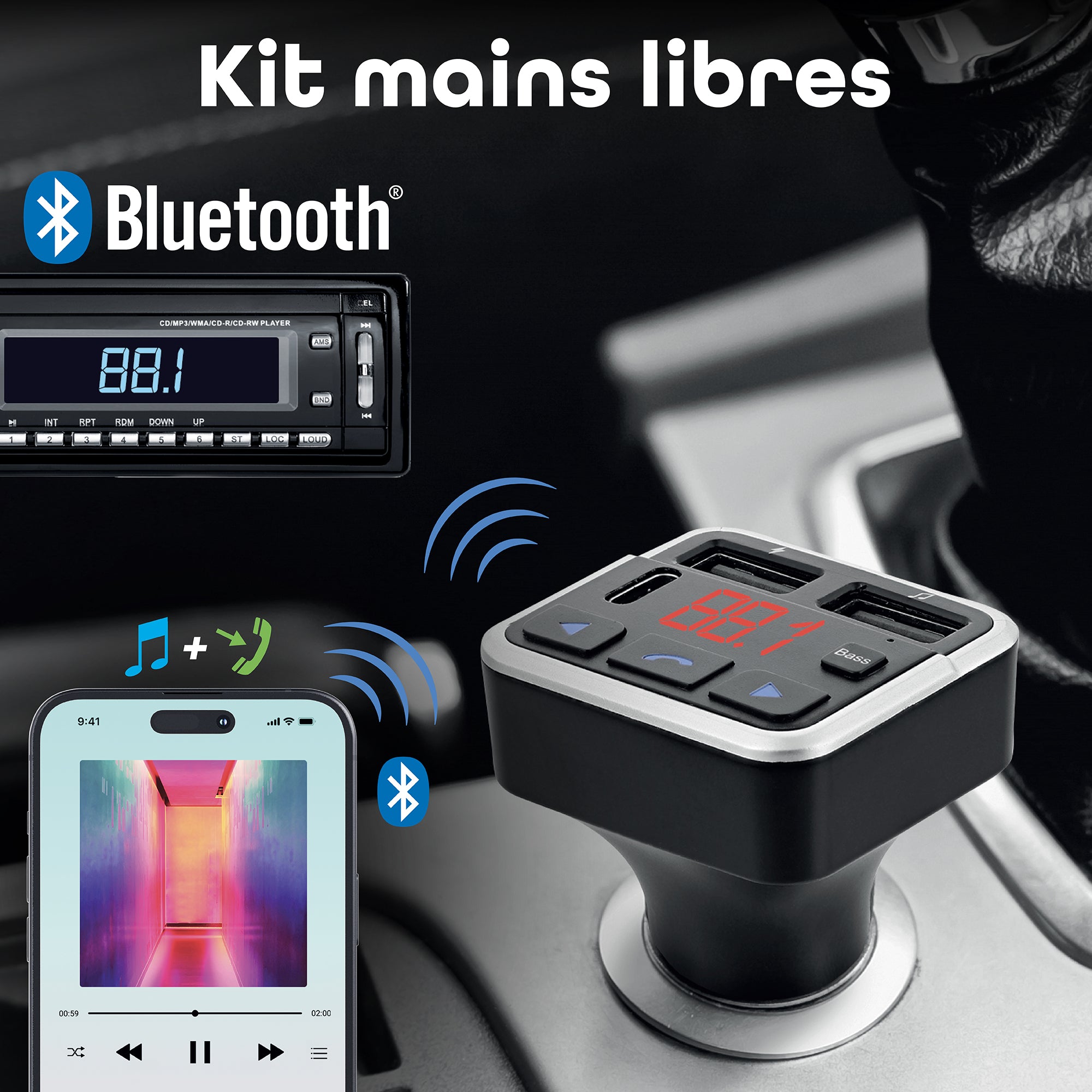 Ce transmetteur FM Bluetooth avec kit mains libres intégré est fait pour vous. Il permet en effet d'écouter votre musique et de profiter de vos appels directement sur les hauts parleurs de votre véhicule.